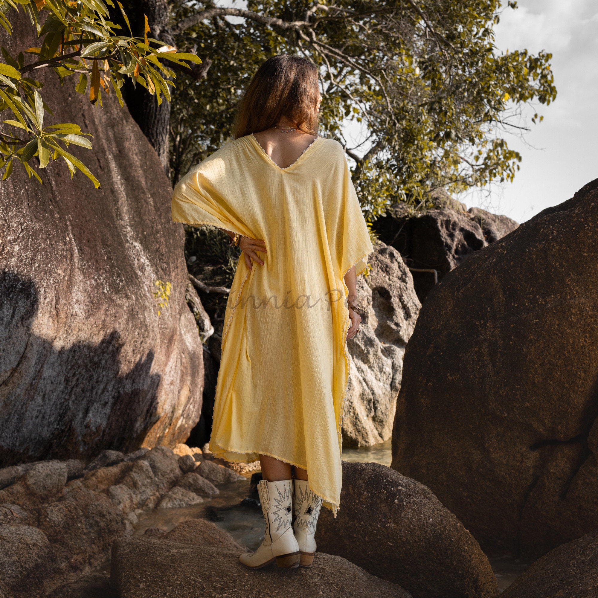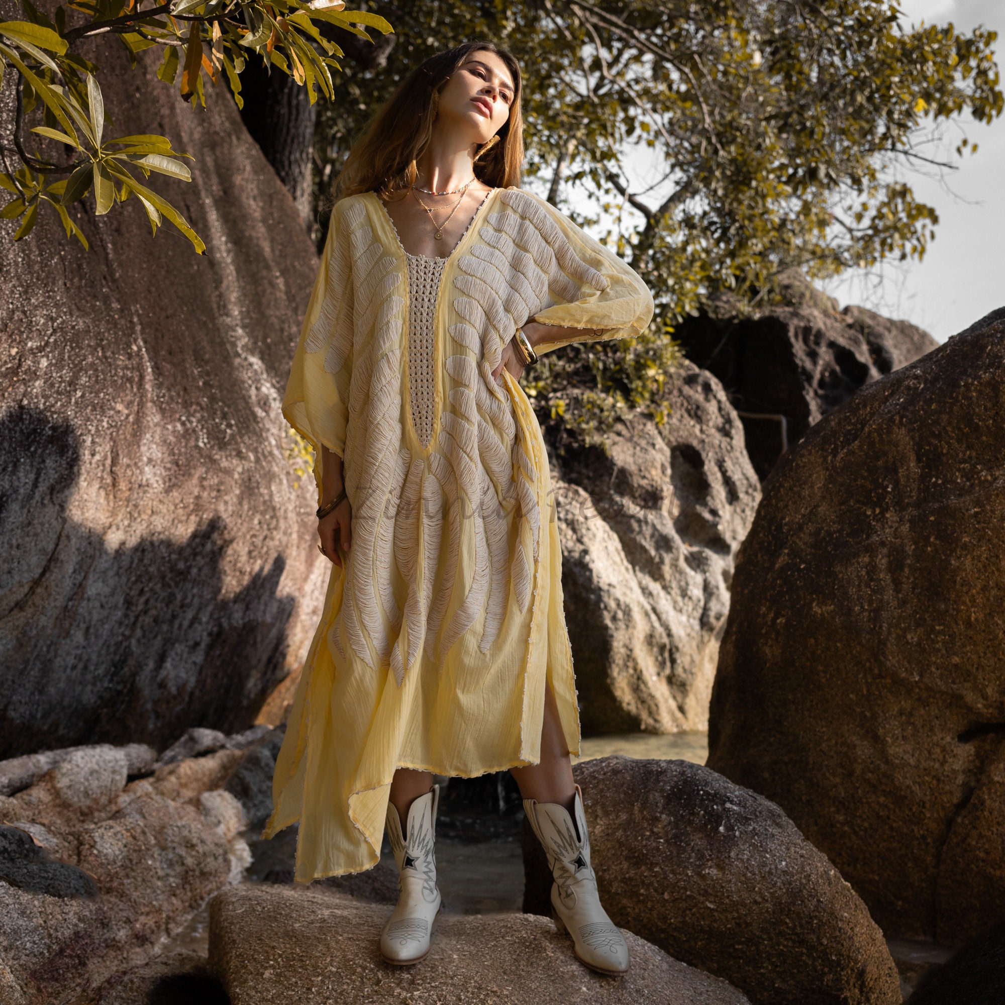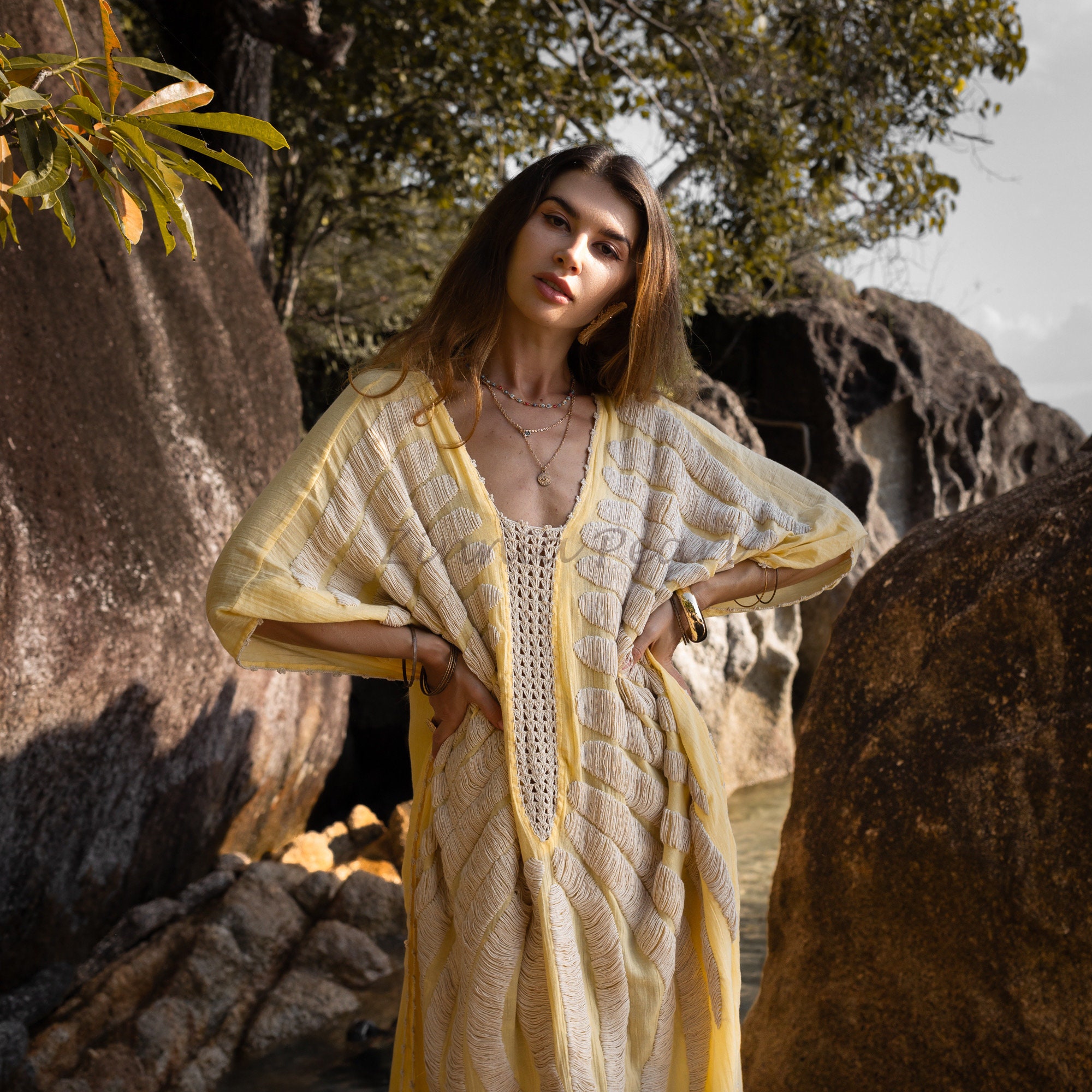 Handmade Embroidered Cotton Kaftan Dress: Beach Coverup Tunic – Oceano