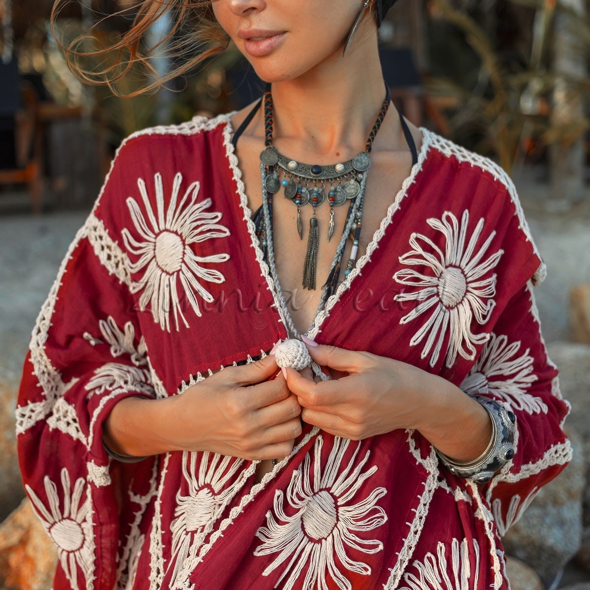 Handmade Floral Embroidered Crochet Cotton Kimono Duster | Flora Red Wine