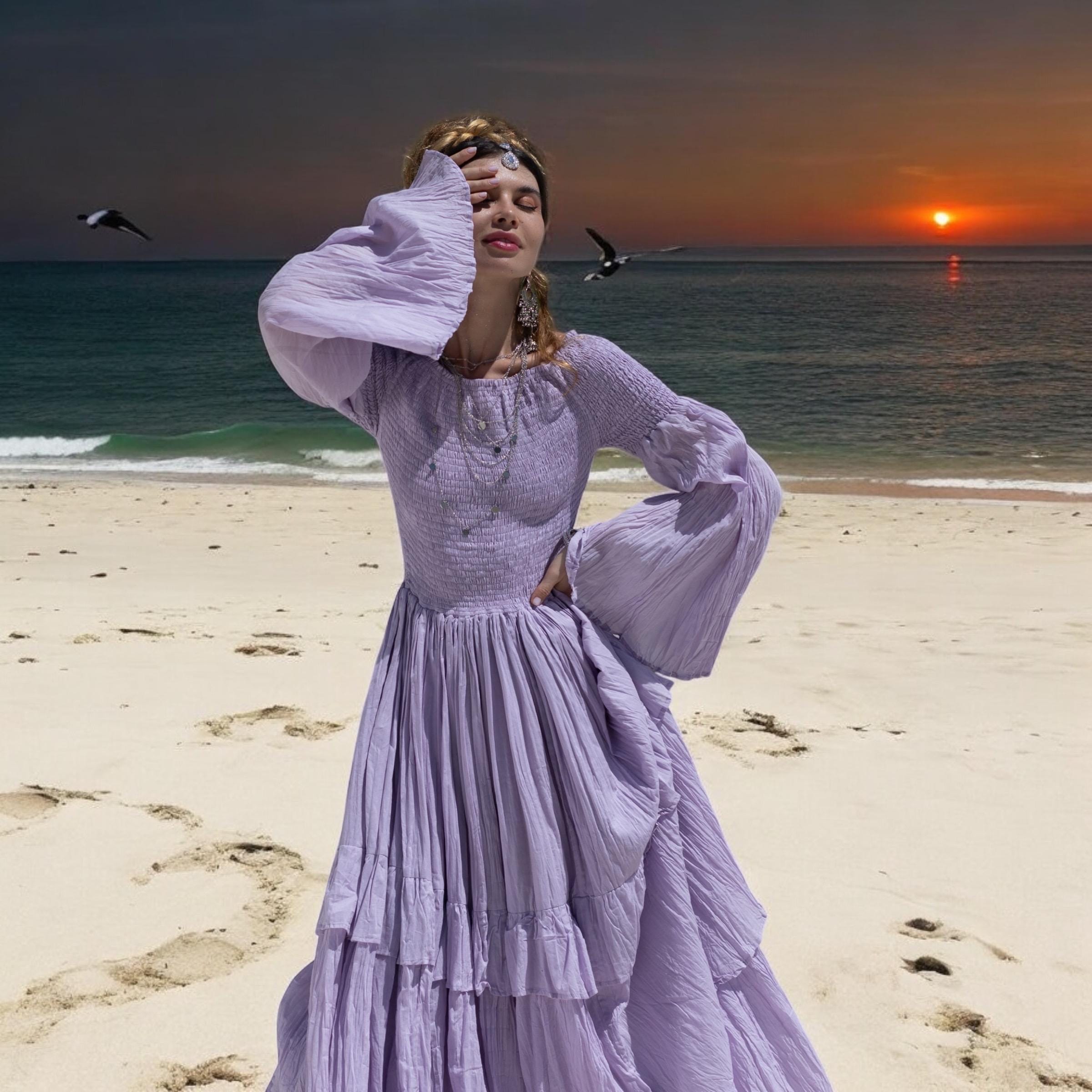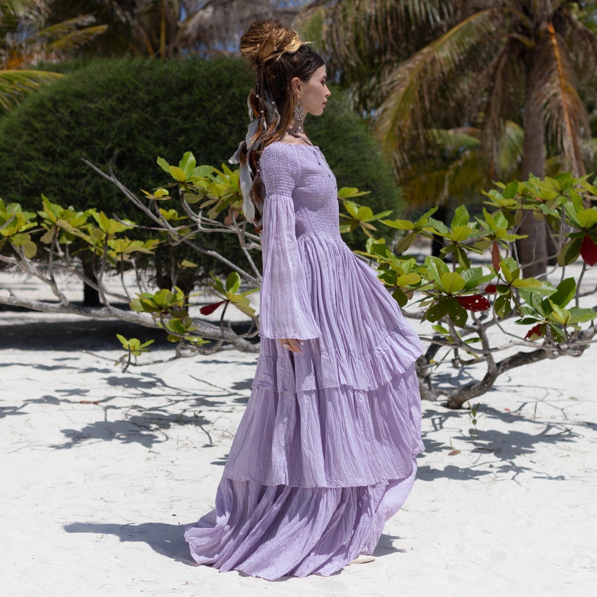 Step into romance with the Lavender Mist Milla Maxi Dress, a boho wedding gown blending vintage charm with effortless grace. Perfect for weddings, engagements, festivals, and romantic celebrations.