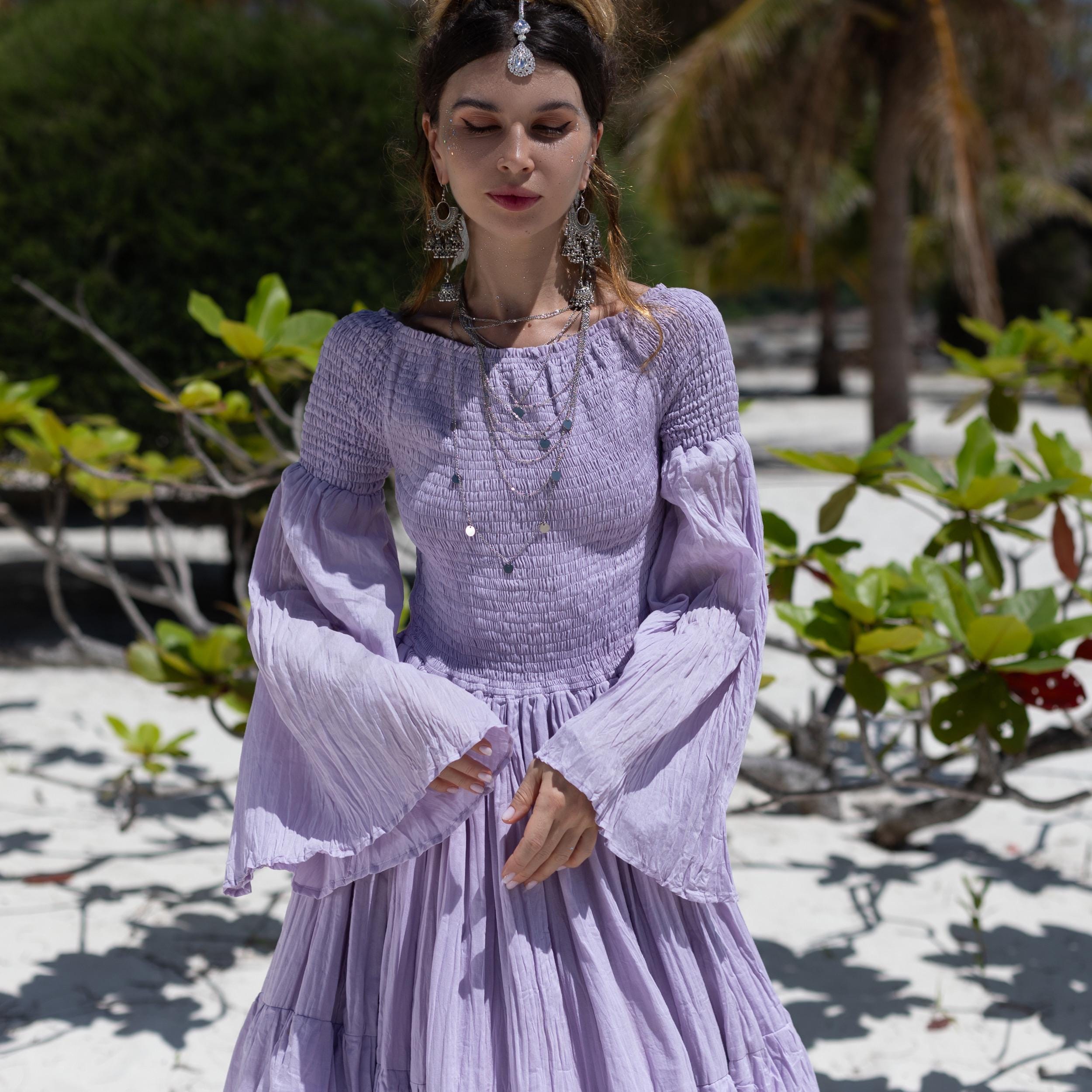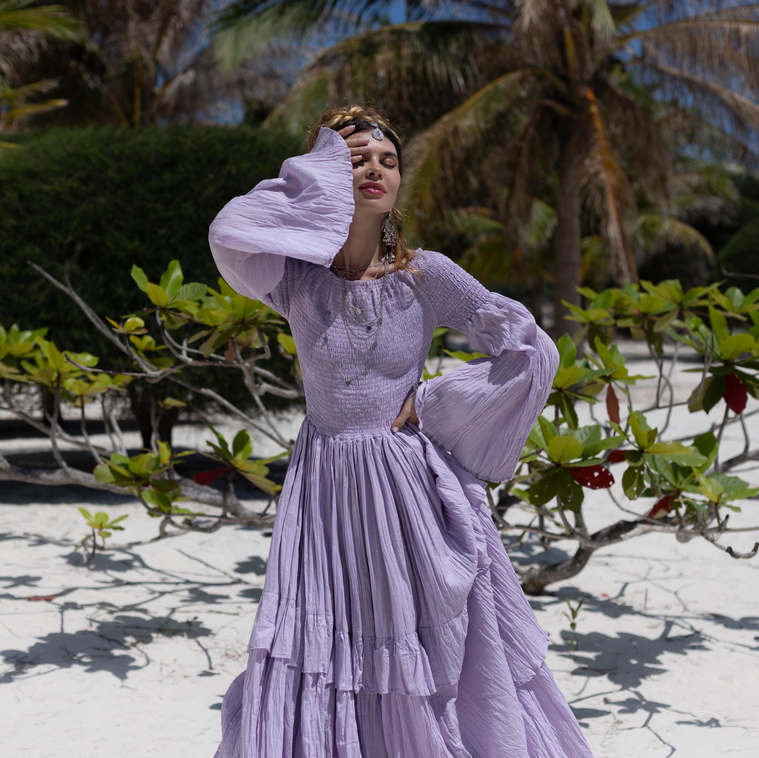 Handmade Lavender Boho Wedding Dress: Smocked Cotton Cottagecore Gown – Mila