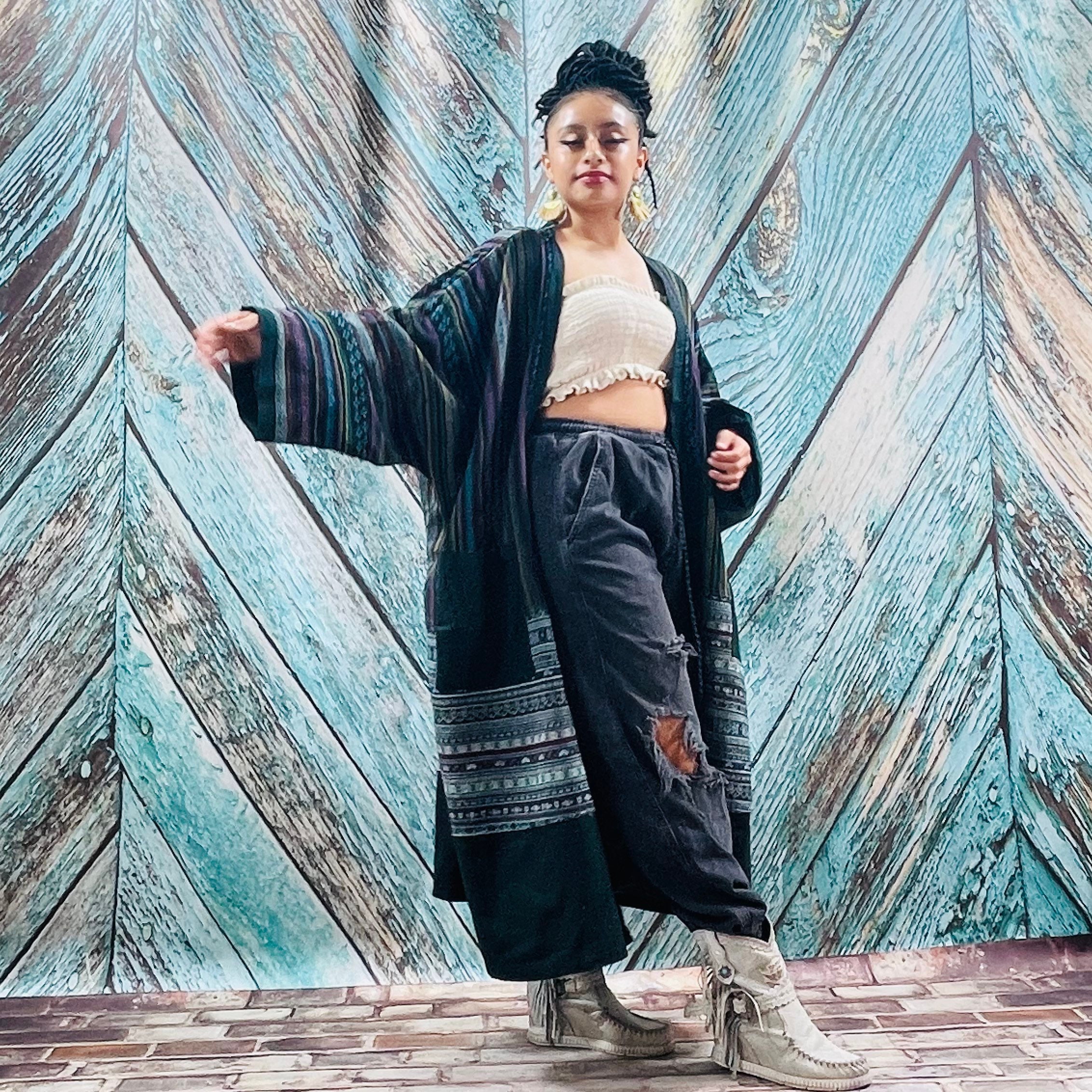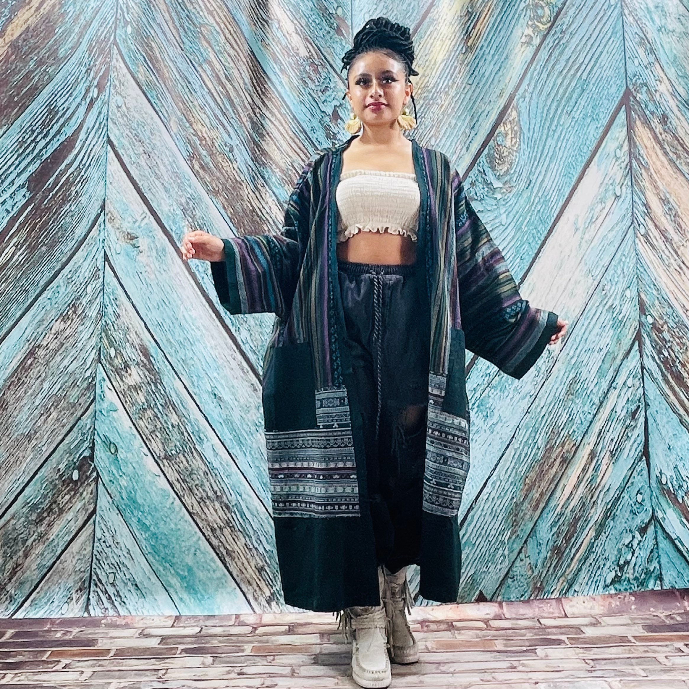 Details: beautiful weave styled maxi kimono, vintage inspired, handcrafted together with contrast patterns and designs.
