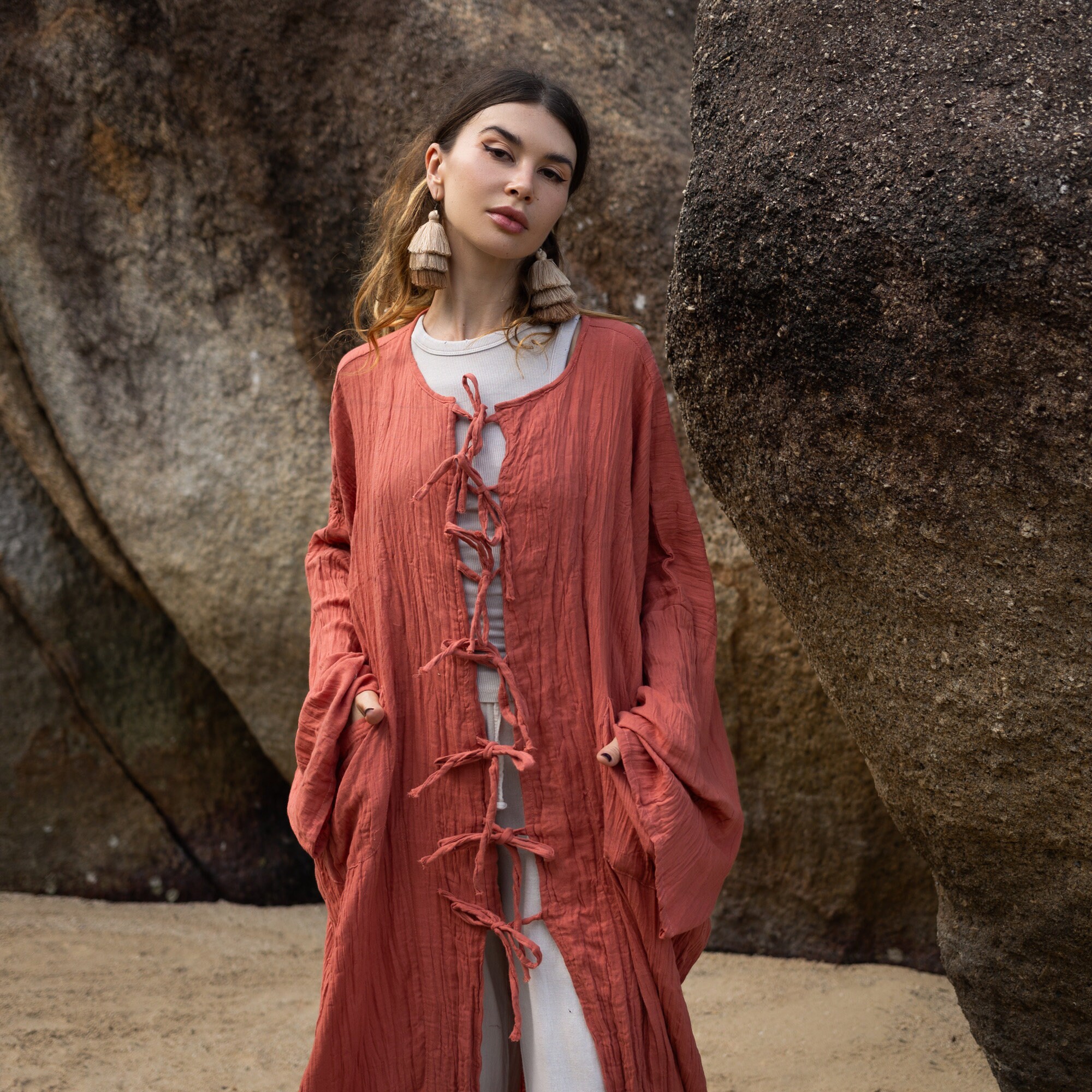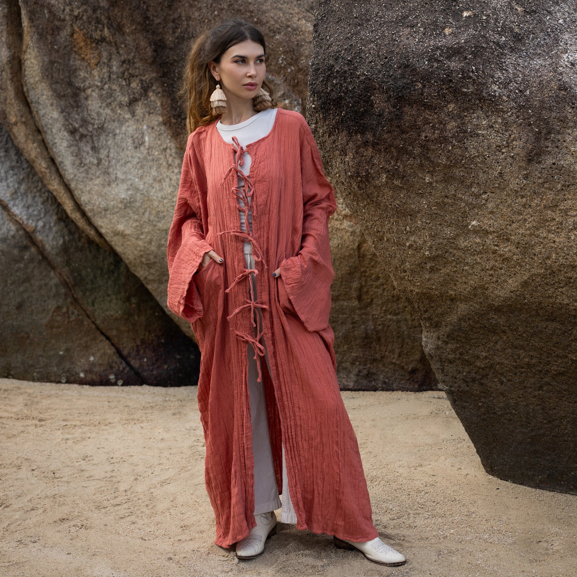 Don't miss out on this versatile and fashionable kimono. It's time to elevate your style with our drapey, longline silhouette Aimi kimono, complete with front ties closure, wide sleeves, and convenient front pockets. Get yours today!