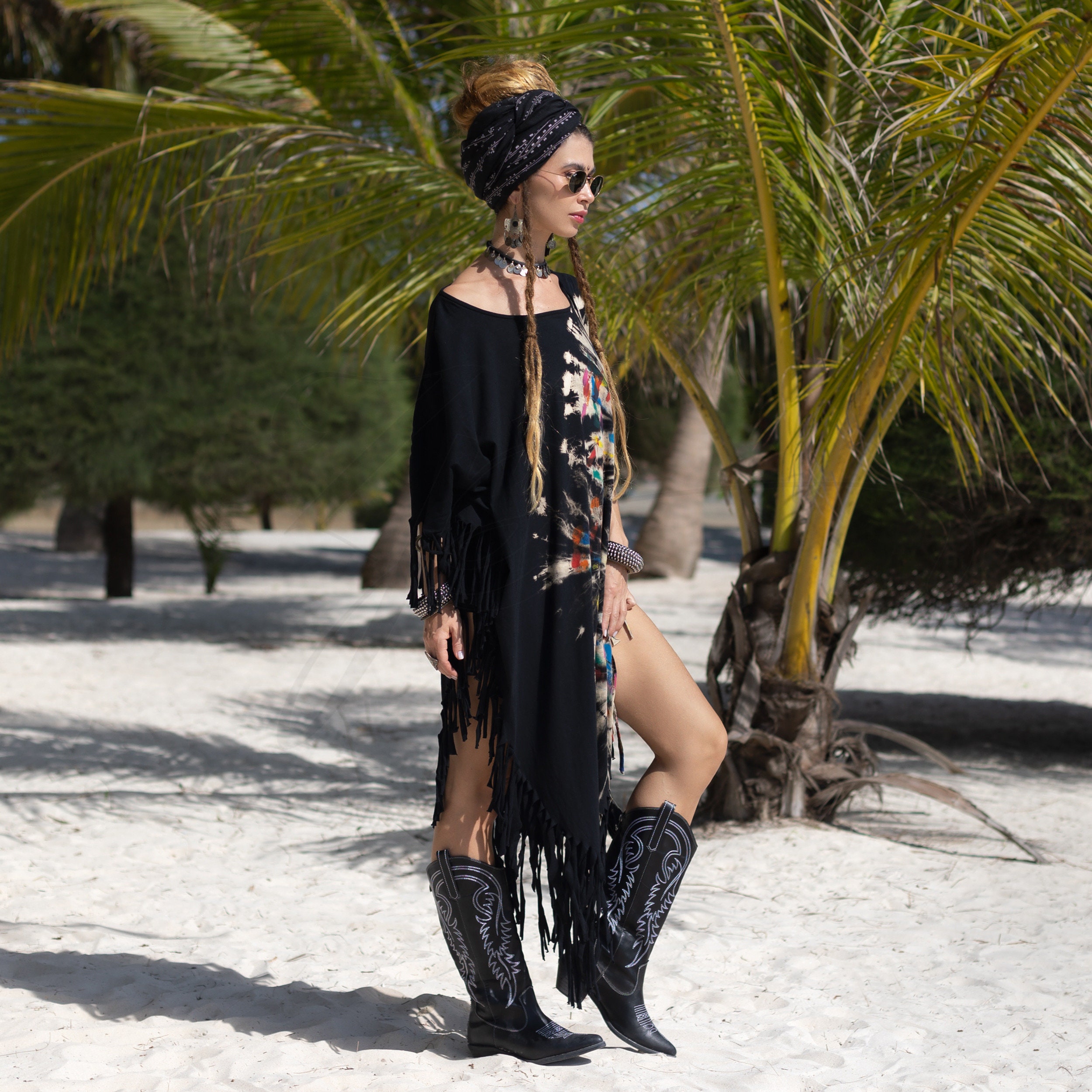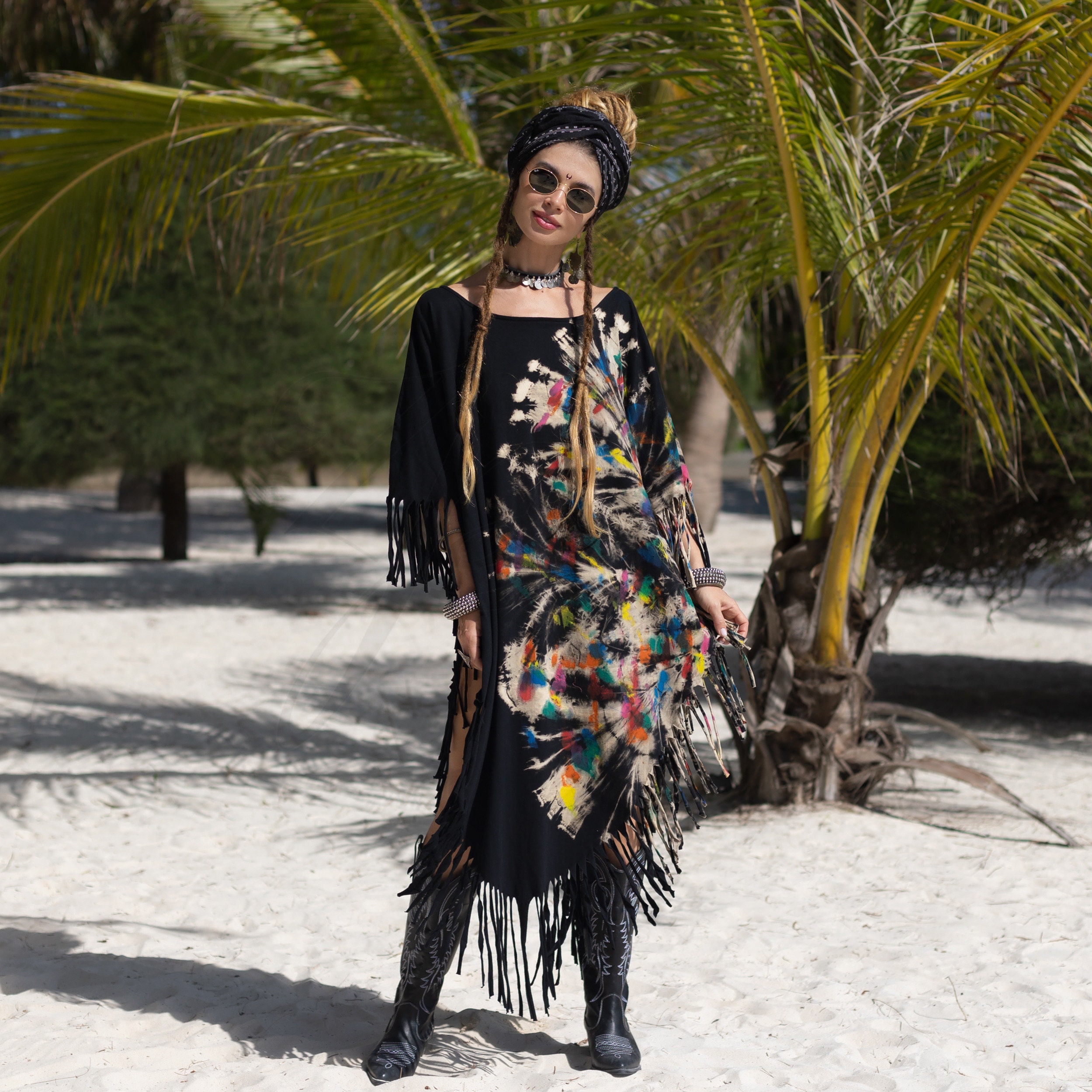 Handmade Tie-Dye Fringe Dress – Boho Chic Festival Poncho, Plus Size Flowy Tunic, Hippie Beach Cover-Up, Gift for Her – Arlo Monstera Noir