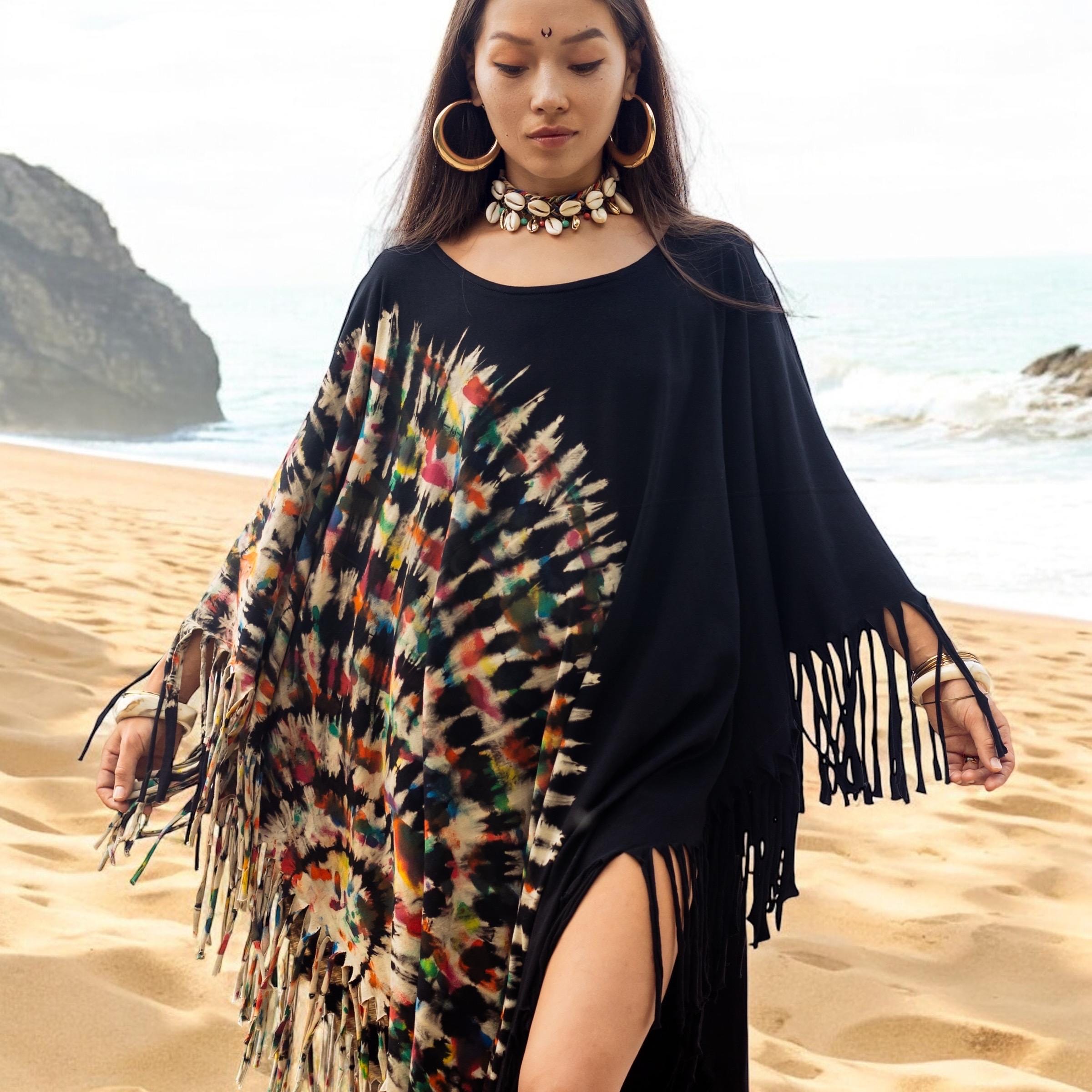 Crafted from soft jersey cotton, Arlo flows in a relaxed pullover fit with deep side slits, fringe detailing, and a bold cosmic burst design. Wear it as a beach cover-up, festival poncho, or everyday statement tunic — it moves with you, wherever your magic takes you.