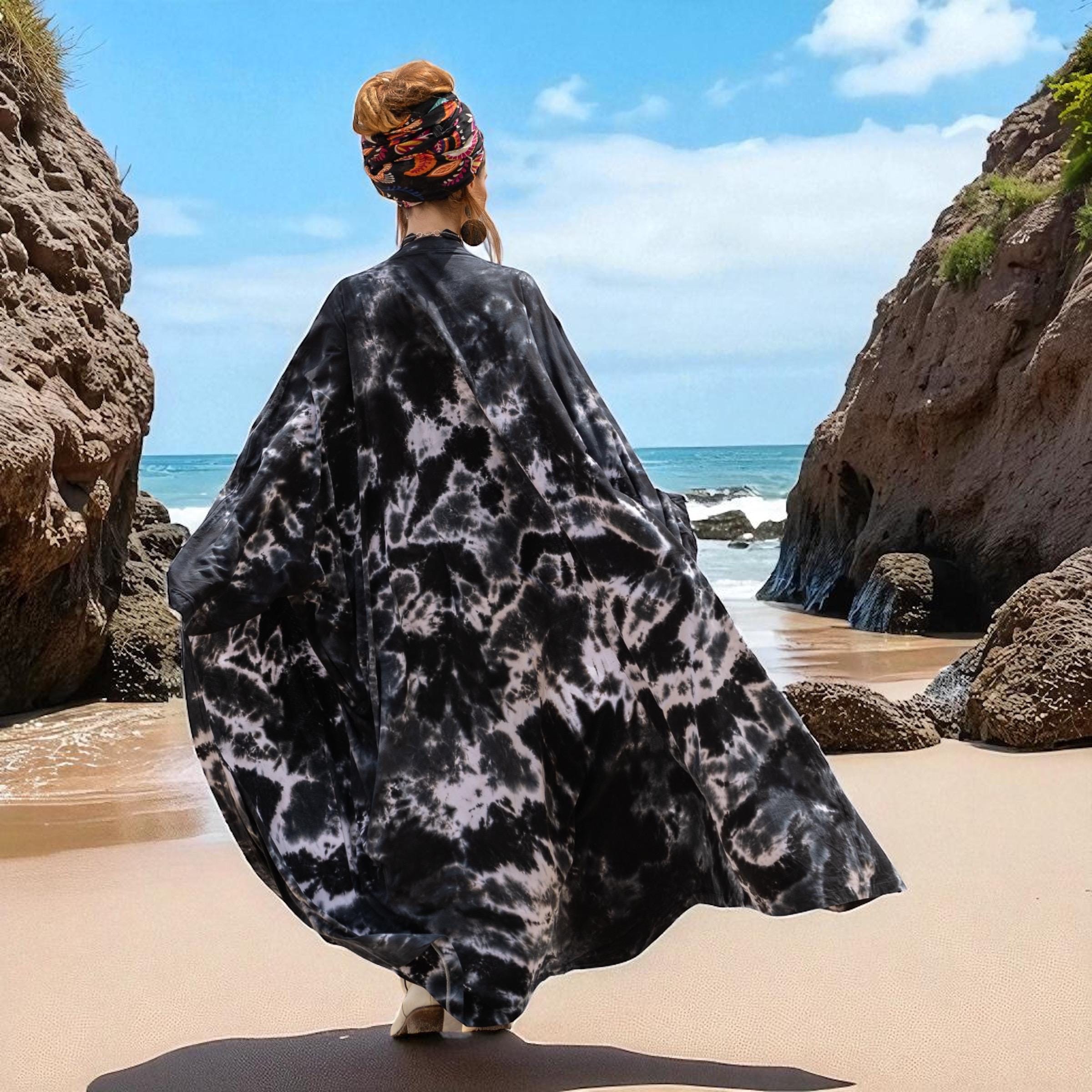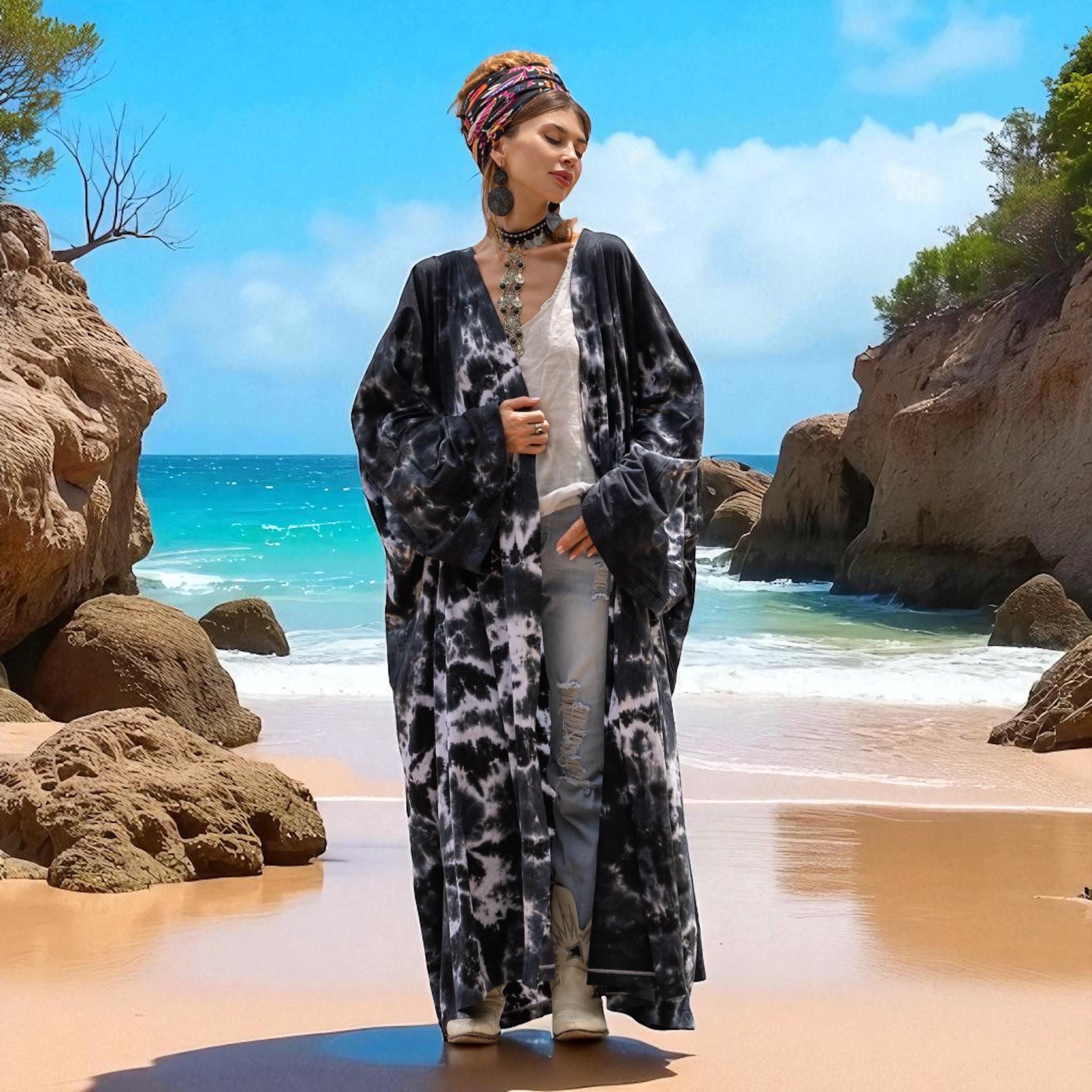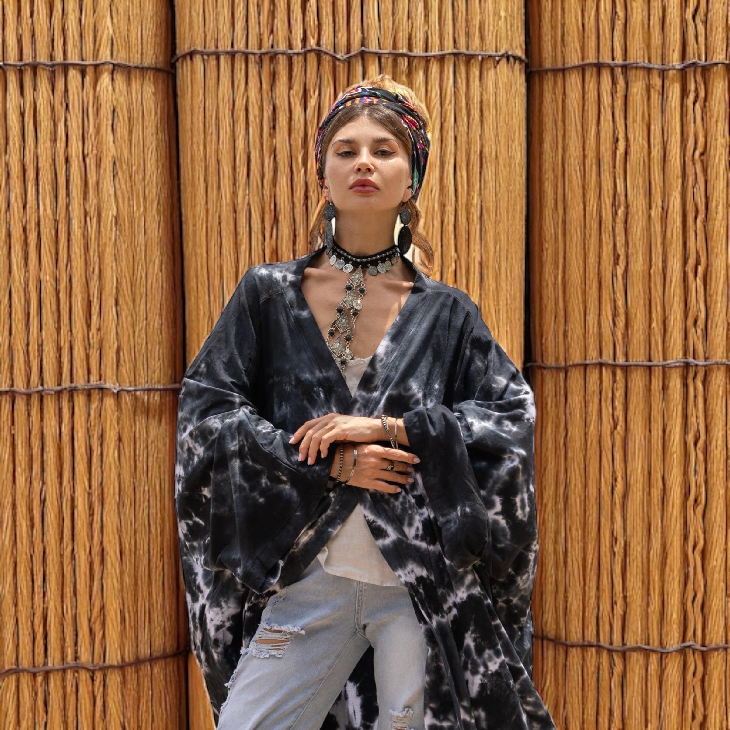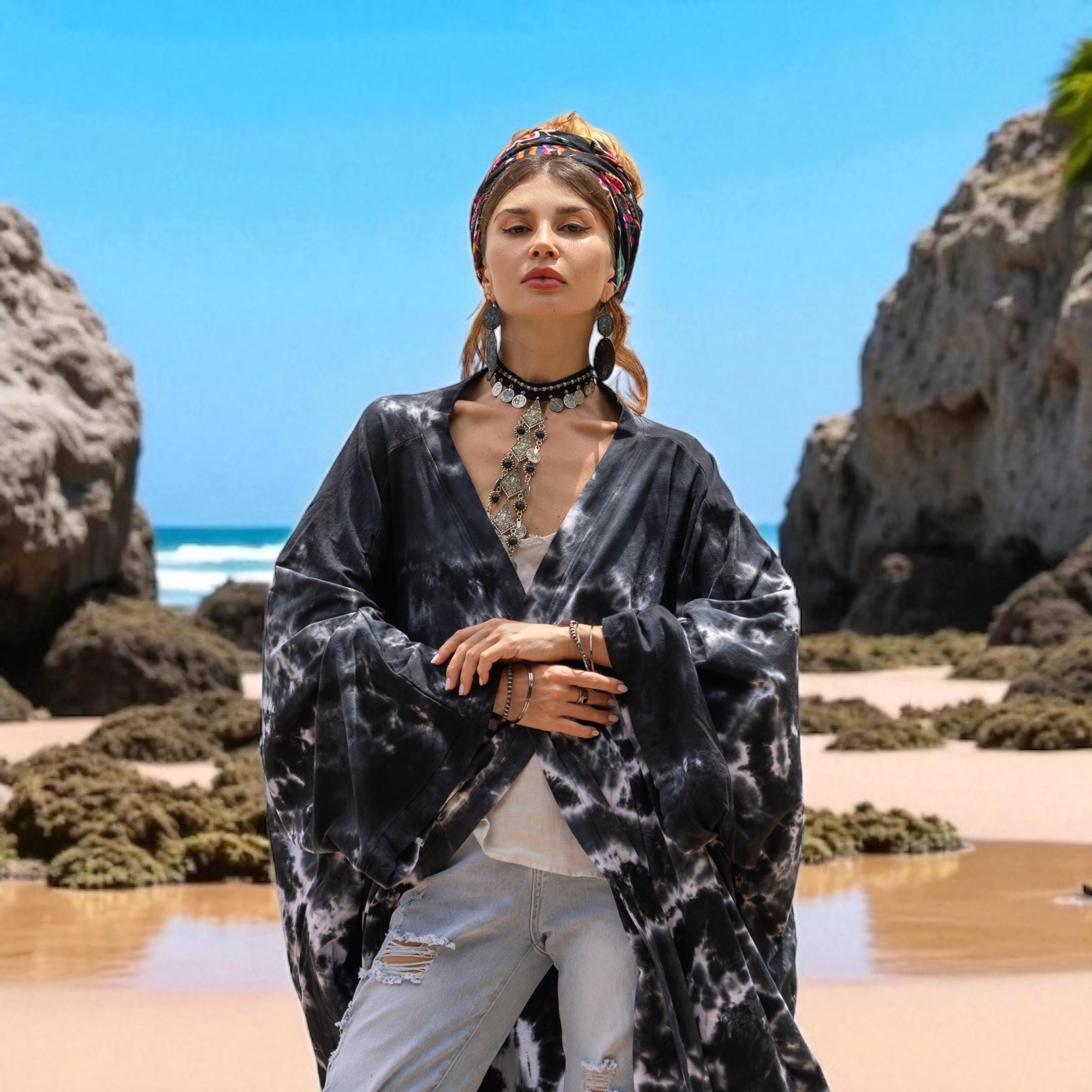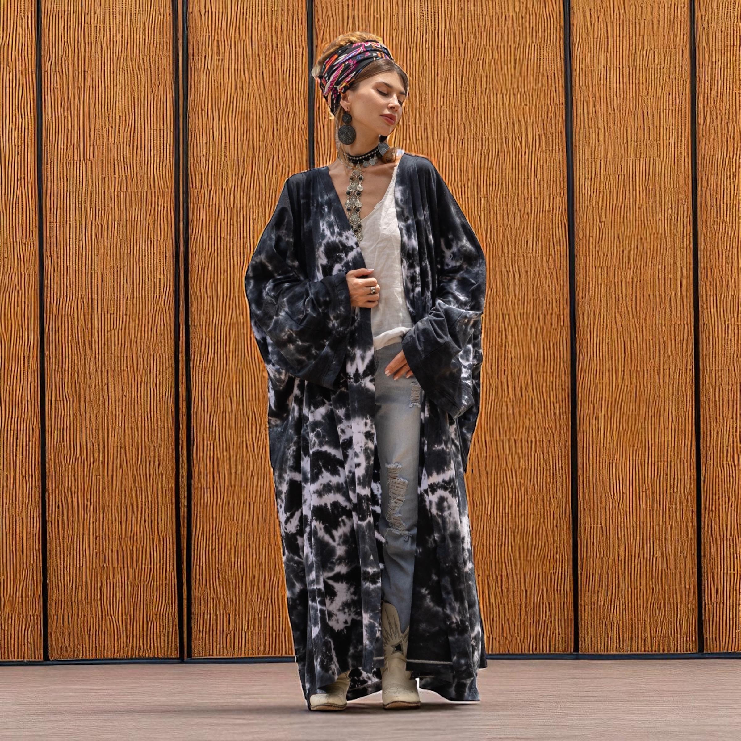Step into lunar elegance with the Aurora Tie-Dye Kimono Robe in Lunar Smoke — a hand-dyed treasure swirling with inky black, silver ash, and moonlit white. This flowing oversized duster evokes the night sky after an eclipse, wrapping you in mystery, movement, and soulful style.
