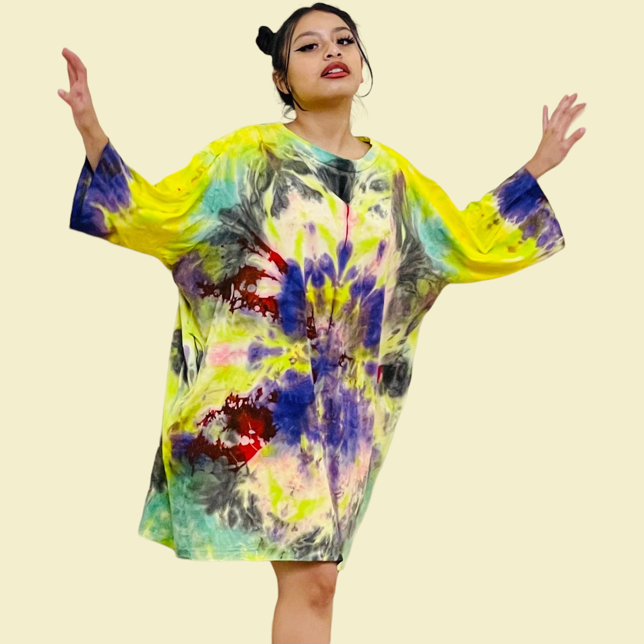 Step into free-spirited style with the Electric Wave Tie-Dye Tunic Dress, a flowy, oversized caftan designed for comfort and creativity. Hand-dyed in vivid, swirling electric hues, this plus-size-friendly tunic is perfect for festivals, casual layering, or making a bold statement wherever you go.
