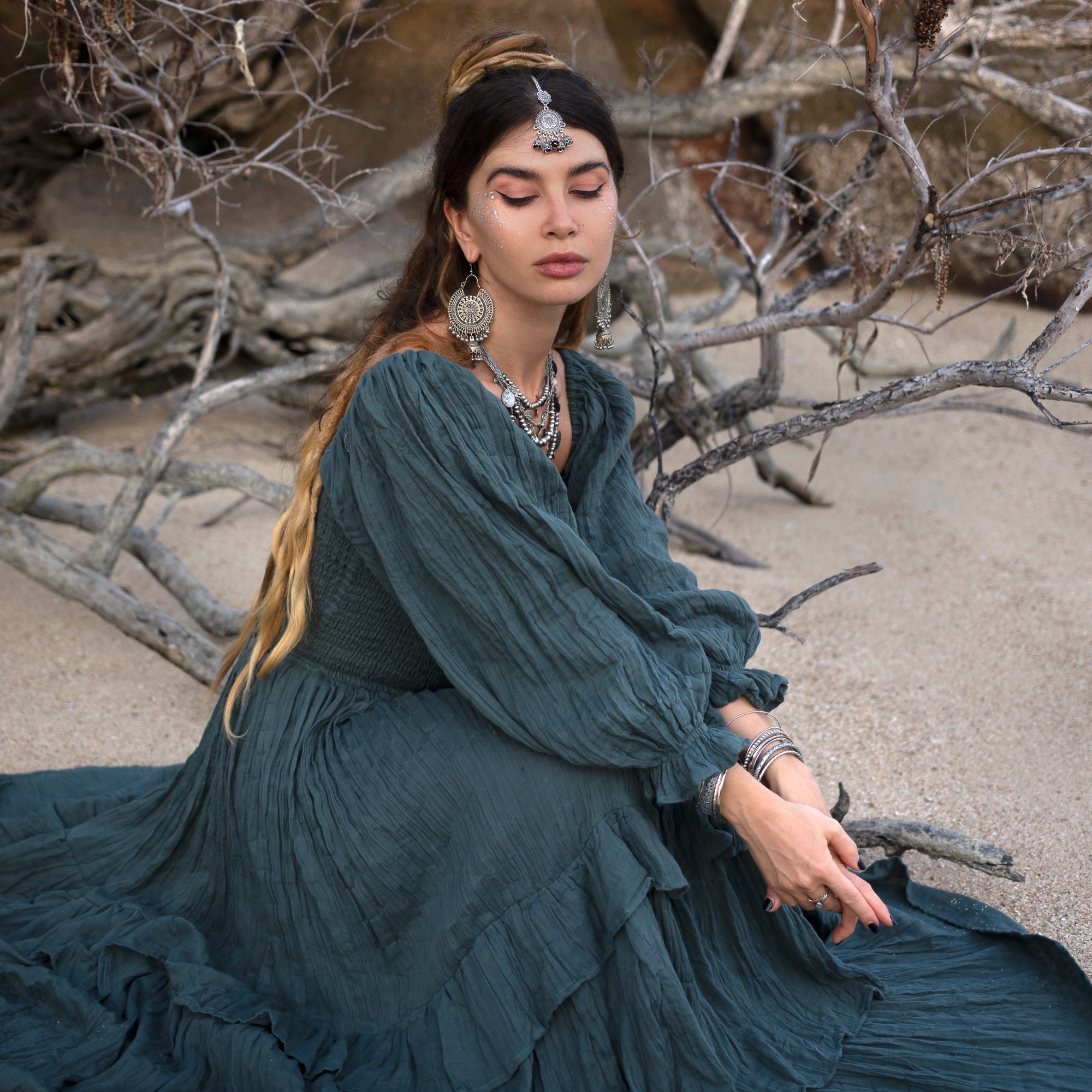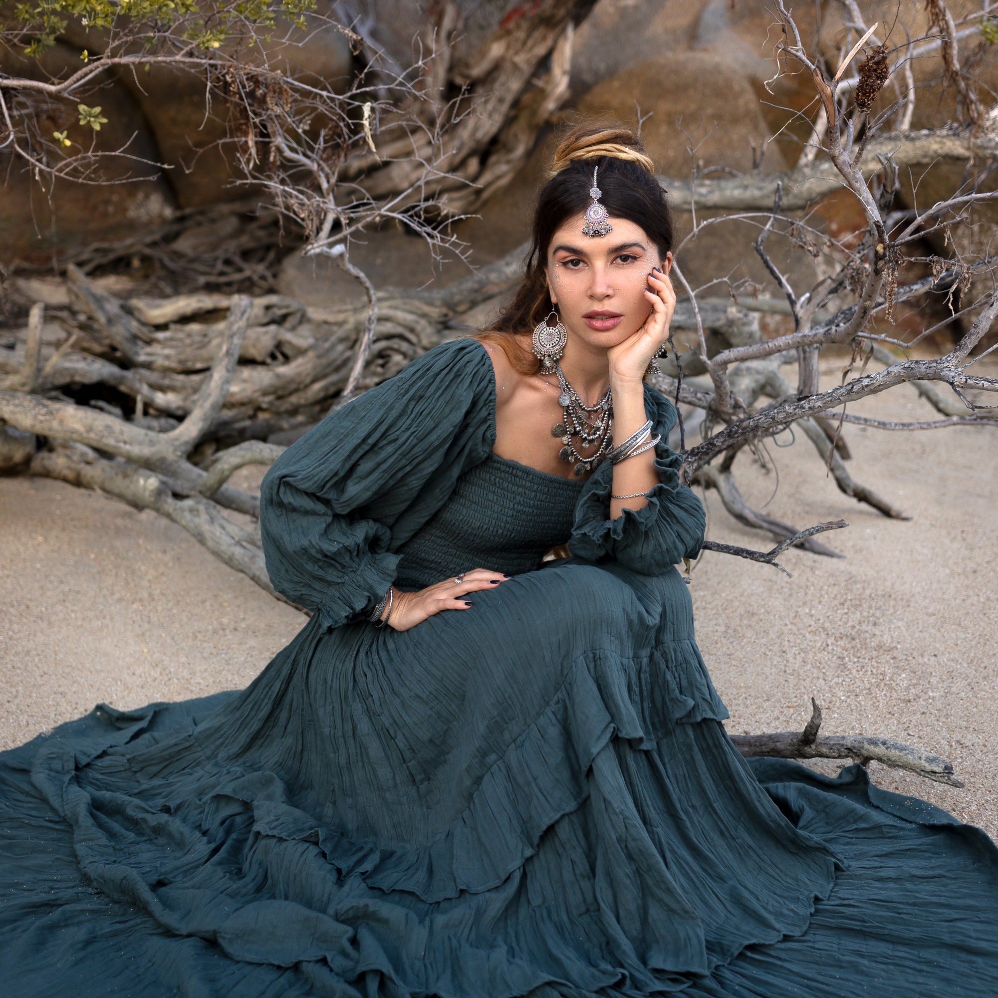 Isabella Amore Boho Wedding Dress: Tiered Cotton Gown, Woodland Jade