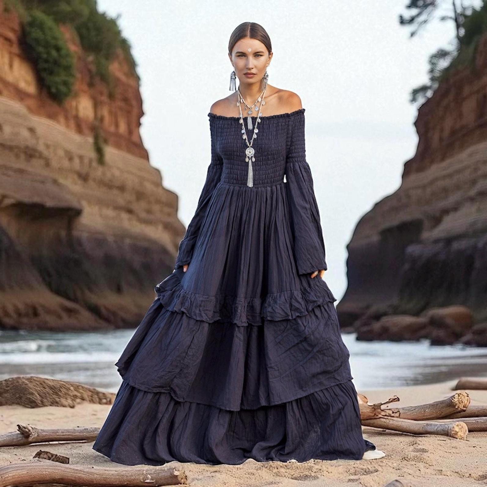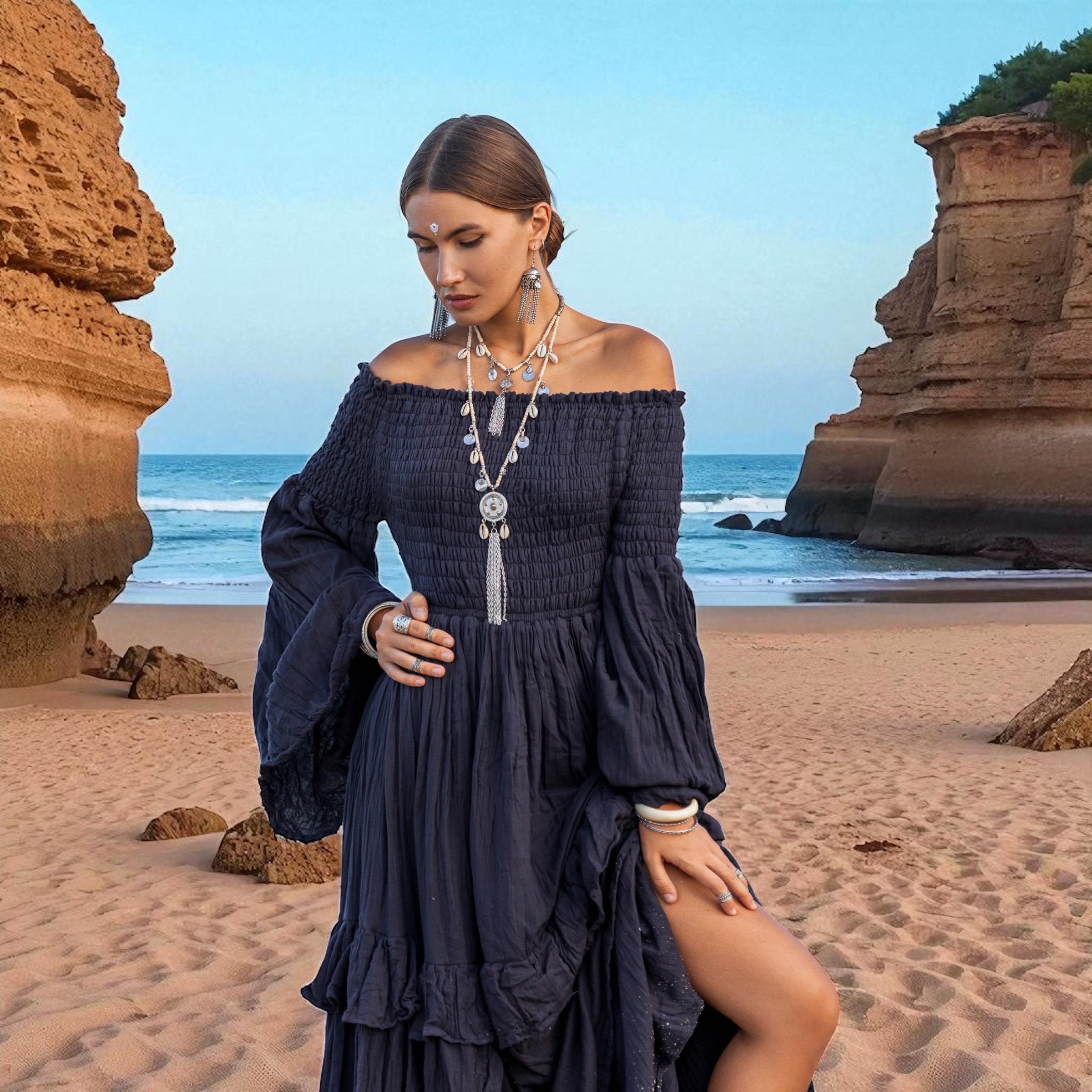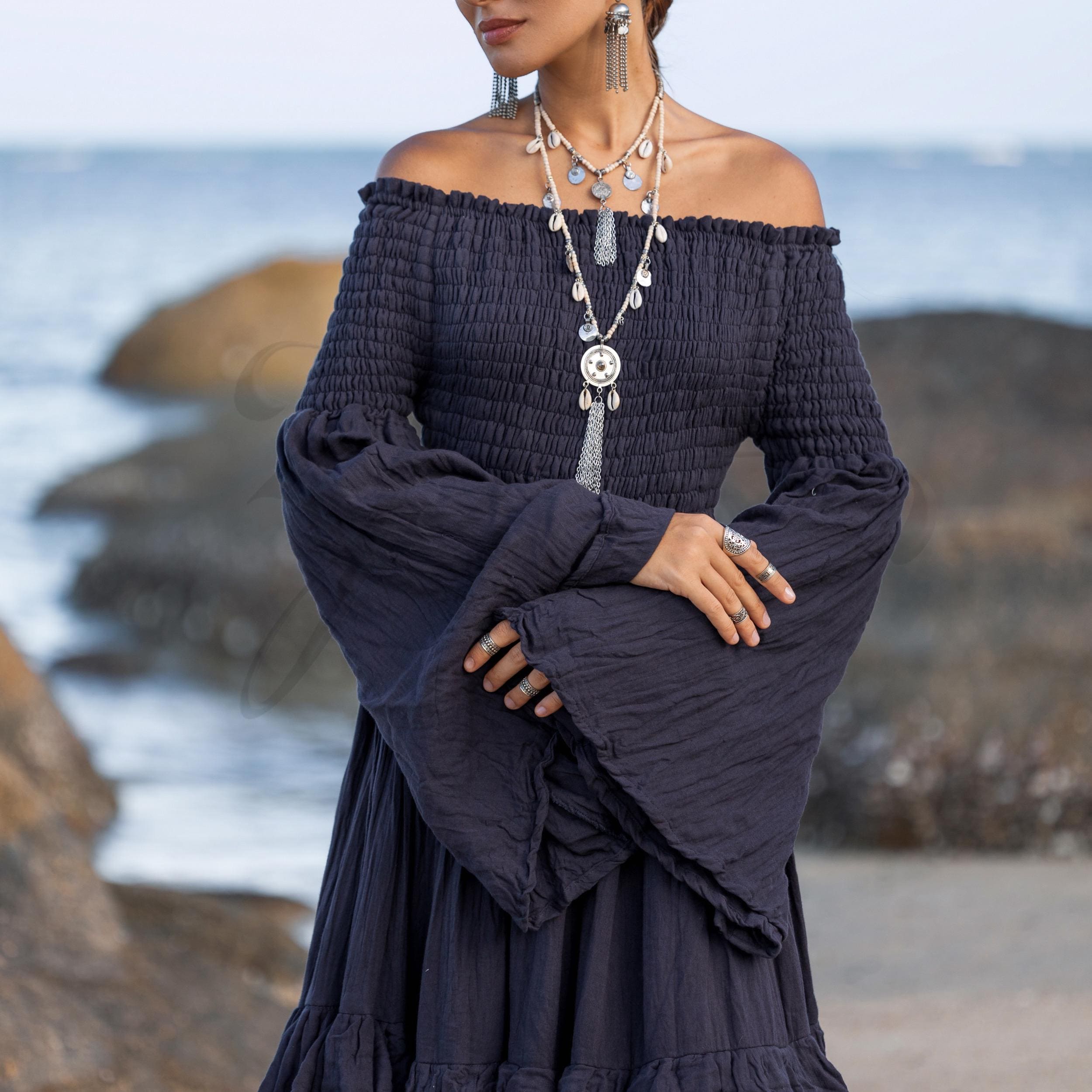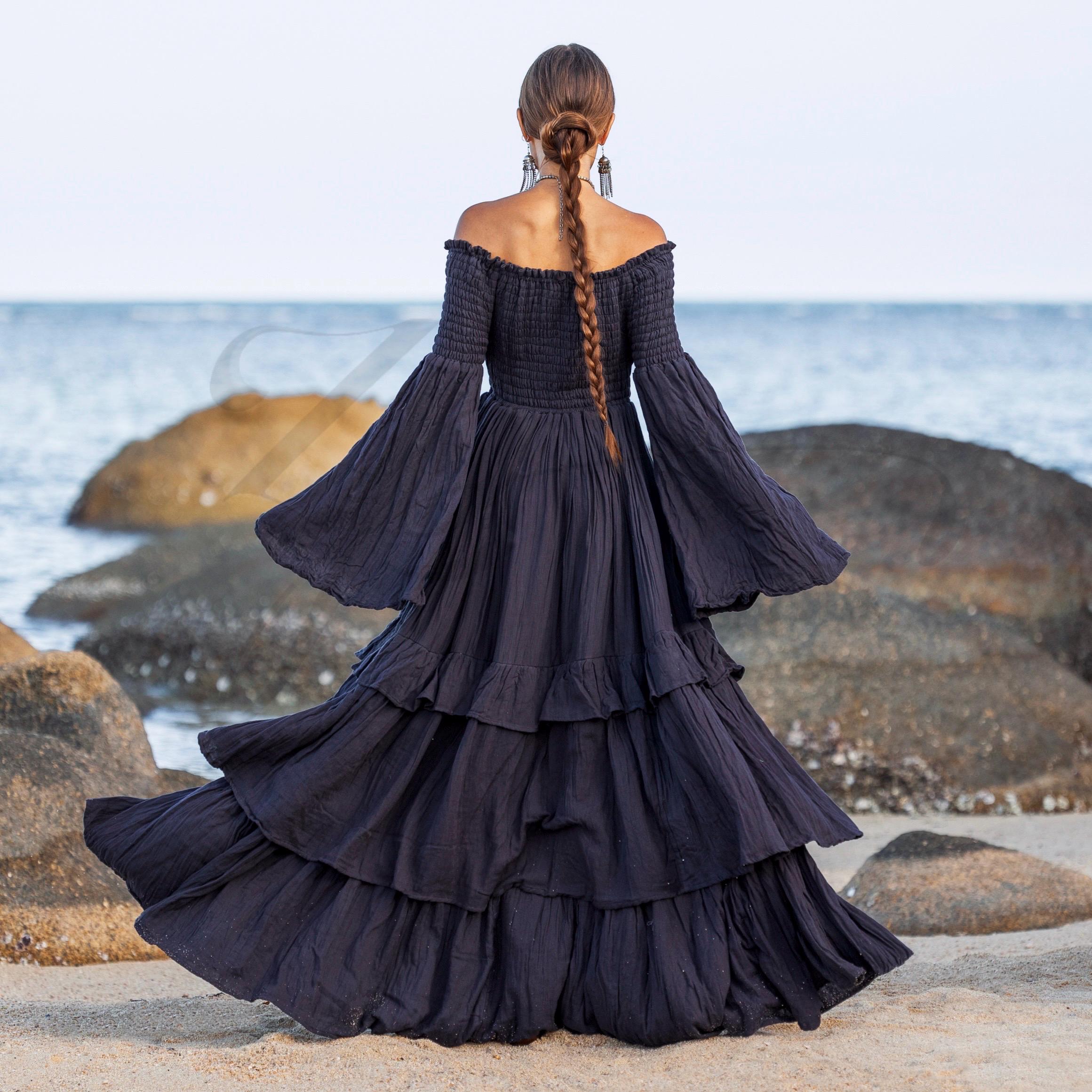 Lucia Boho Wedding Dress – Obsidian Wave | Off-Shoulder Cotton Maxi Gown by ZinniaPearl
