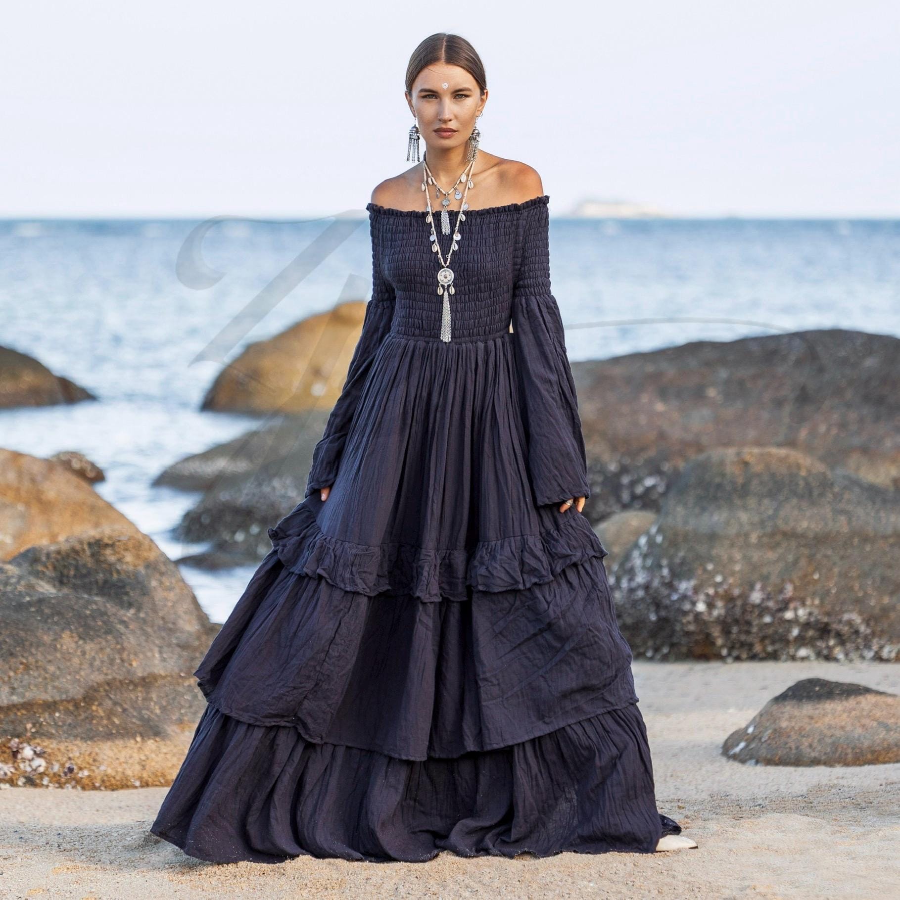 With a sweeping tiered skirt, flared long bell sleeves, and an off-shoulder neckline, Lucia evokes romance and feminine freedom. The smocked bodice provides gentle structure and stretch, allowing you to move with ease and intention. Whether paired with silver adornments or wildflower crowns, this gown is made for life’s most magical moments.