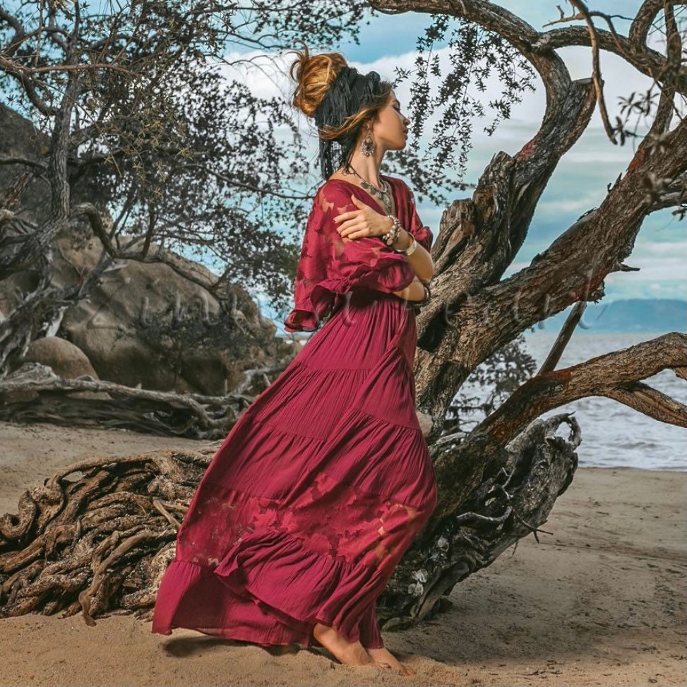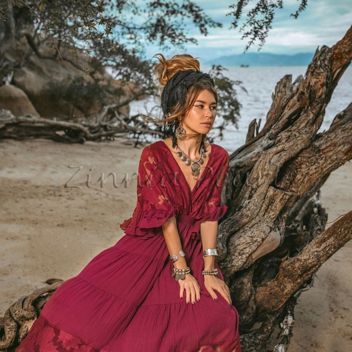 Femme maxi dress featuring a plunging V neckline with dramatic lace inlayed tiered skirt, ruffled lace sleeves and hem, smocked waist.
