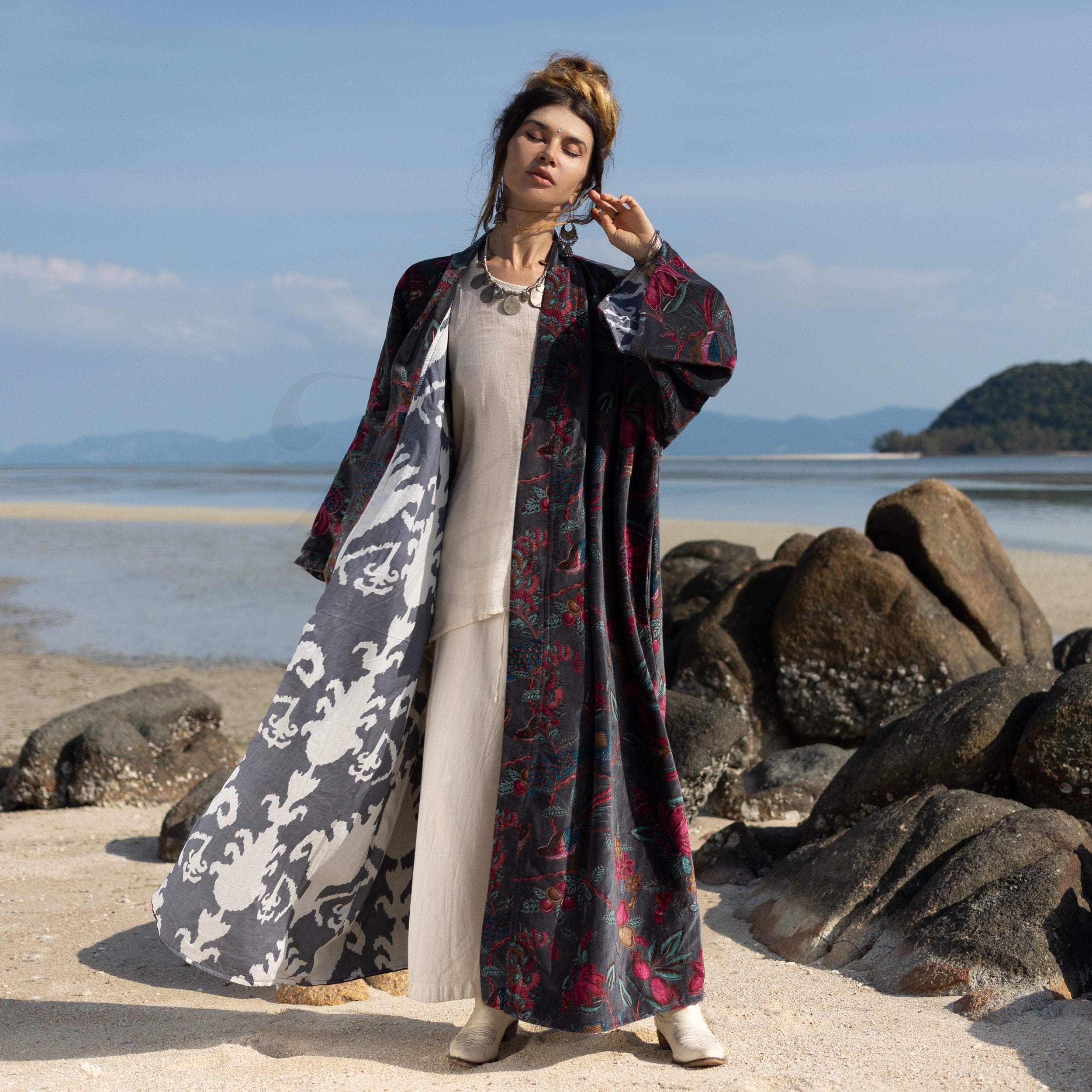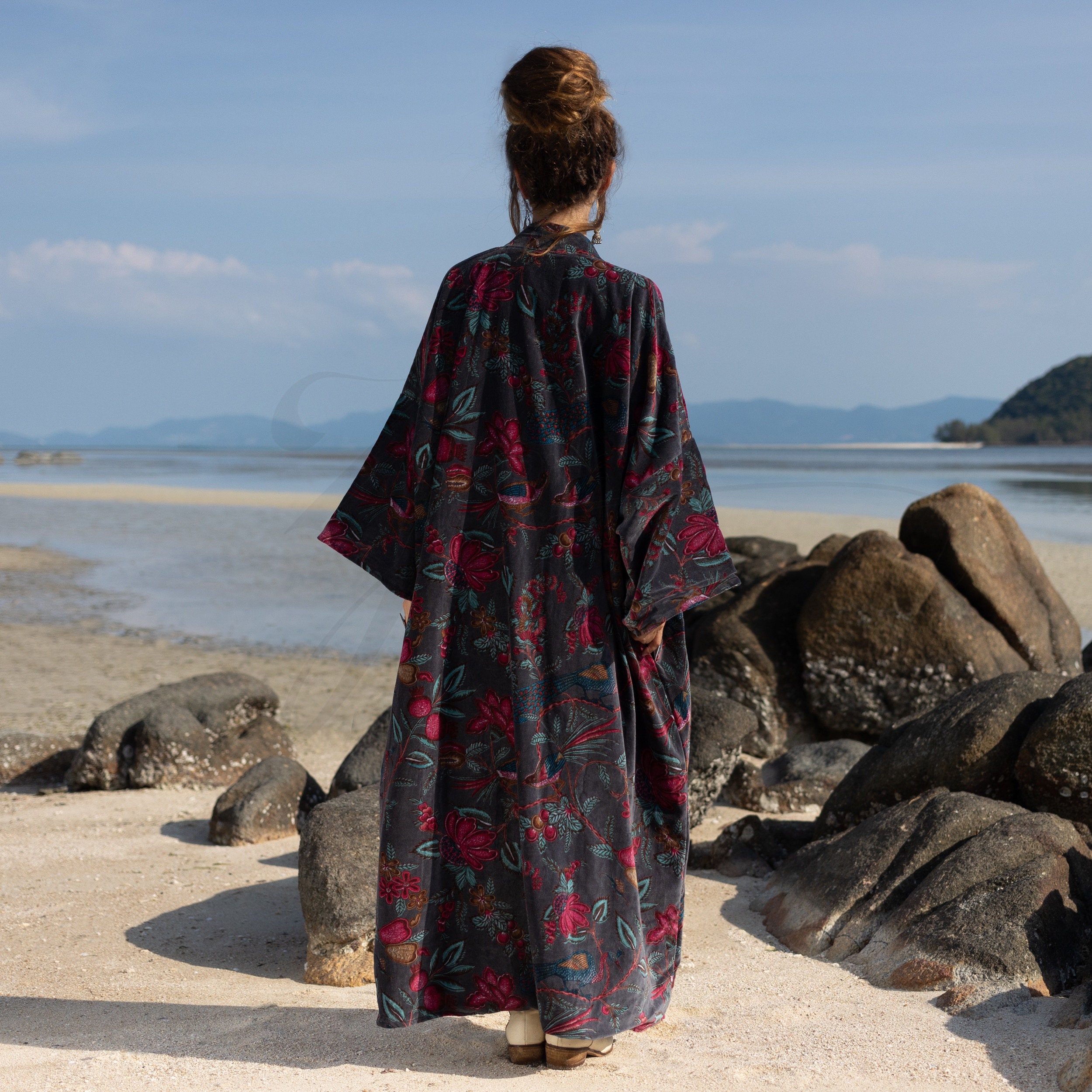 Wrap yourself in timeless artistry with the Mai Velvet Kimono Coat in Rosewood — a flowing boho duster that celebrates color, comfort, and confidence. This statement piece is crafted from 100% cotton velvet, fully lined in soft cotton, and designed in a sweeping maxi silhouette that flatters every curve.