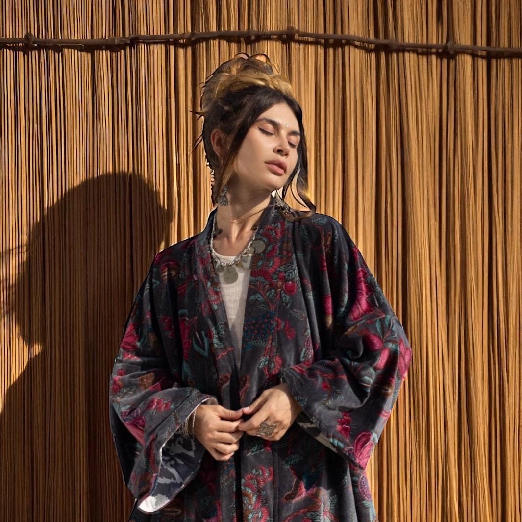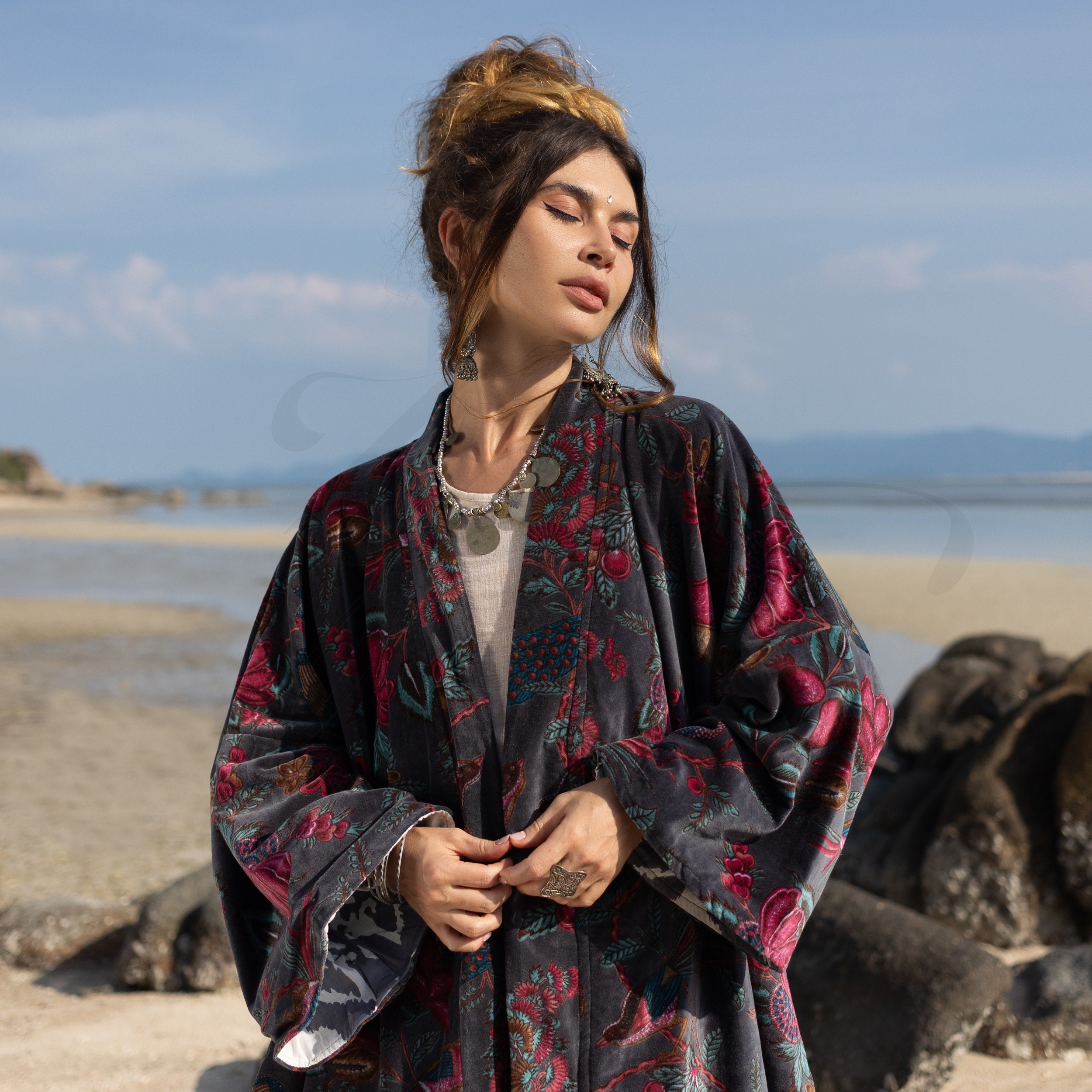 Mai Velvet Kimono Duster | Handmade Rosewood Boho Coat by ZinniaPearl