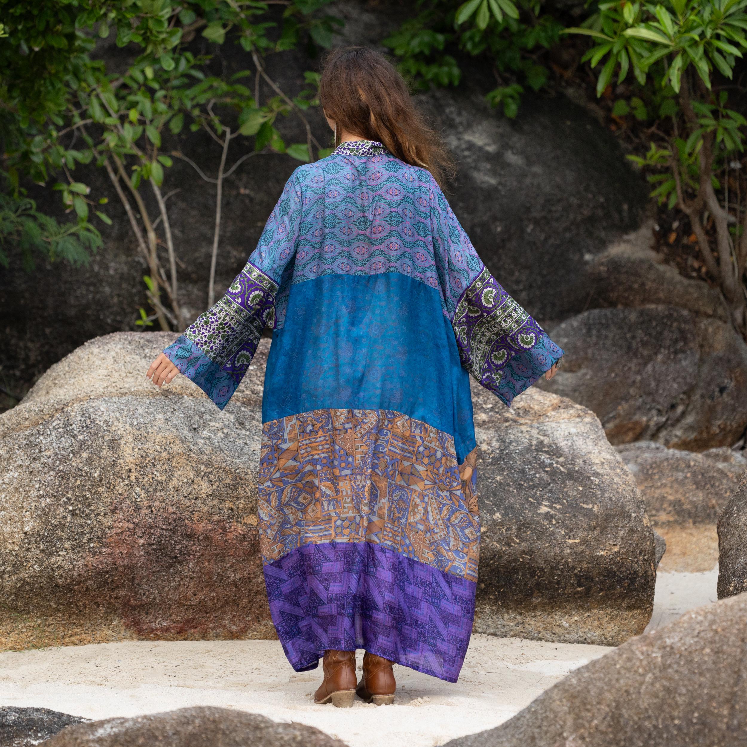 Step into soulful elegance with the MAI duster in Gypsy Rainfall—a mesmerizing boho kimono handcrafted from upcycled vintage silk saris. This flowing patchwork robe blends moody indigos, rainfall teals, copper accents, and violet paisleys into a storybook of color and craft.