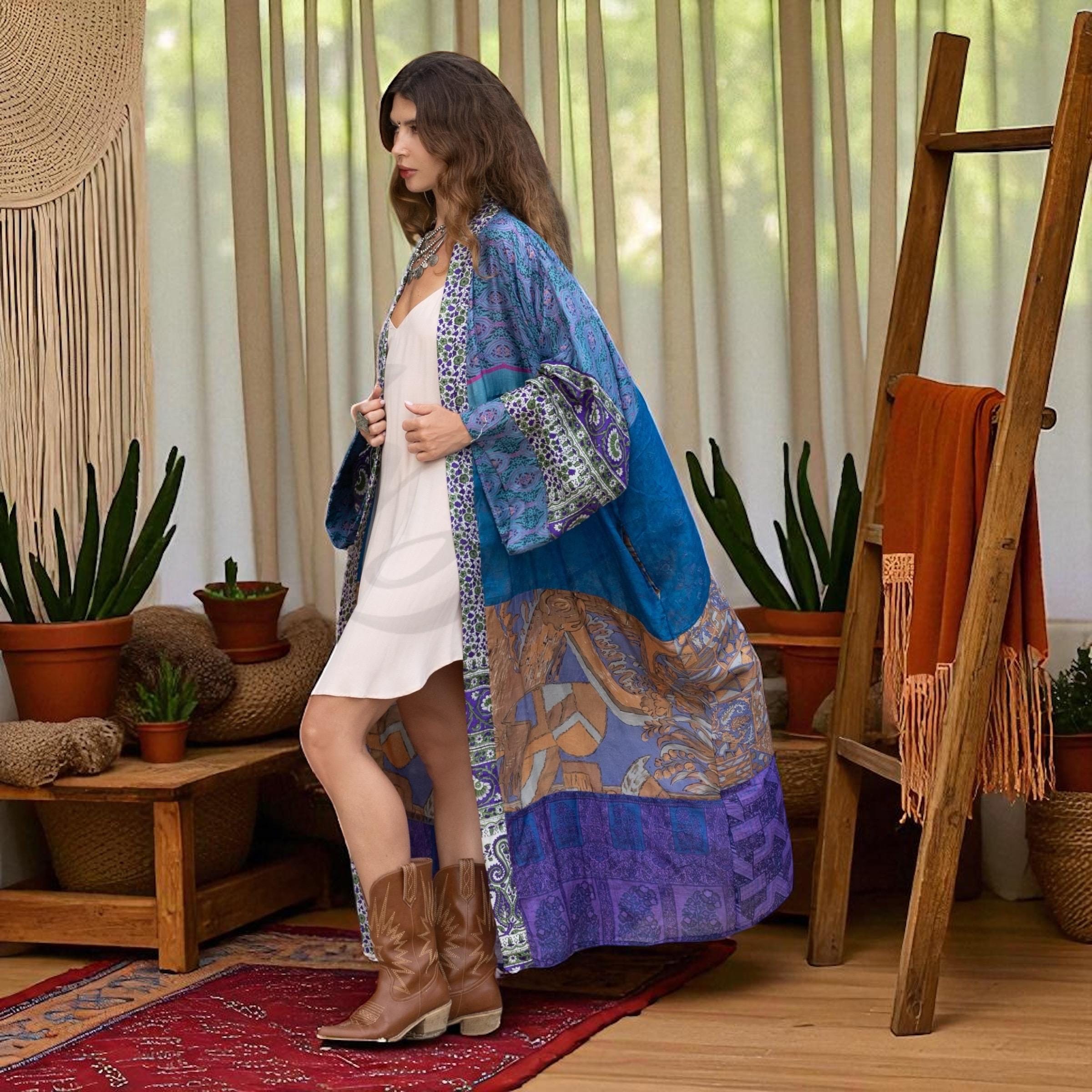 MAI Vintage Silk Kimono Duster – Gypsy Rainfall Boho Patchwork Robe | Upcycled Festival Jacket, Beach Cover-Up & Artistic Gift for Her