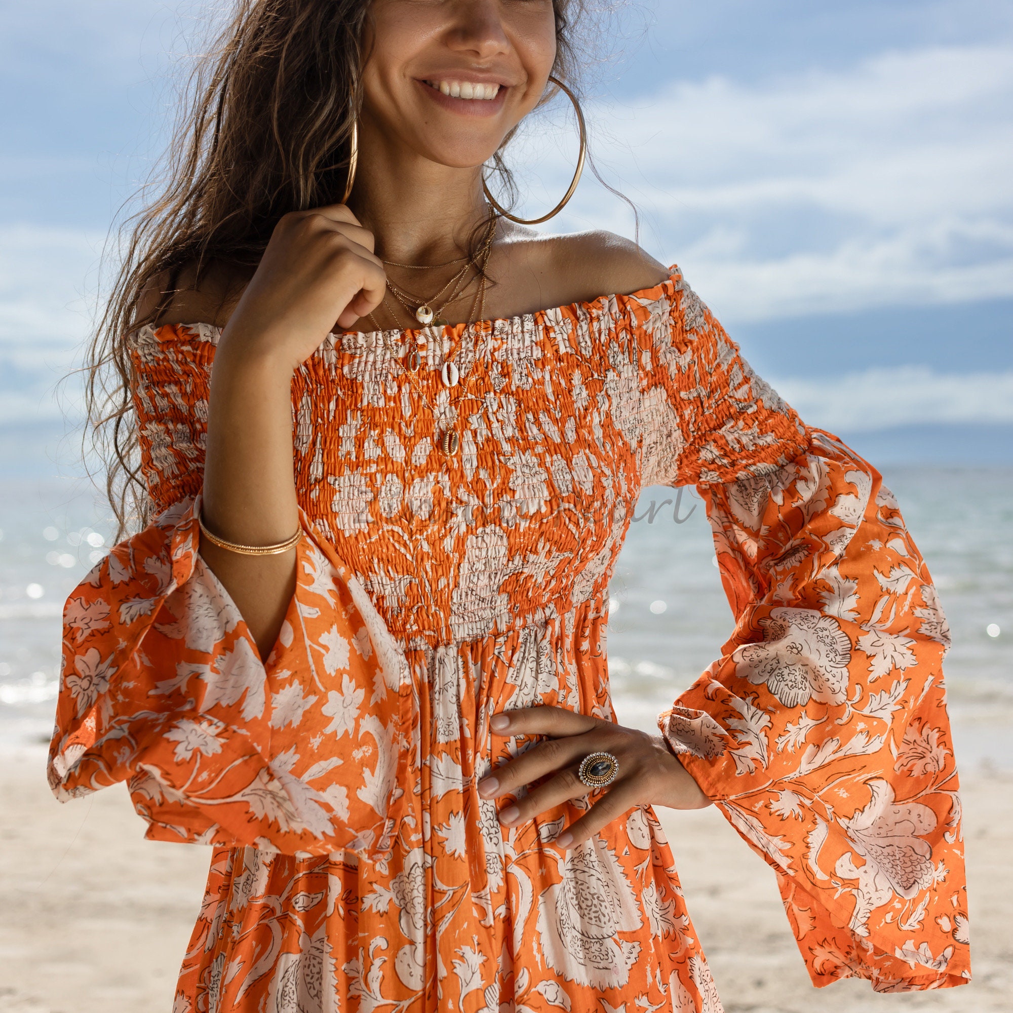 The off-shoulder feature and flowy, comfortable fit make it the ultimate choice for festivals, engagements, and weddings, providing a touch of bohemian style that is simply unmatched. With its semi-sheer accents, smocked waist, and neckline, as well as flare long sleeves and sweeping silhouette, Lucia exudes the perfect blend of comfort and elegance.