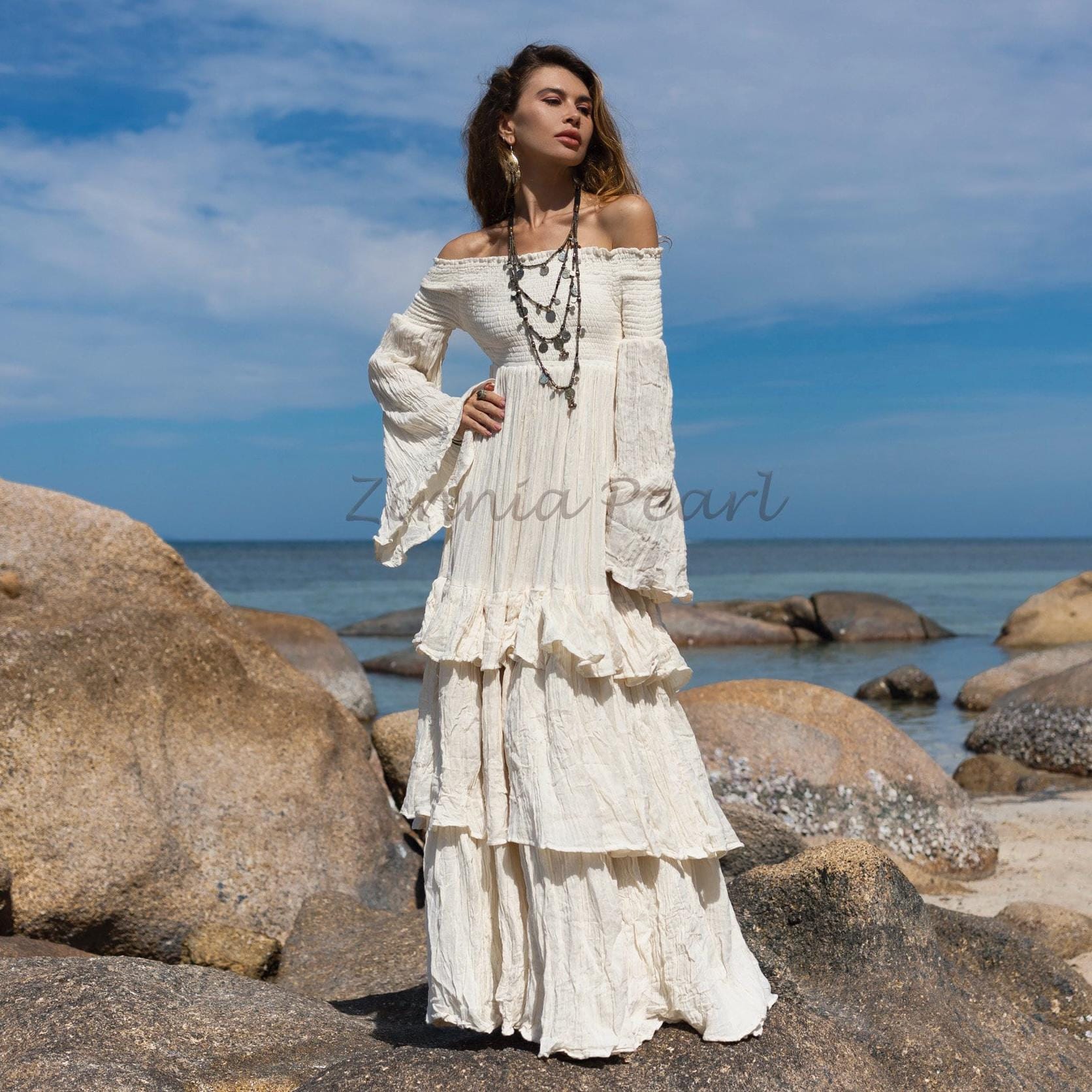 Off-Shoulder Boho Wedding Dress: Tiered Cotton Maxi Dress – Lucia