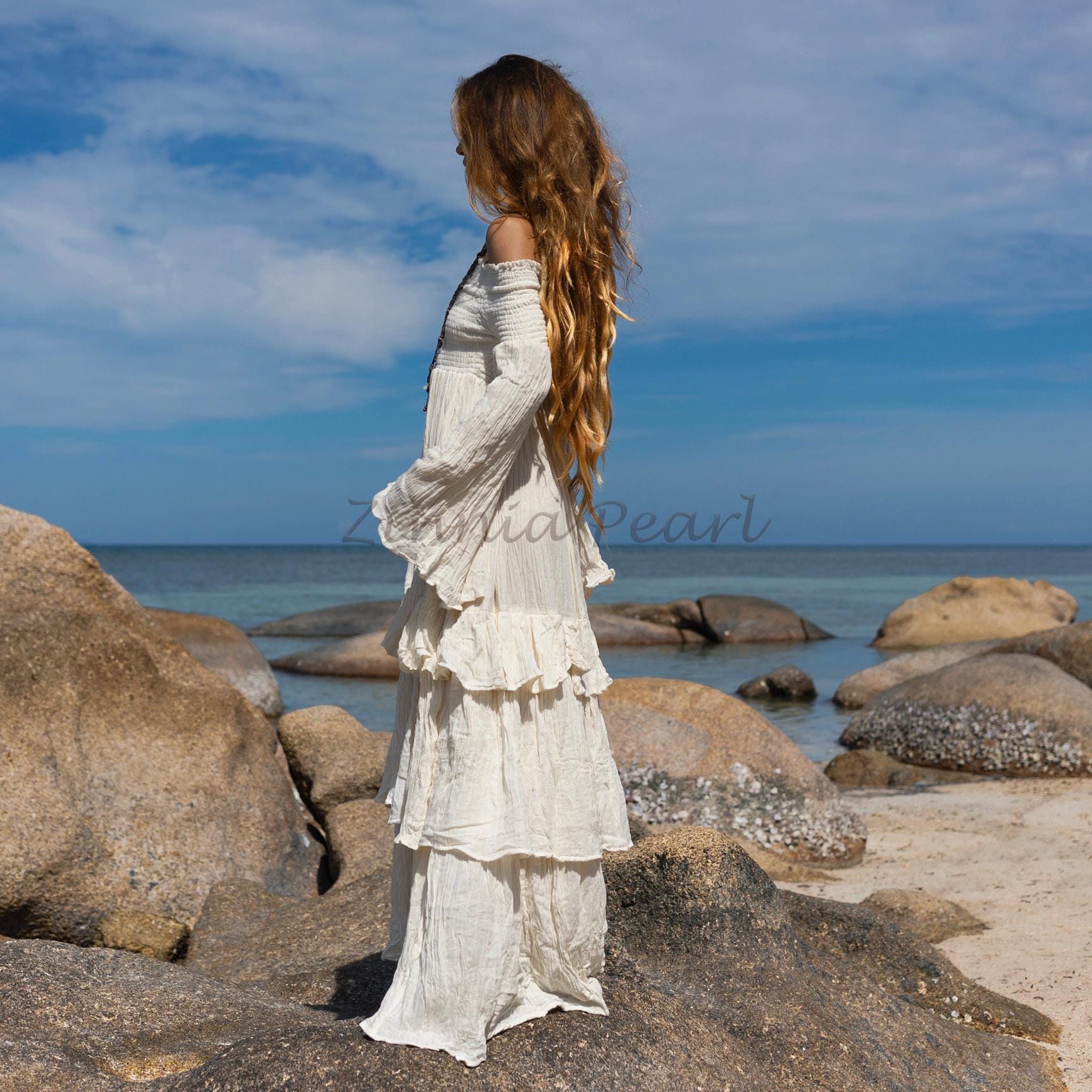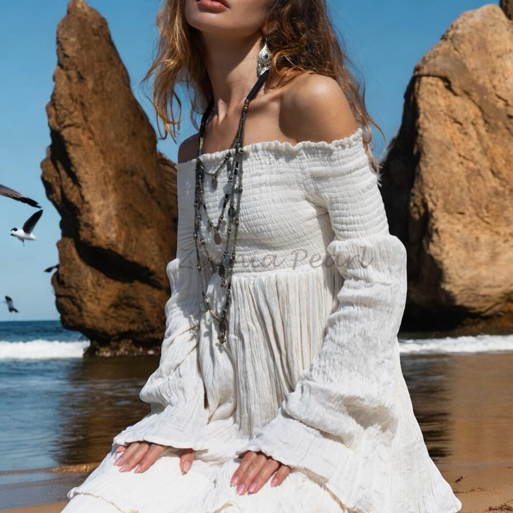 Featuring a smocked off-shoulder neckline, flared long sleeves, and a voluminous maxi skirt, this gown fits like poetry from XS to 4XL. Whether you’re exchanging vows on a windswept beach, glowing in a maternity shoot, or twirling barefoot beneath the stars, Lucia is your invitation to feel radiant, grounded, and free.