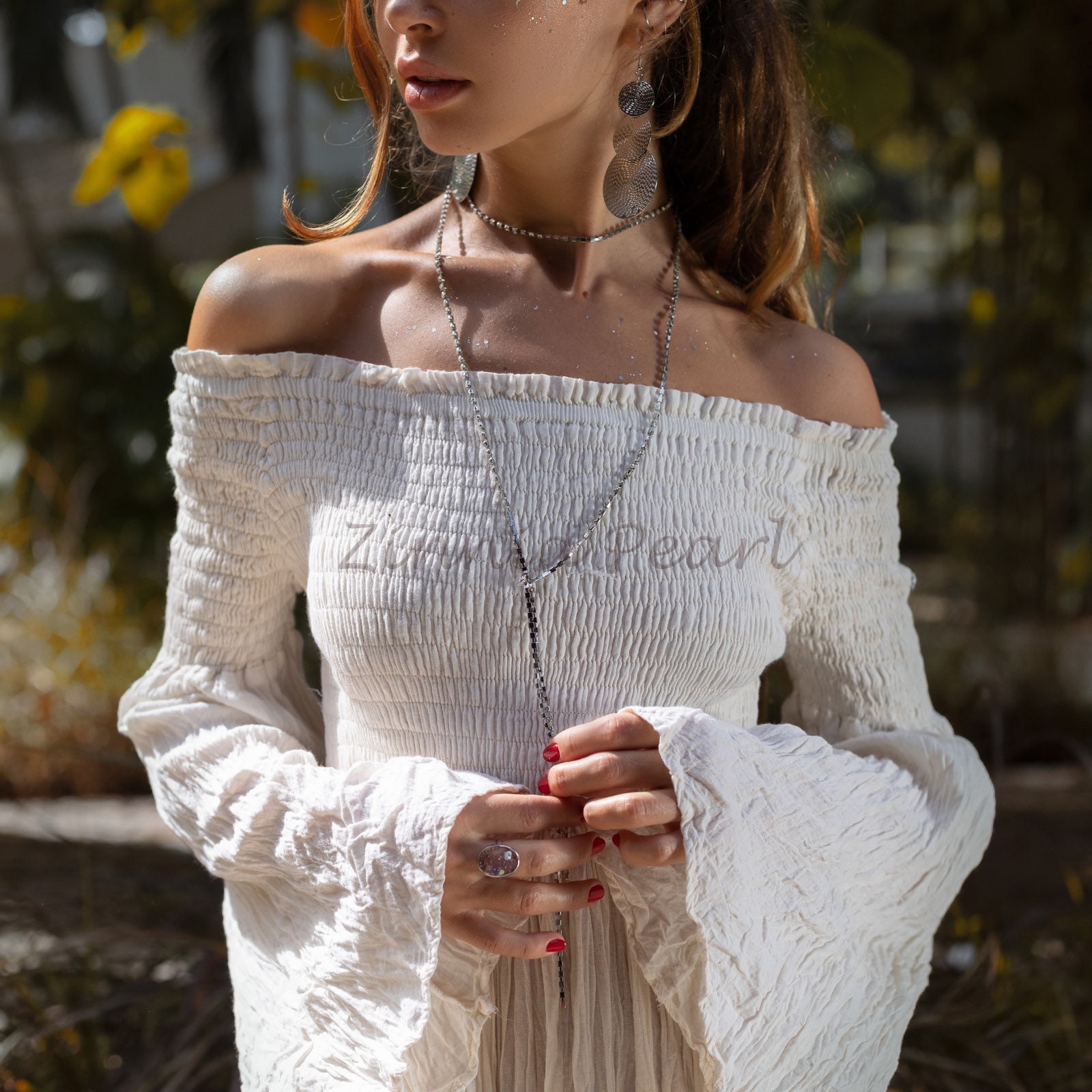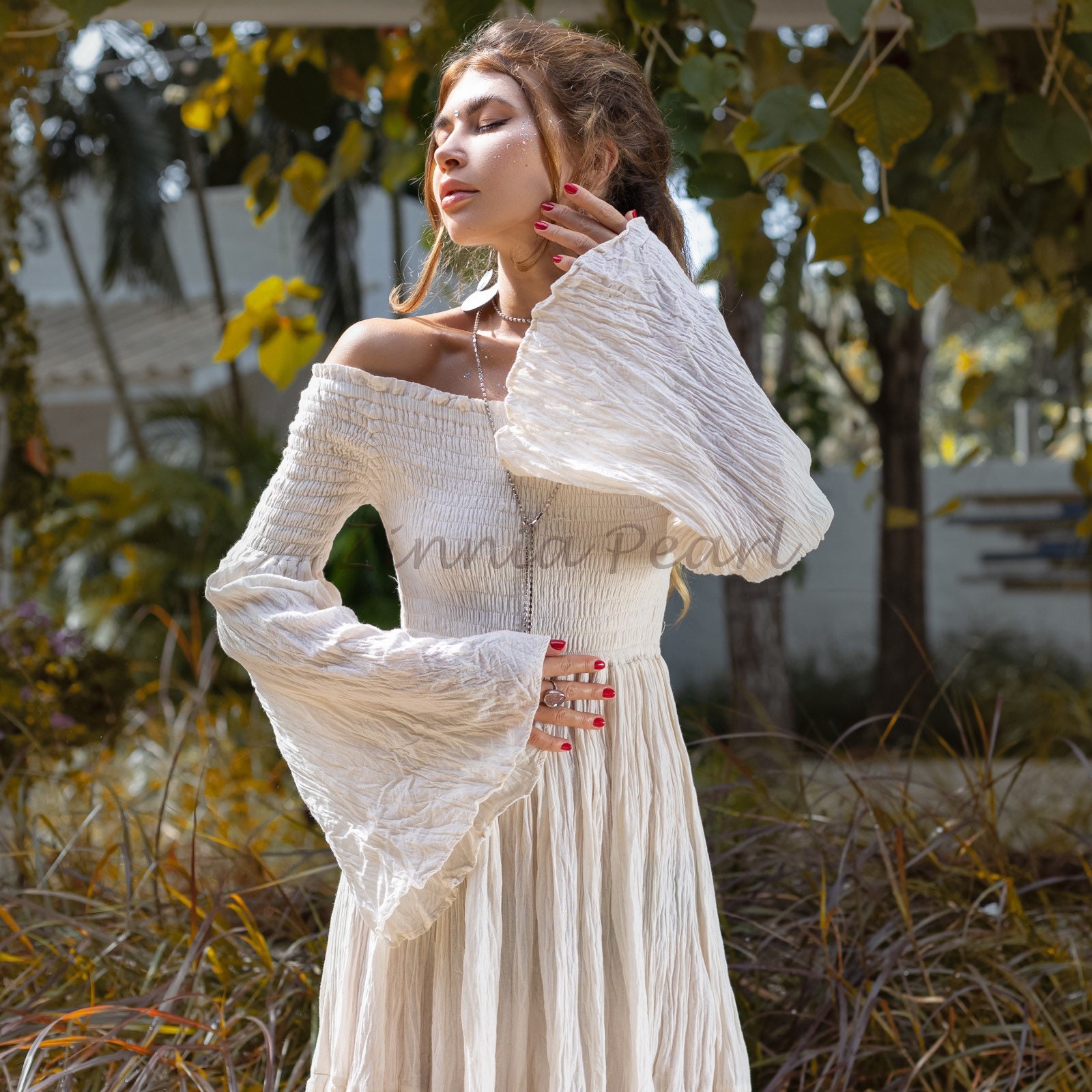🌻 The off-shoulder feature and flowy fit make Lucia perfect for festivals, engagements, or weddings – infusing a touch of unmatched bohemian style into every occasion. With semi-sheer accents, a smocked waist and neckline, flare long sleeves, and a sweeping silhouette, Lucia embodies the perfect blend of comfort and elegance.