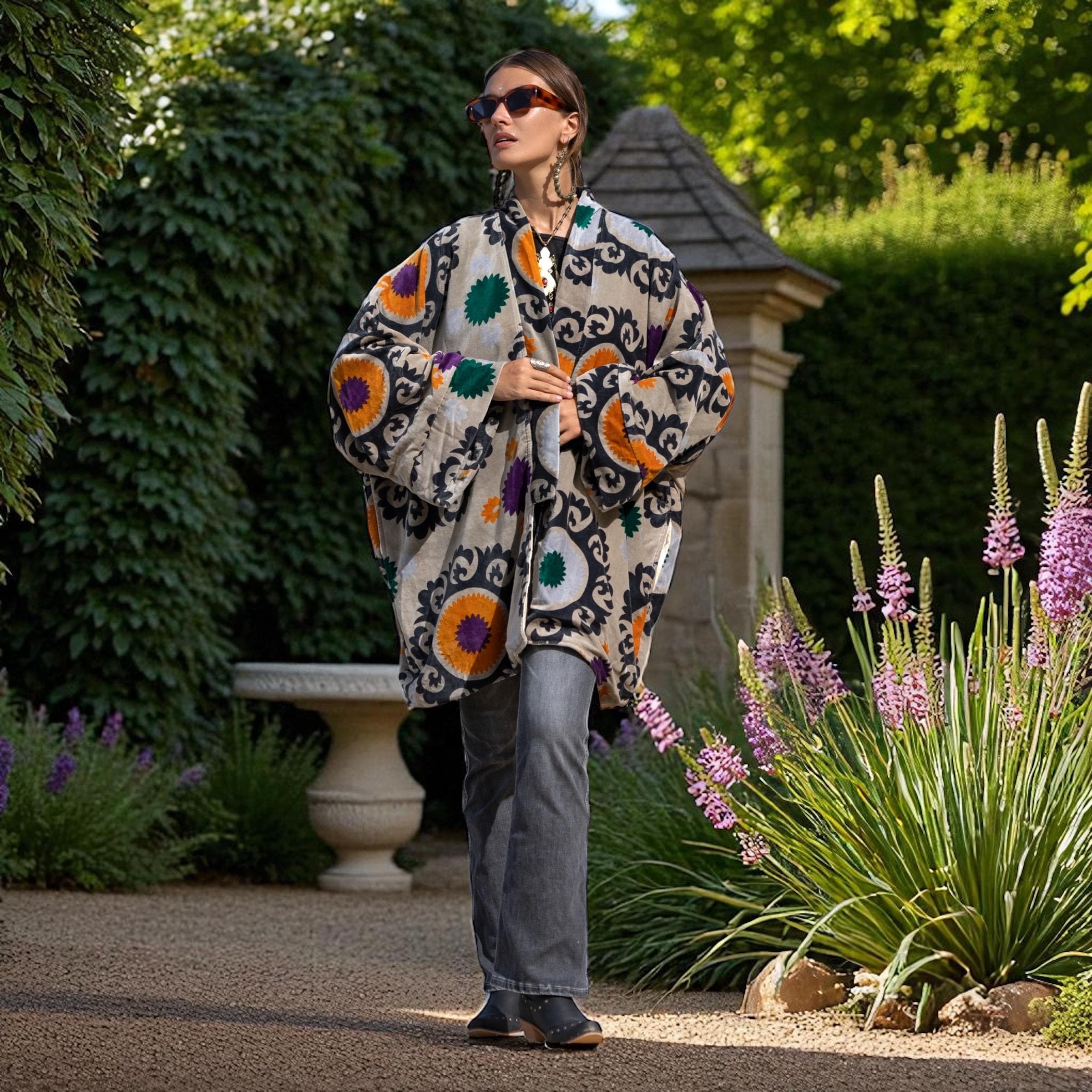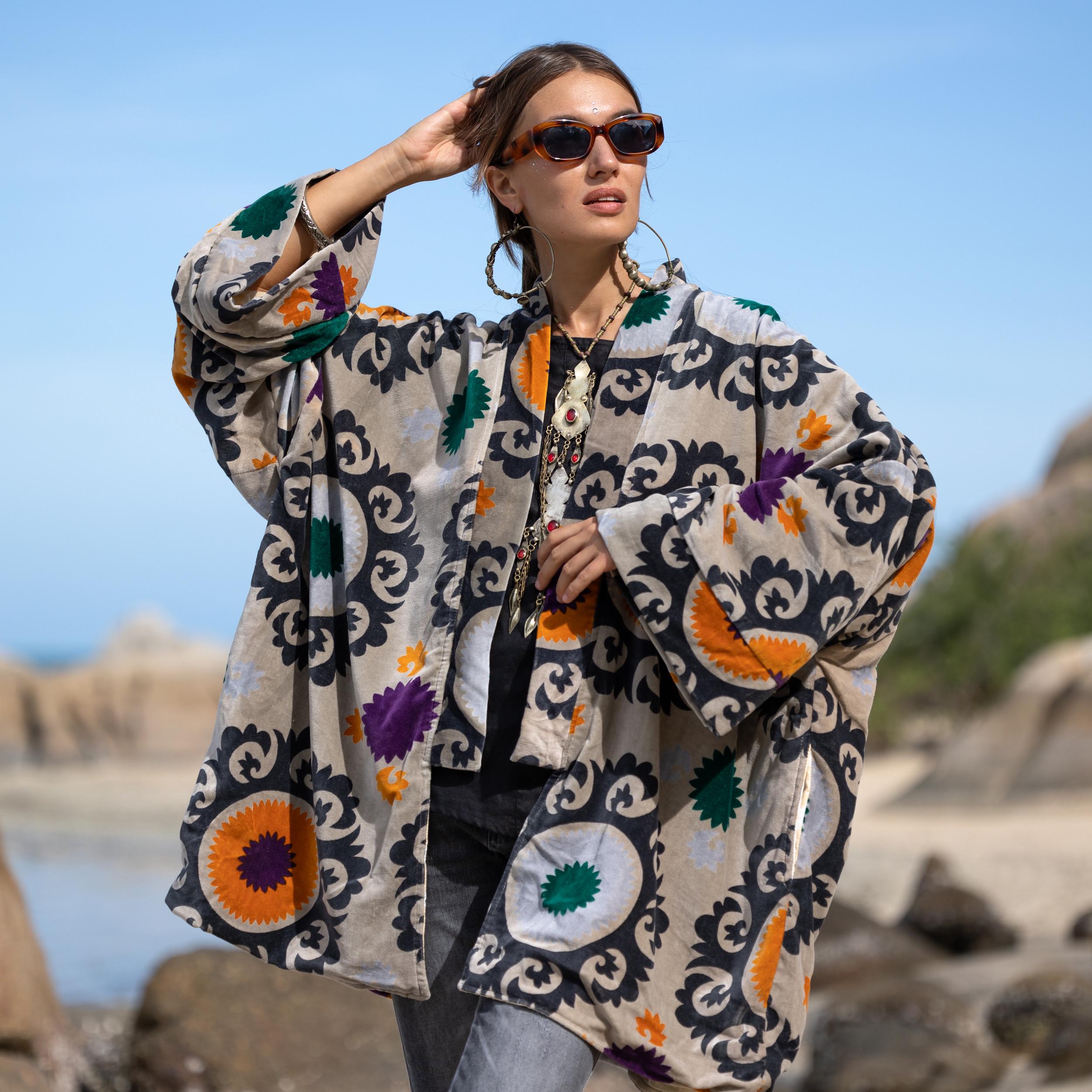Onyx Mandala Velvet Kimono Jacket: Plus Size Boho Duster Coat – Mei