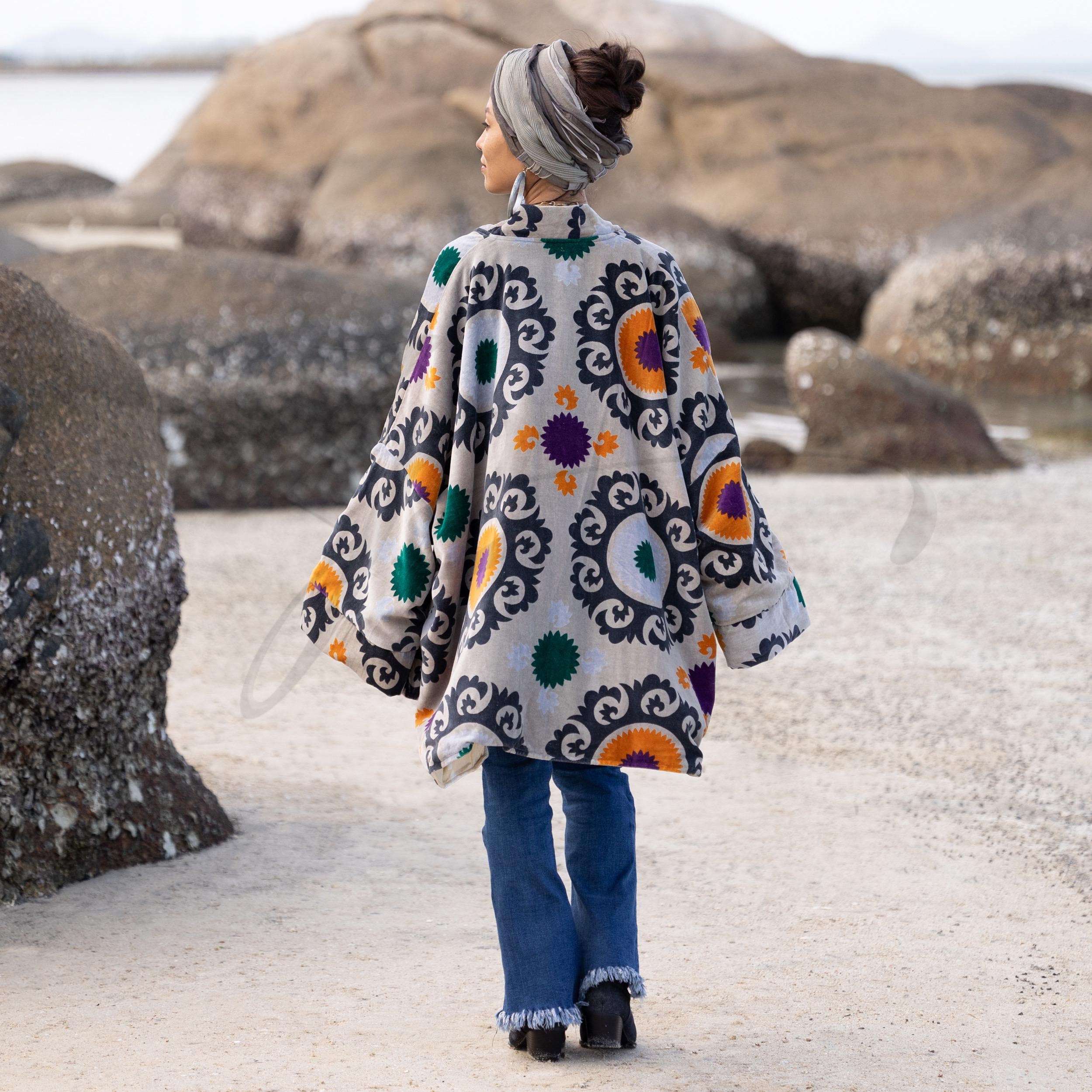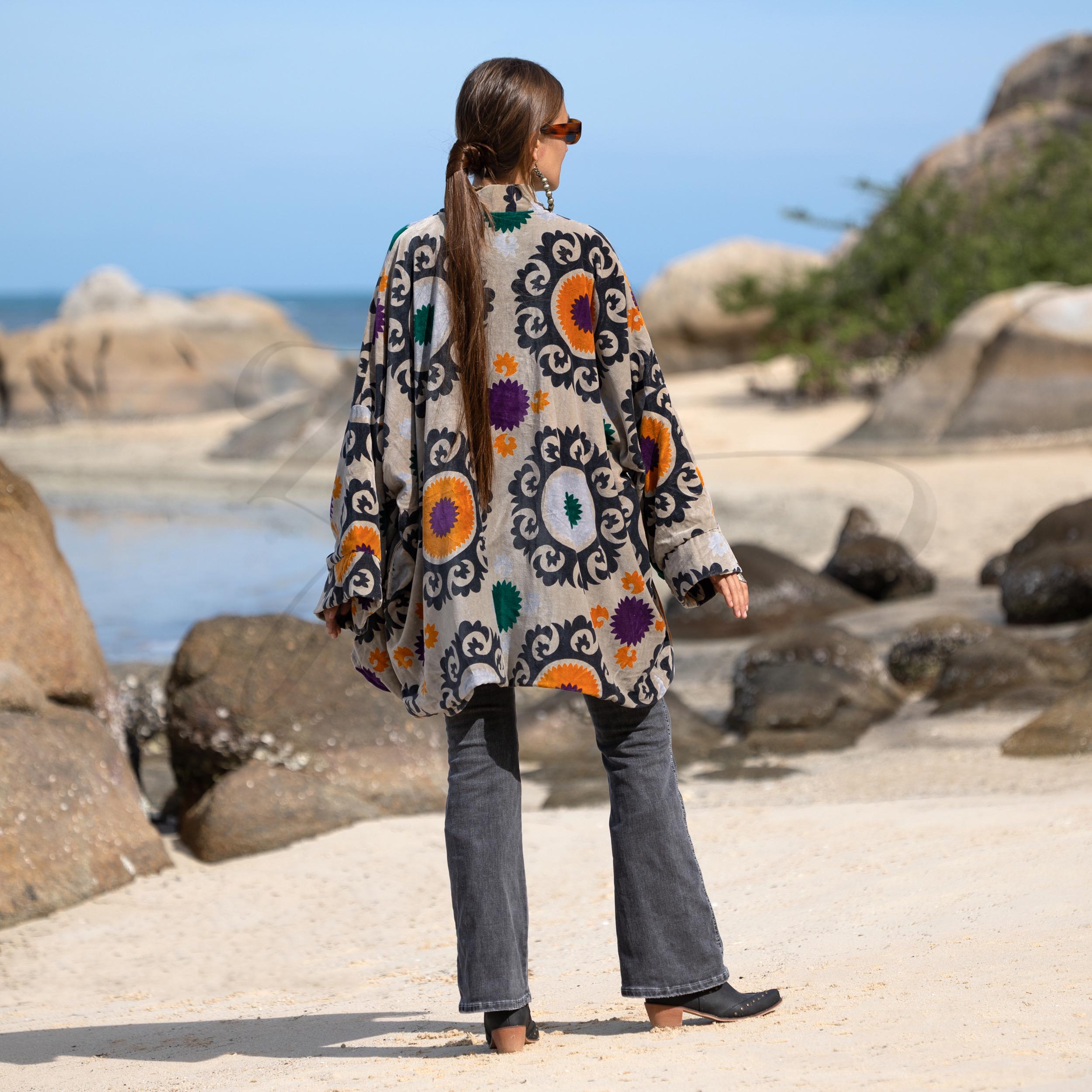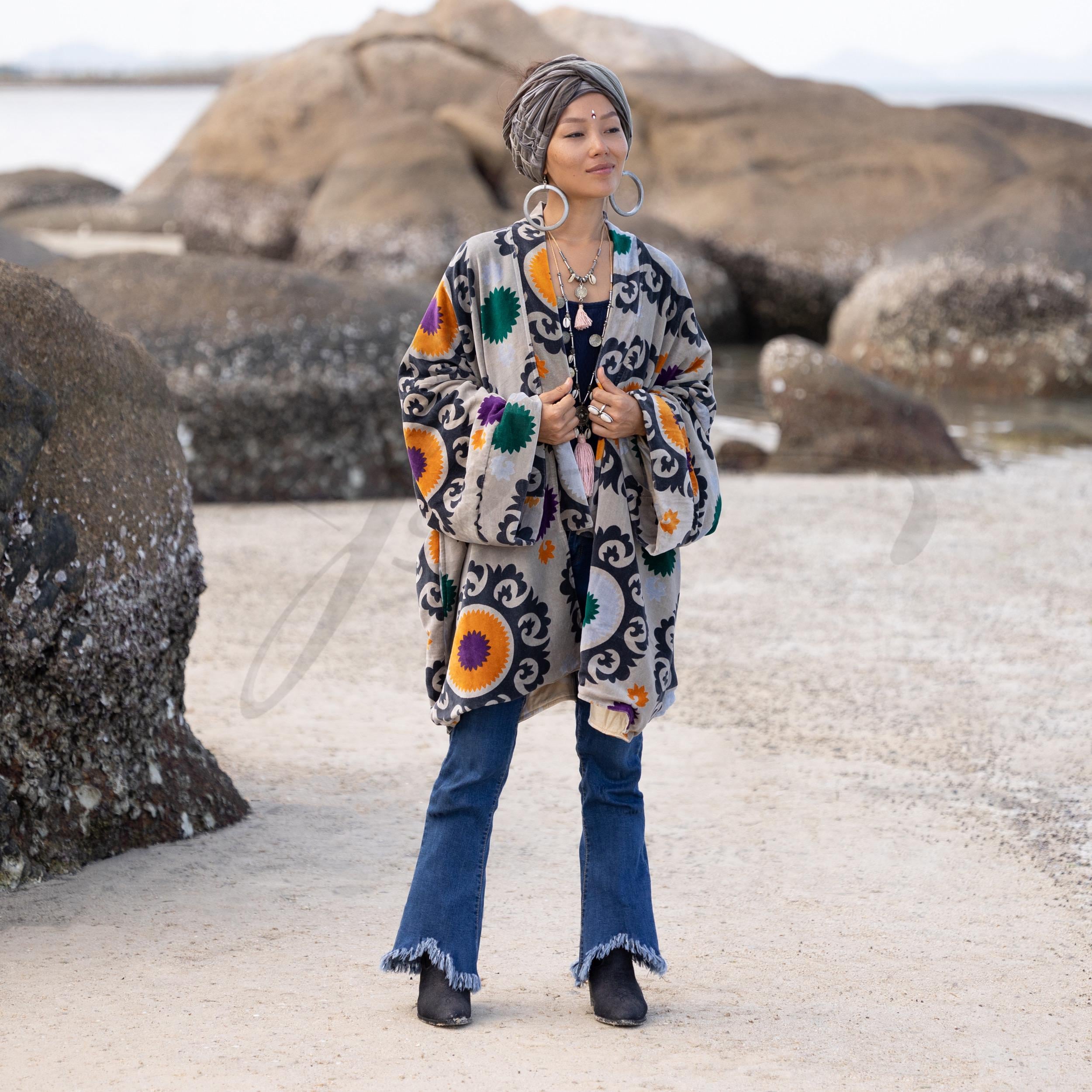 Unveil your winter radiance in the Onyx Mandala Mei Kimono Jacket — a handcrafted velvet duster that merges mystique with bohemian grace. Made from plush cotton velvet in a soft mist-grey base, this piece is crowned by a dramatic onyx mandala blossoming across the back — a powerful emblem of transformation and inner calm.
