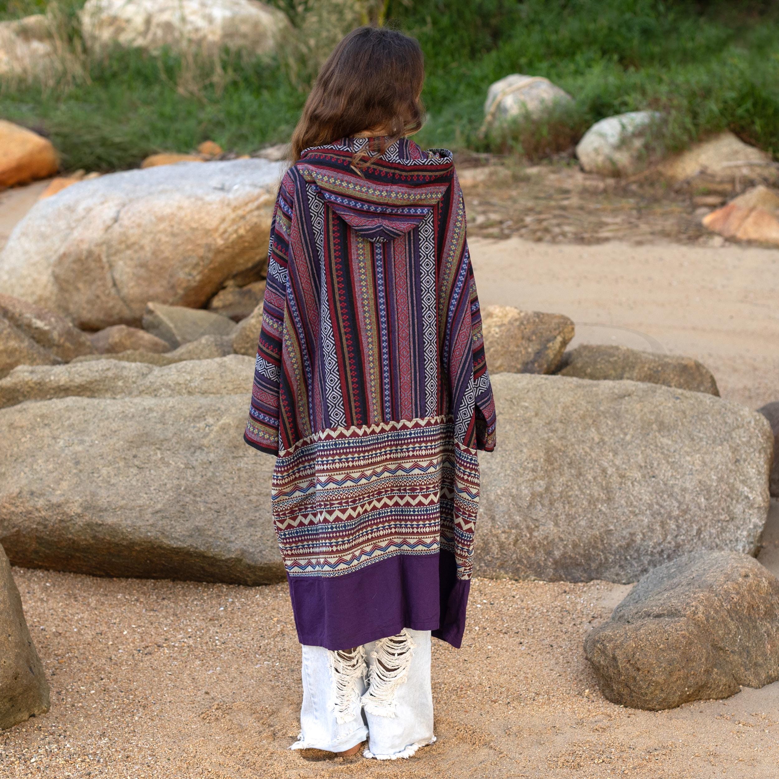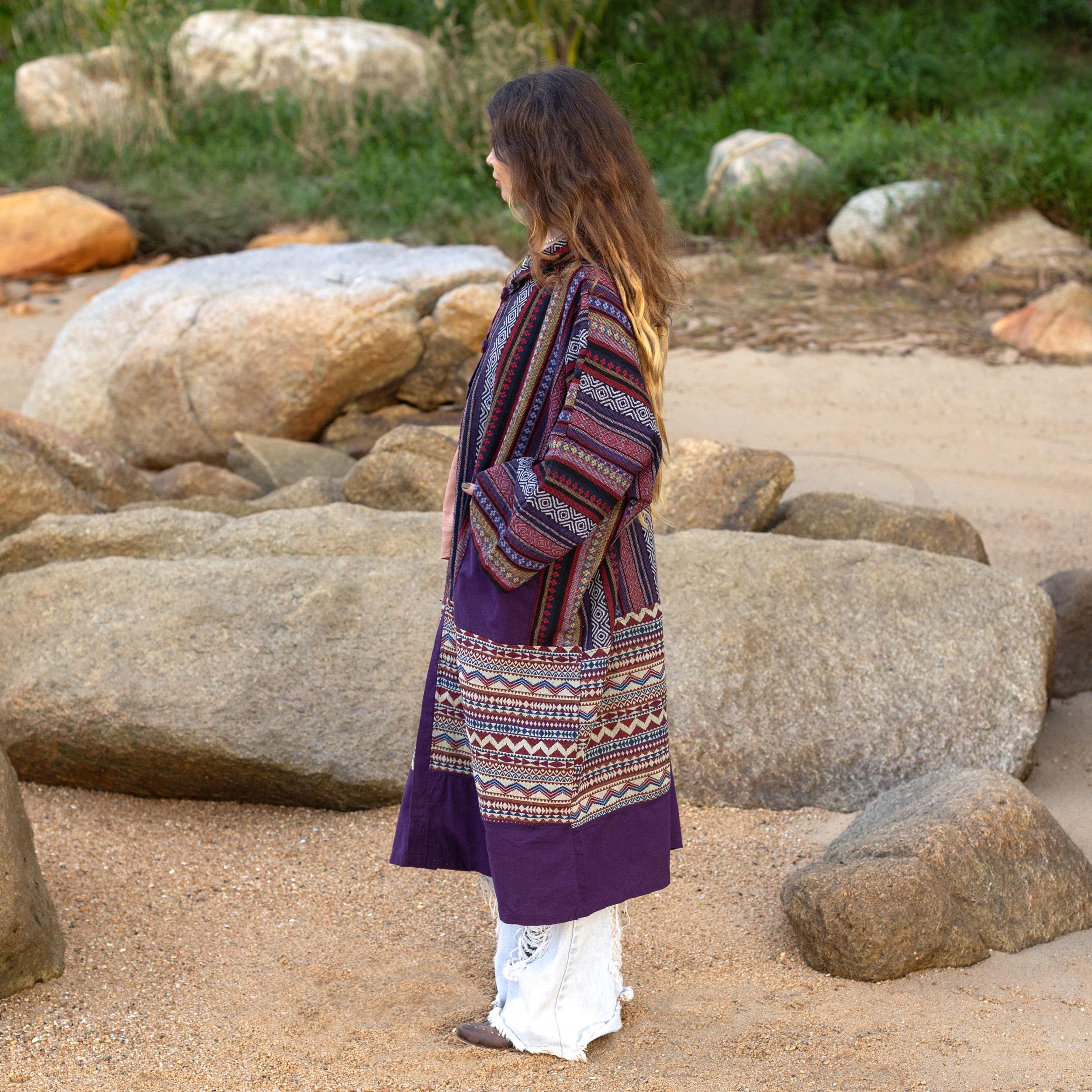 This kimono-inspired duster features intricate Gheri-style woven patterns in rich garnet, plum, and earthy tones. The contrast patchwork evokes vintage tribal elegance, making each piece a one-of-a-kind statement.