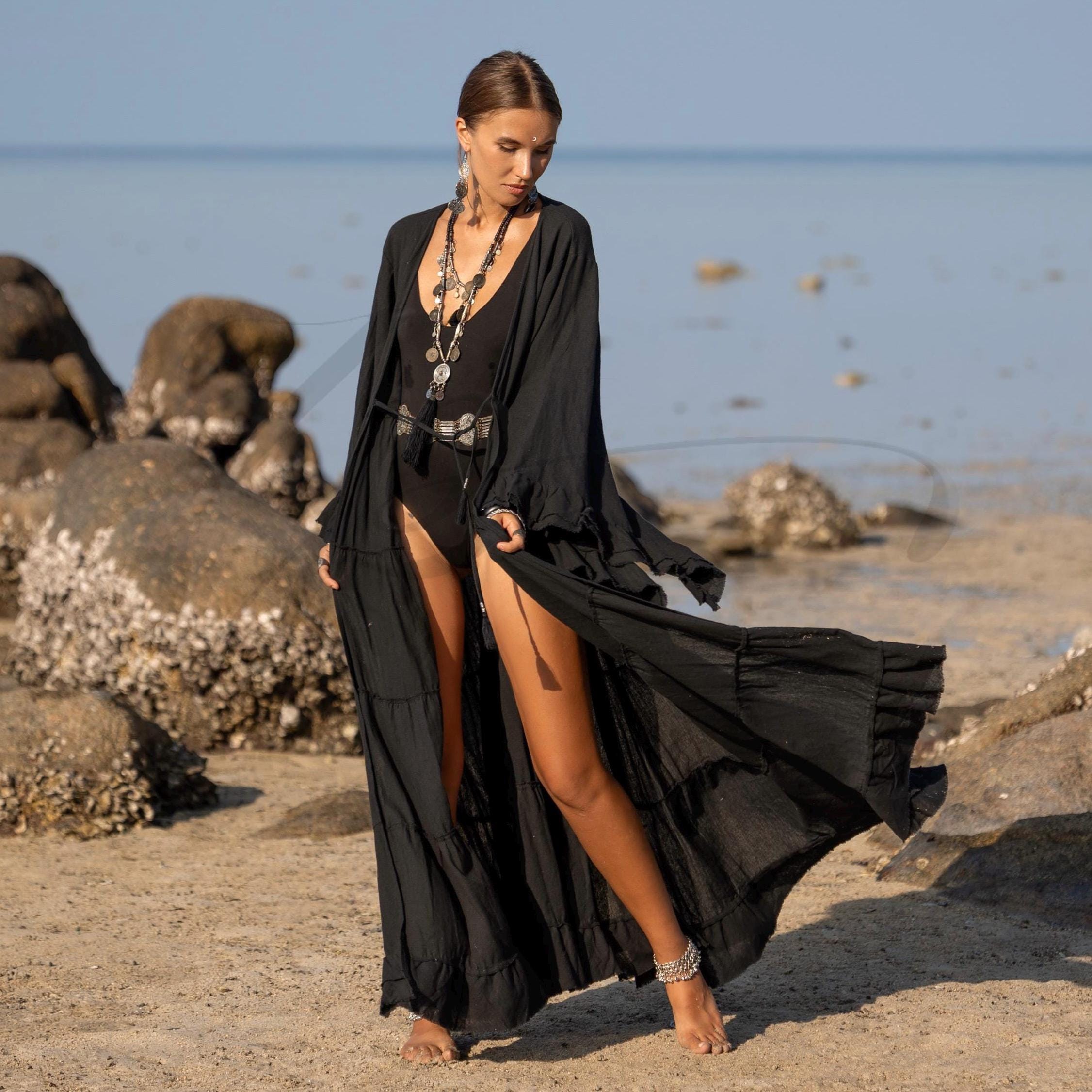 Plus Size Black Hemp Cotton Kimono Duster: Boho Bridal Robe – Kara