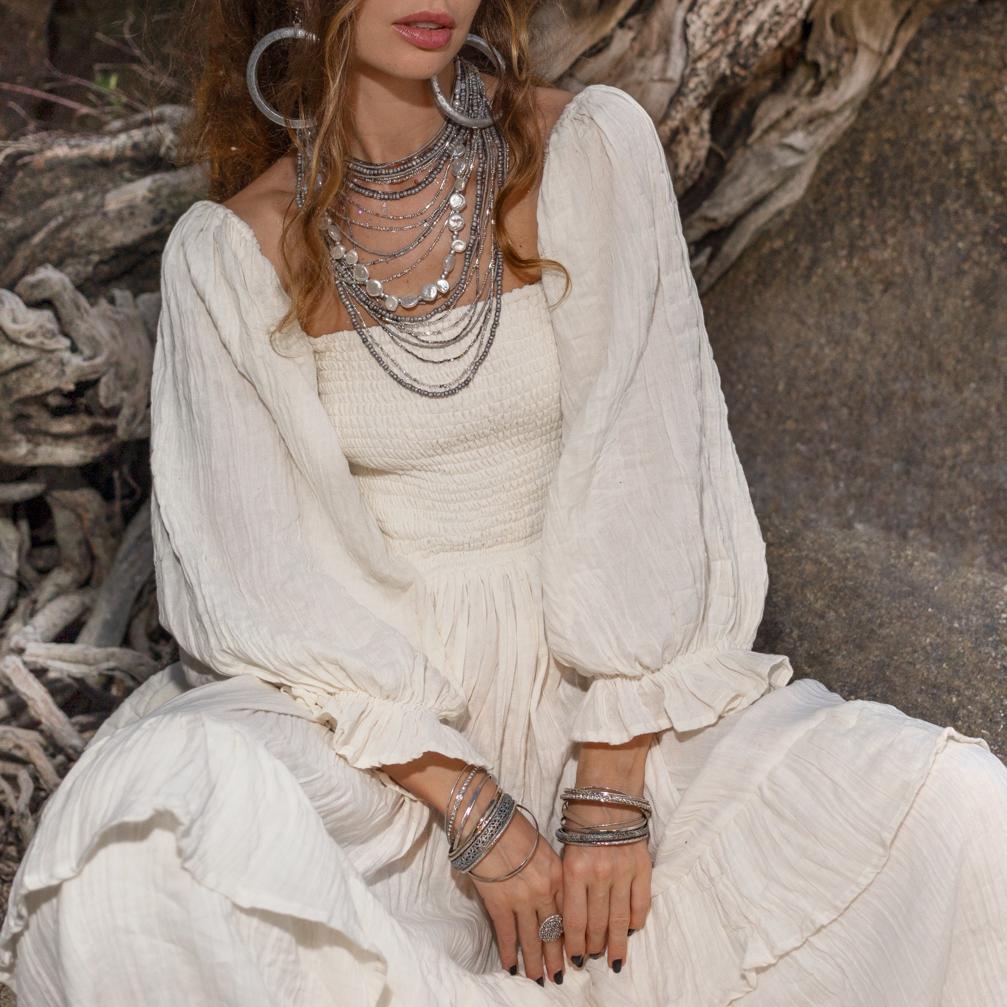 The Isabella Dress in Ocean Pearl is your invitation to effortless elegance. Made from 100% raw crinkle cotton, this cream tiered maxi gown features a flattering square neckline, stretch-smocked bodice, and dreamy puff sleeves. With its unlined, medium-weight texture, the dress moves freely—light on the body, rich in presence.