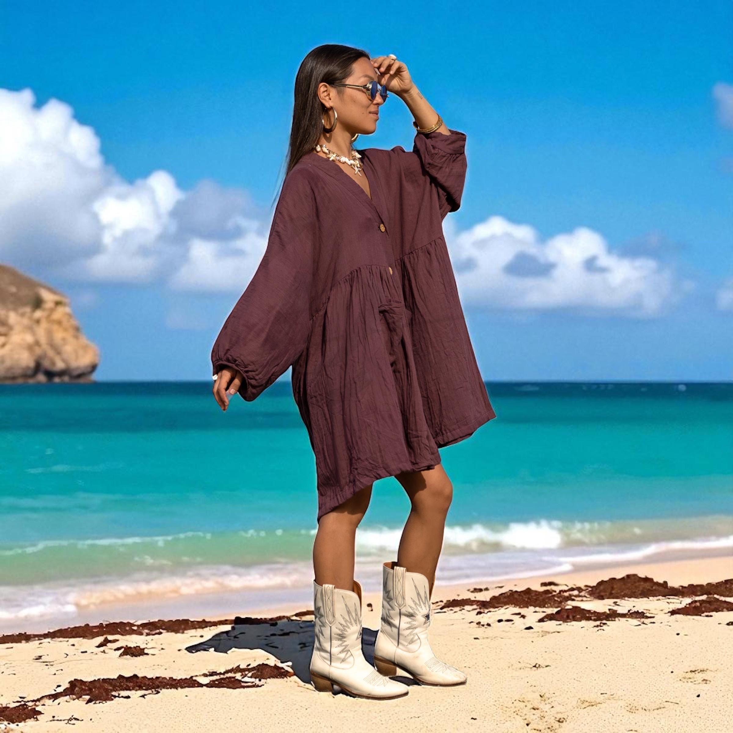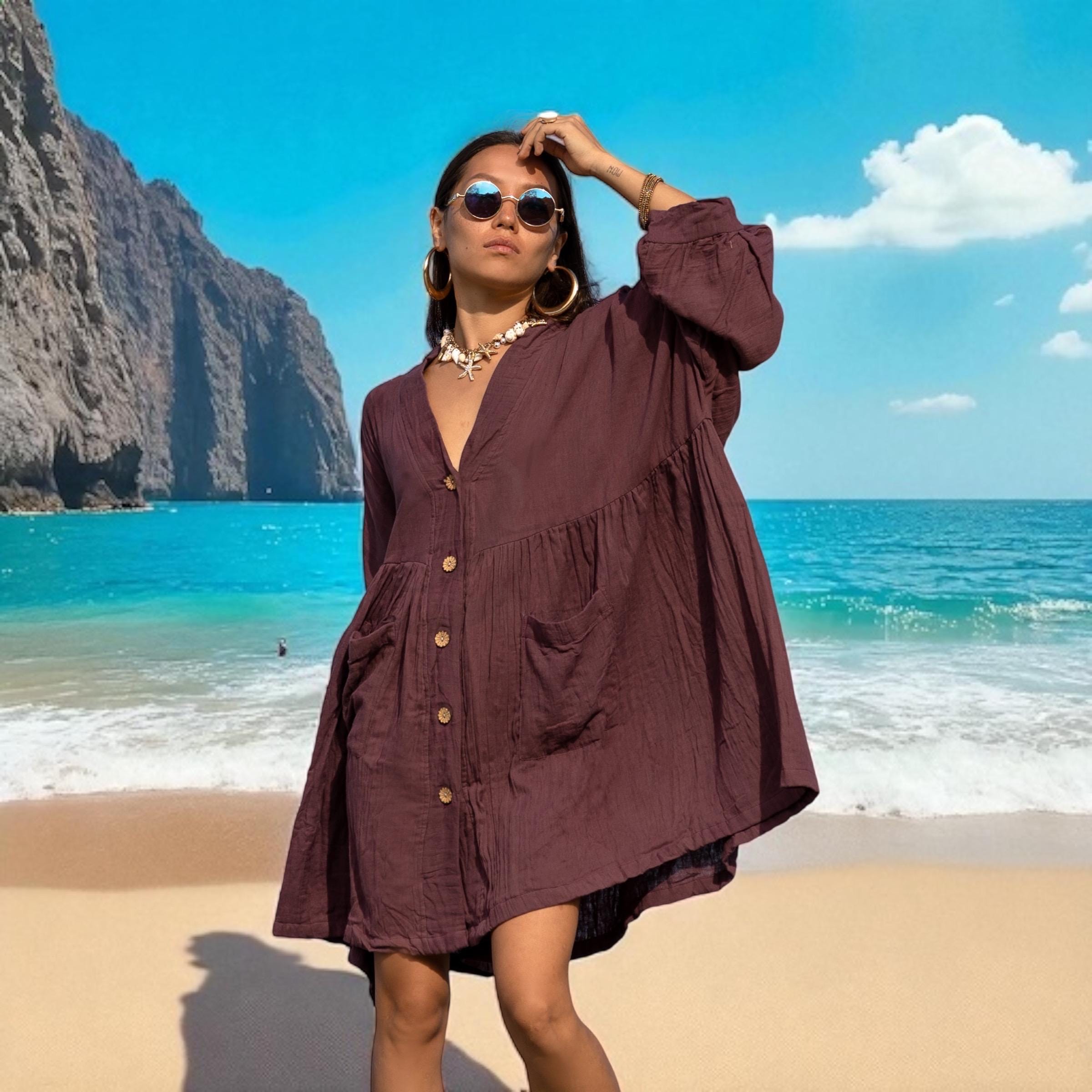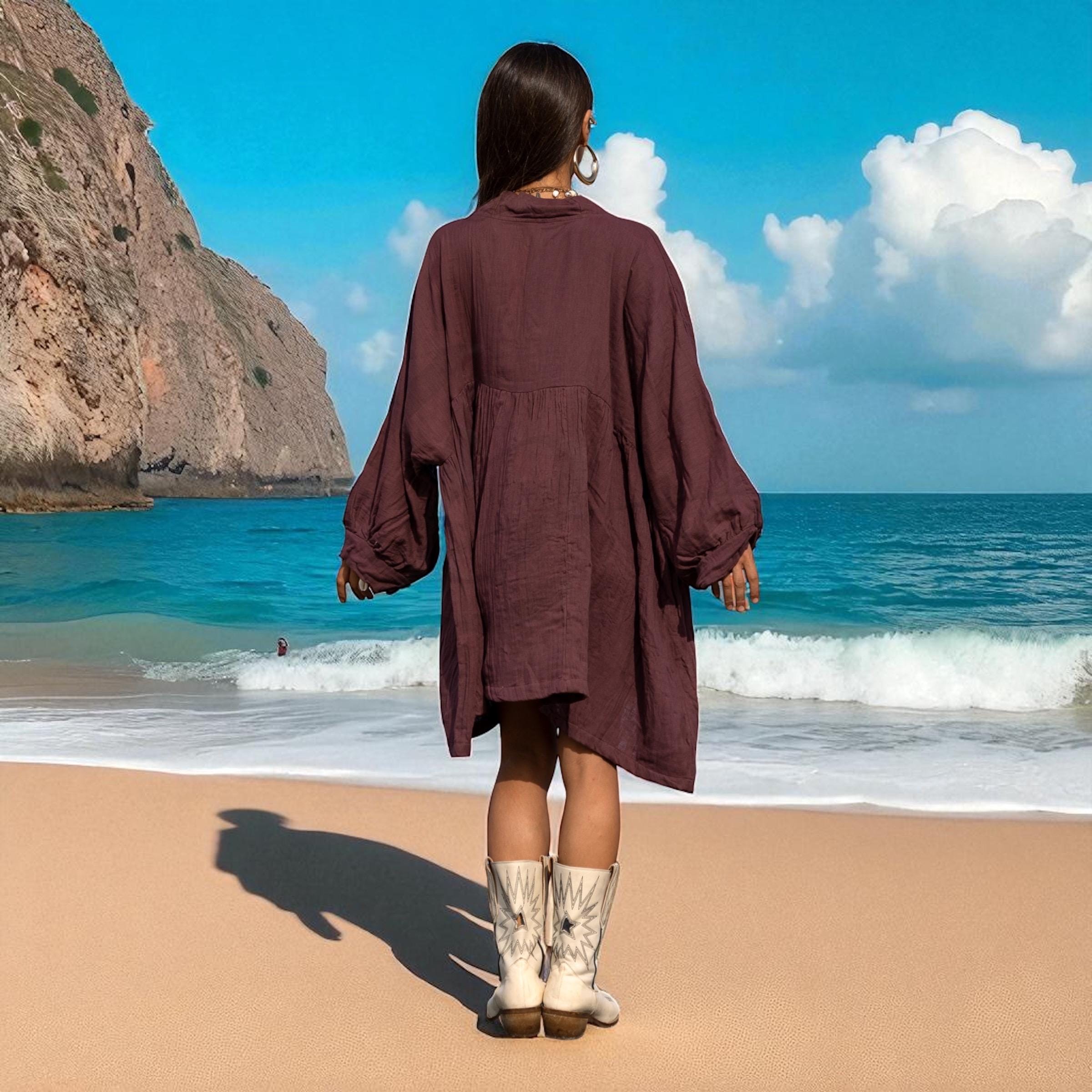 The color—Garner Grove—is a grounding plum-brown hue inspired by ripened orchard fruit and earthen twilight. Whether worn as a tunic top, a breezy cover-up, or your go-to lounge dress, Bellina moves with you—full of comfort, character, and soulful ease.