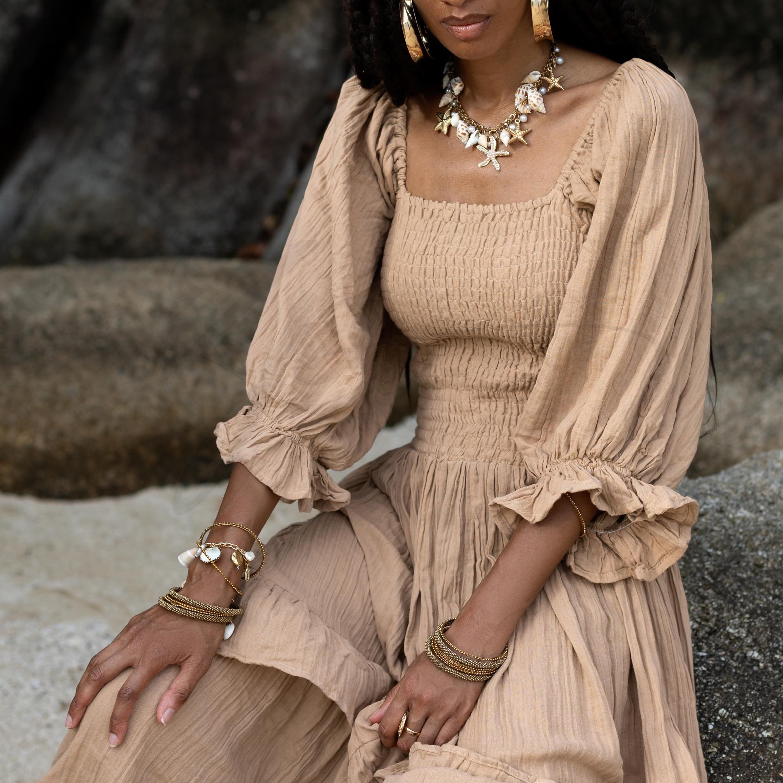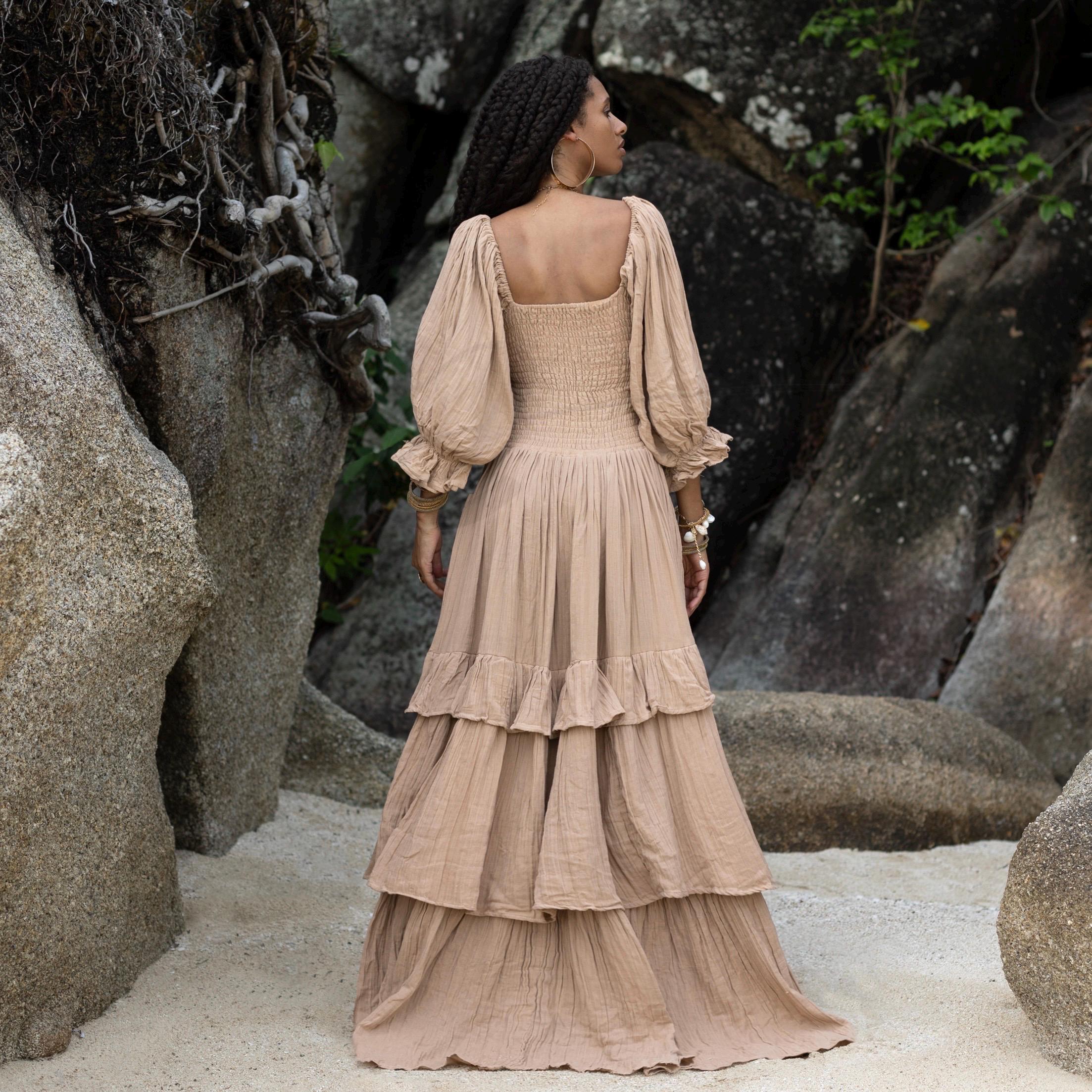 The soft, billowy puff sleeves and square neckline add a touch of vintage charm, while the breathable, lightweight fabric ensures comfort all day long. Whether you’re saying “I do” on the beach or enjoying a special celebration, this gown will move gracefully with you.