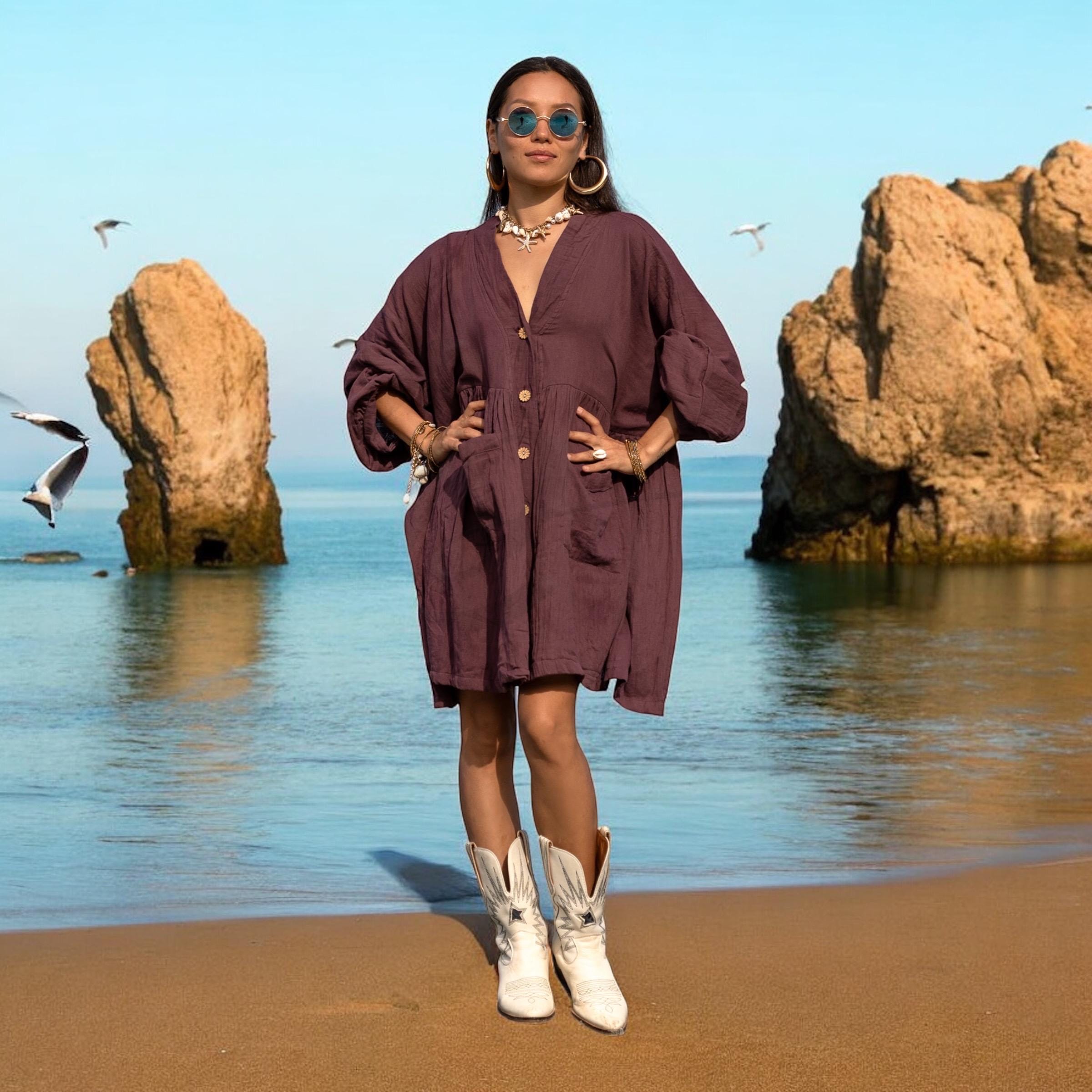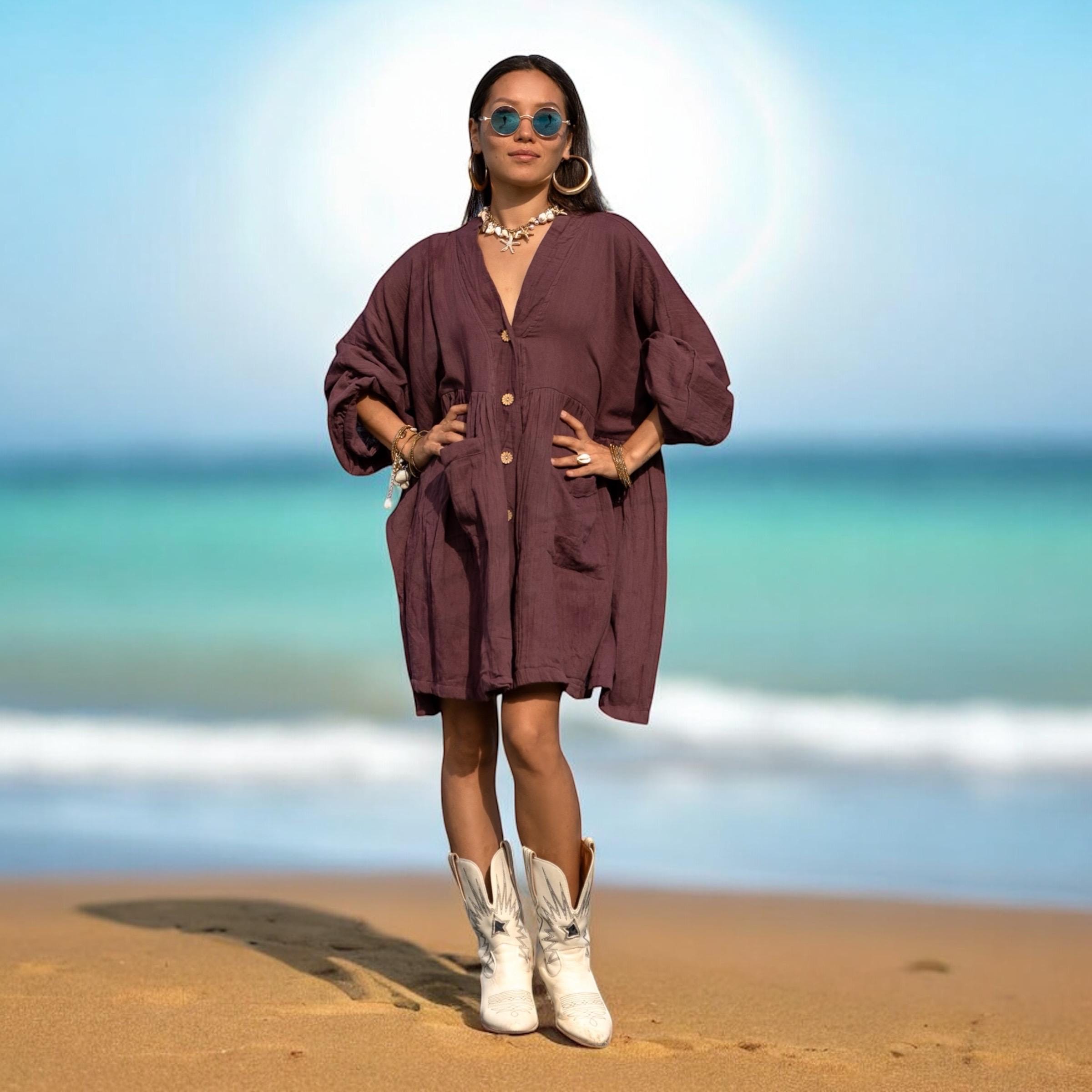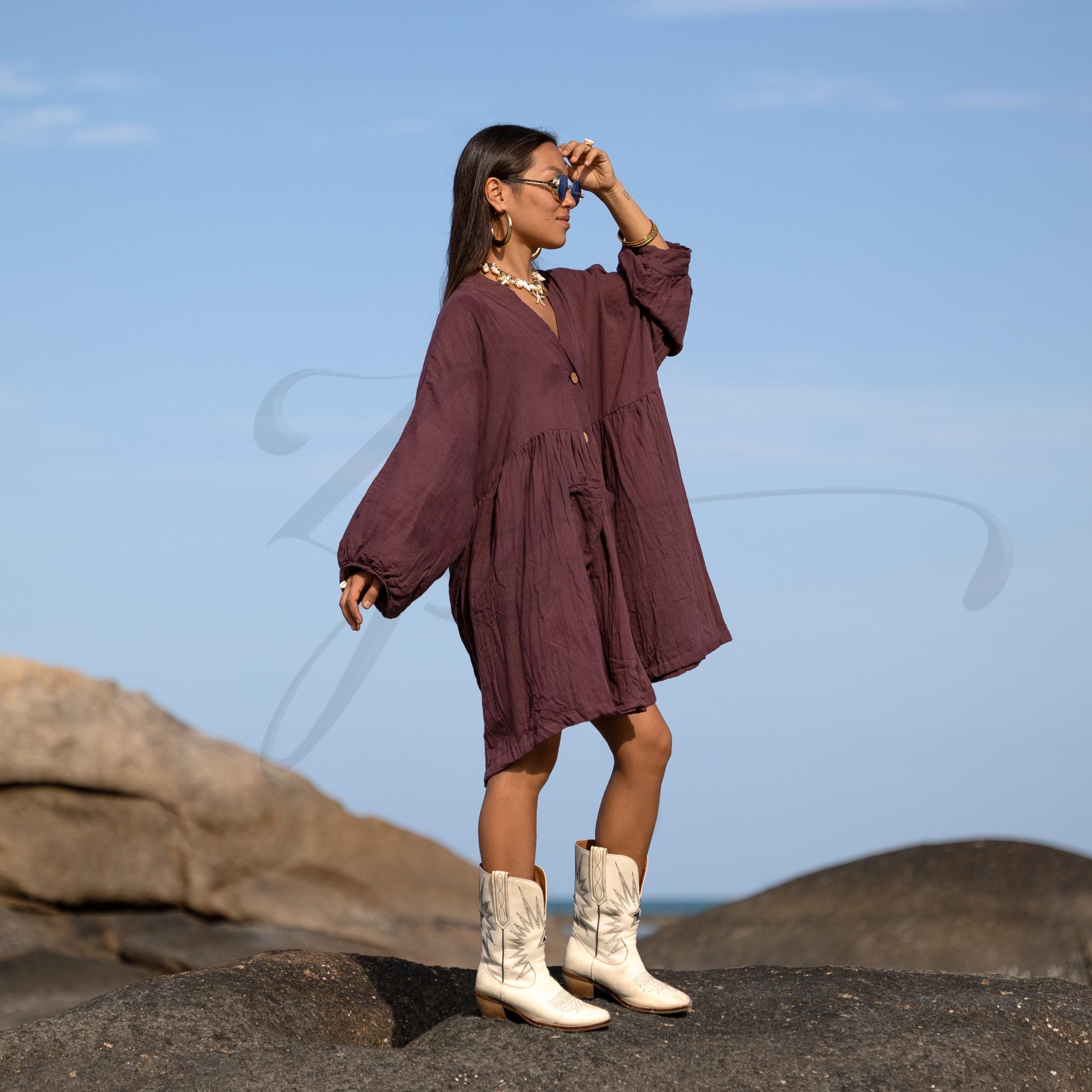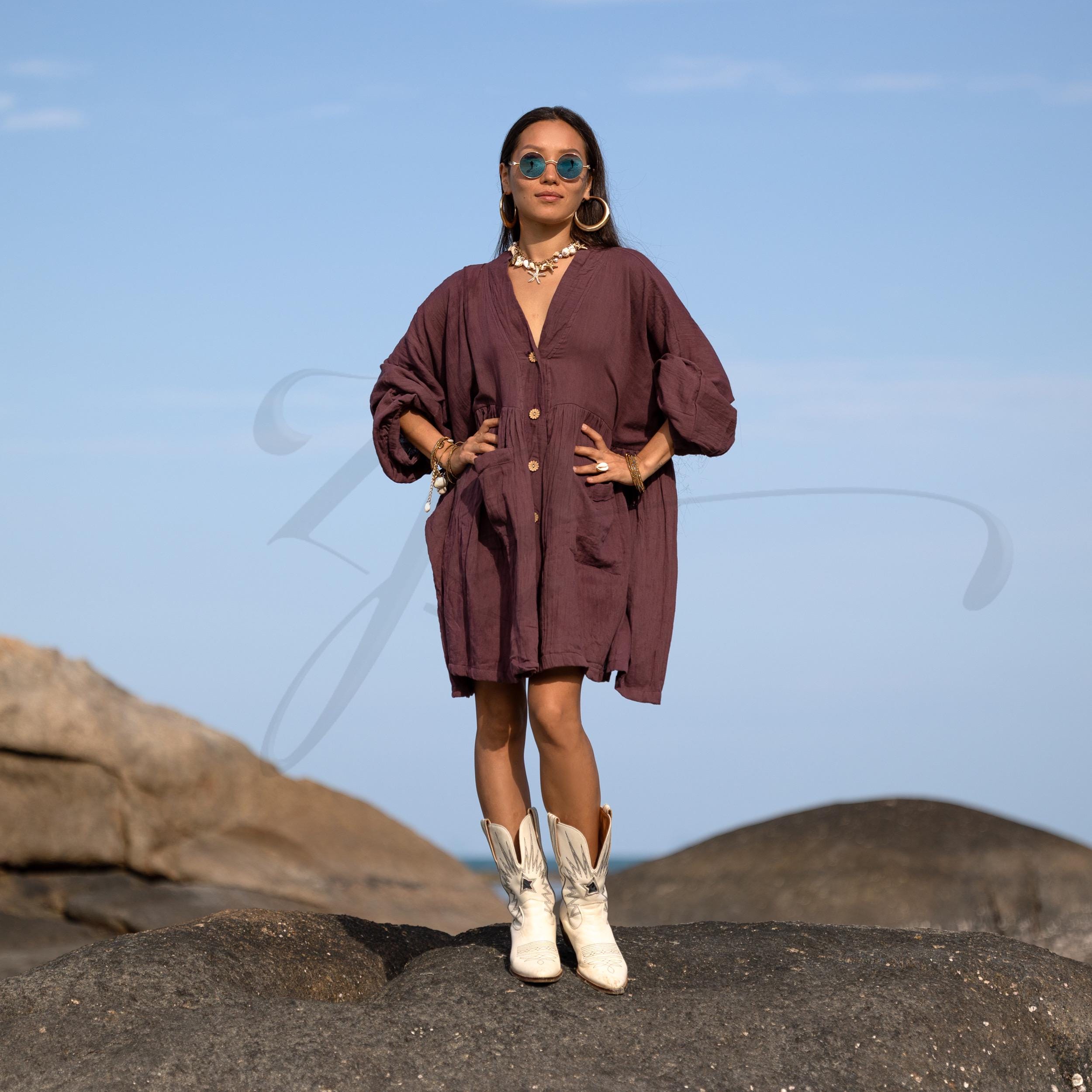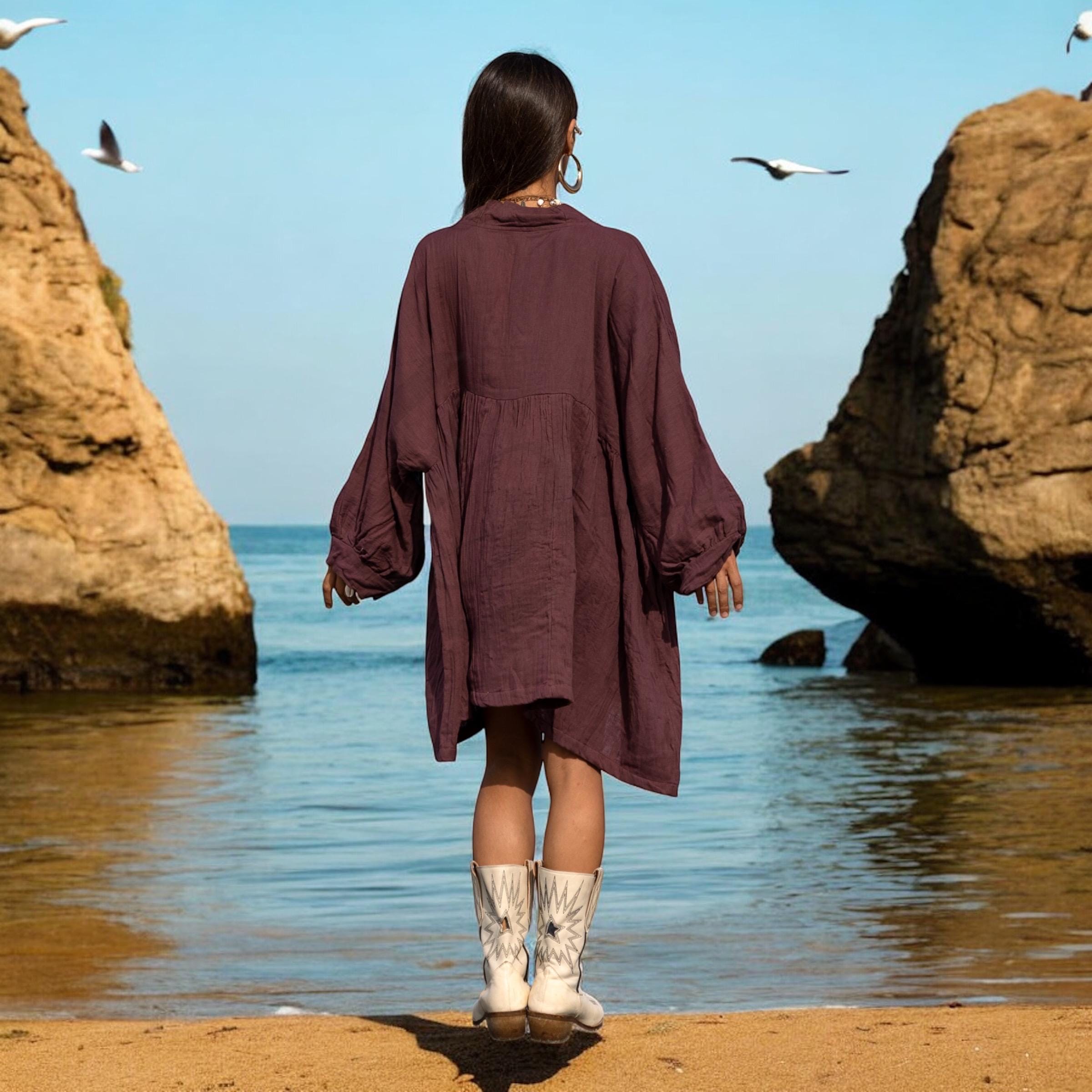 The color—Garner Grove—is a grounding plum-brown hue inspired by ripened orchard fruit and earthen twilight. Wear it as a boho tunic top, a lightweight beach cover-up, or your favorite everyday dress. From summer strolls to cozy layering, Bellina moves with you in comfort and confidence.