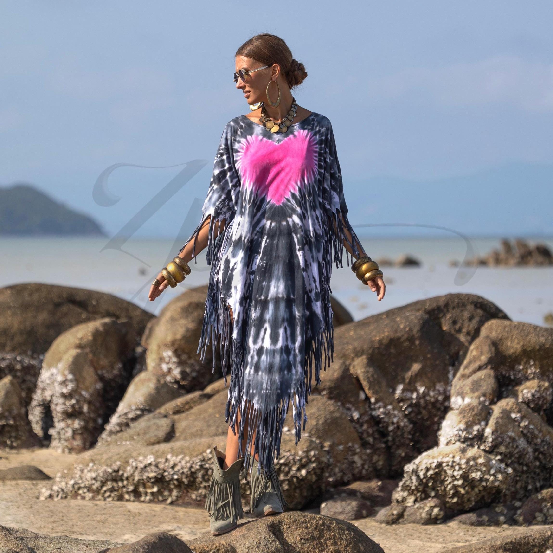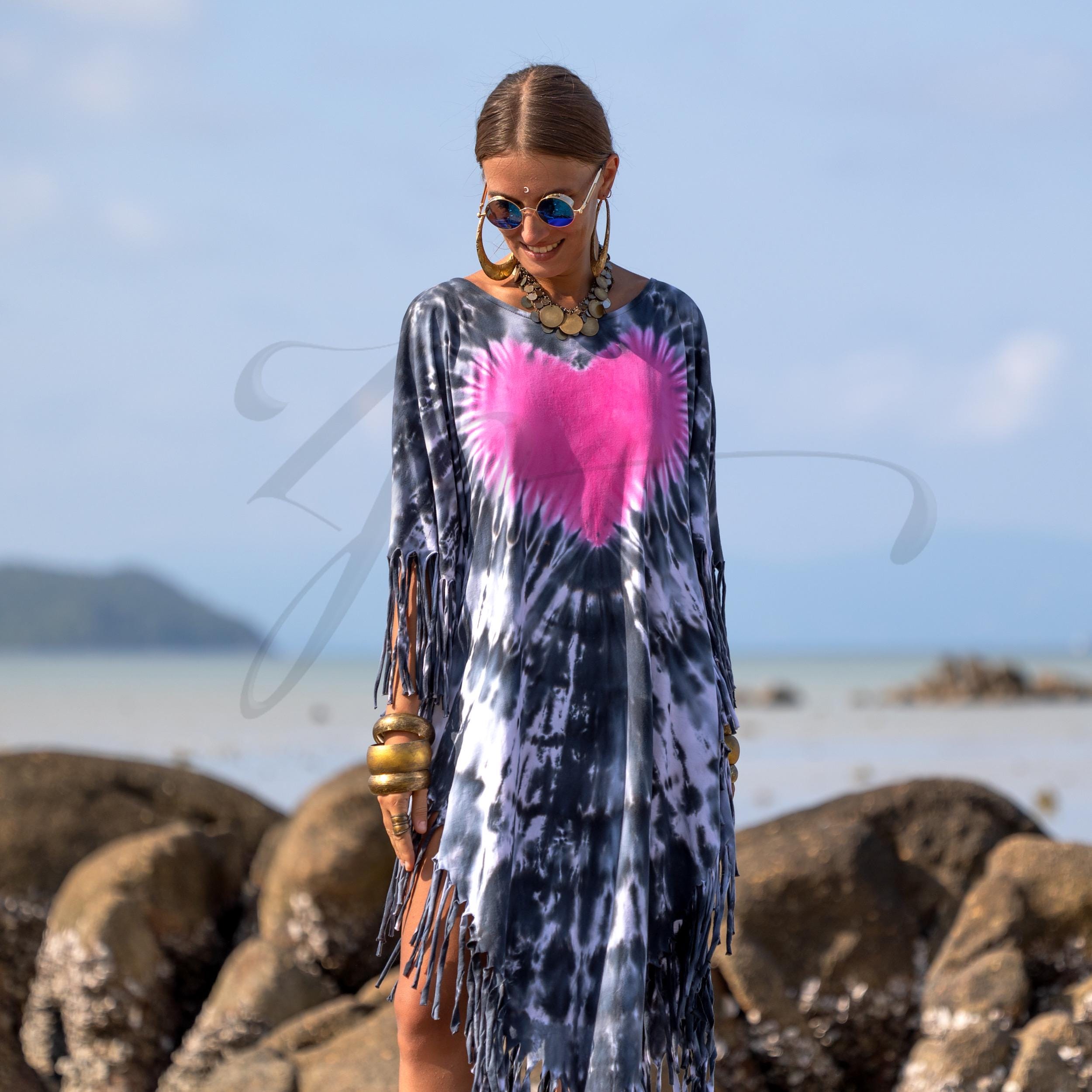 Dusken Pink Heart Tie-Dye Fringe Tunic Dress – Sacred Heart Boho Poncho, Plus Size Festival Kaftan & Beach Cover-Up