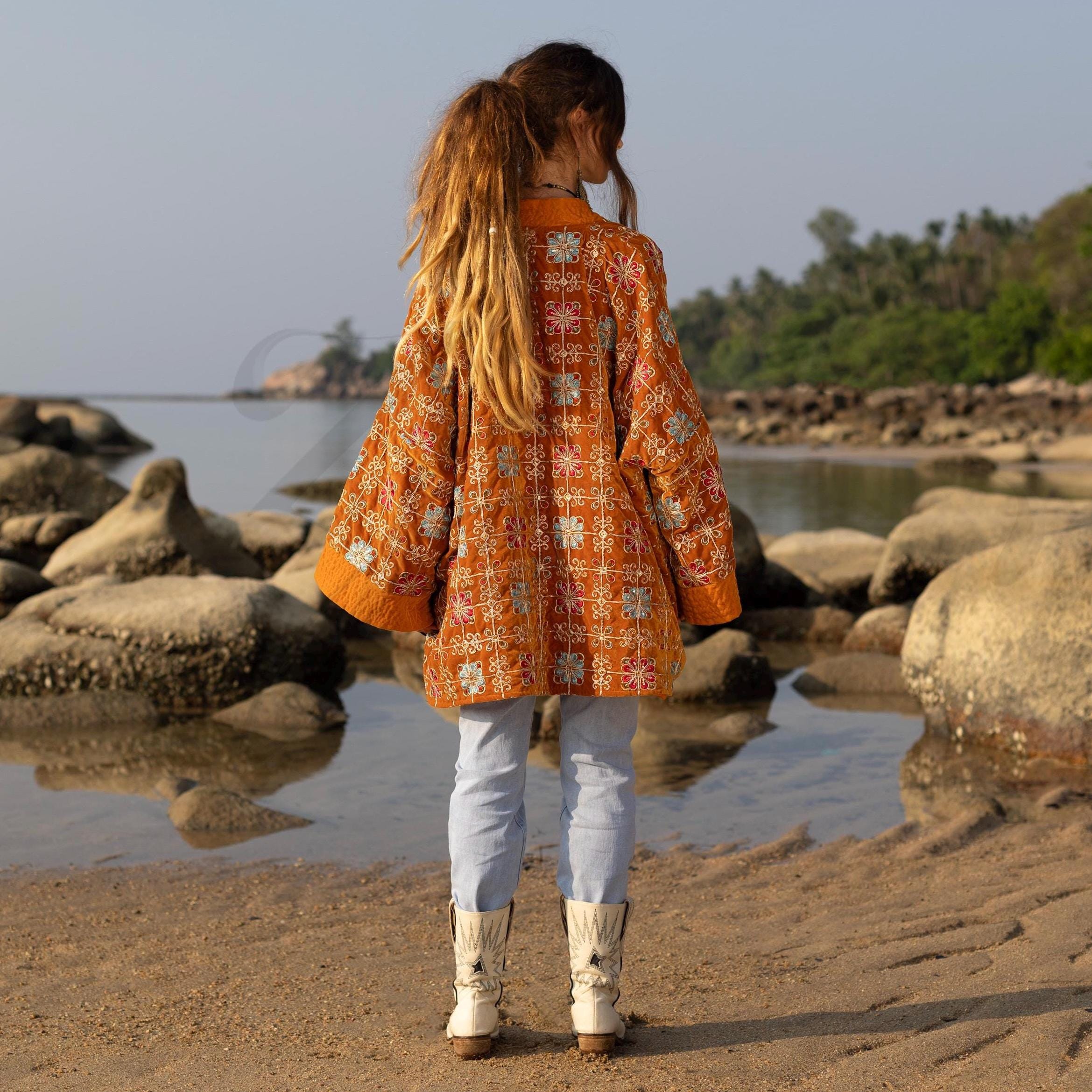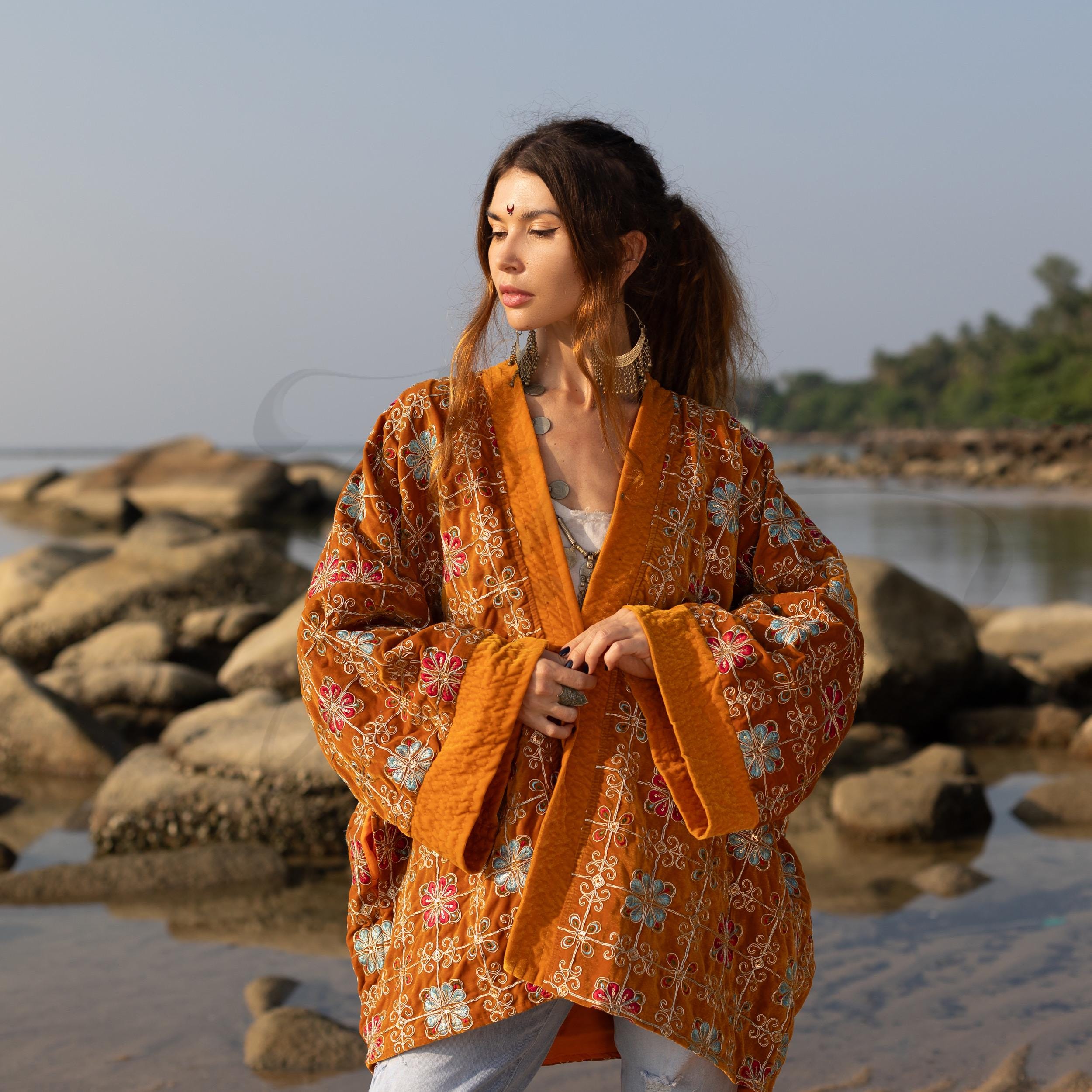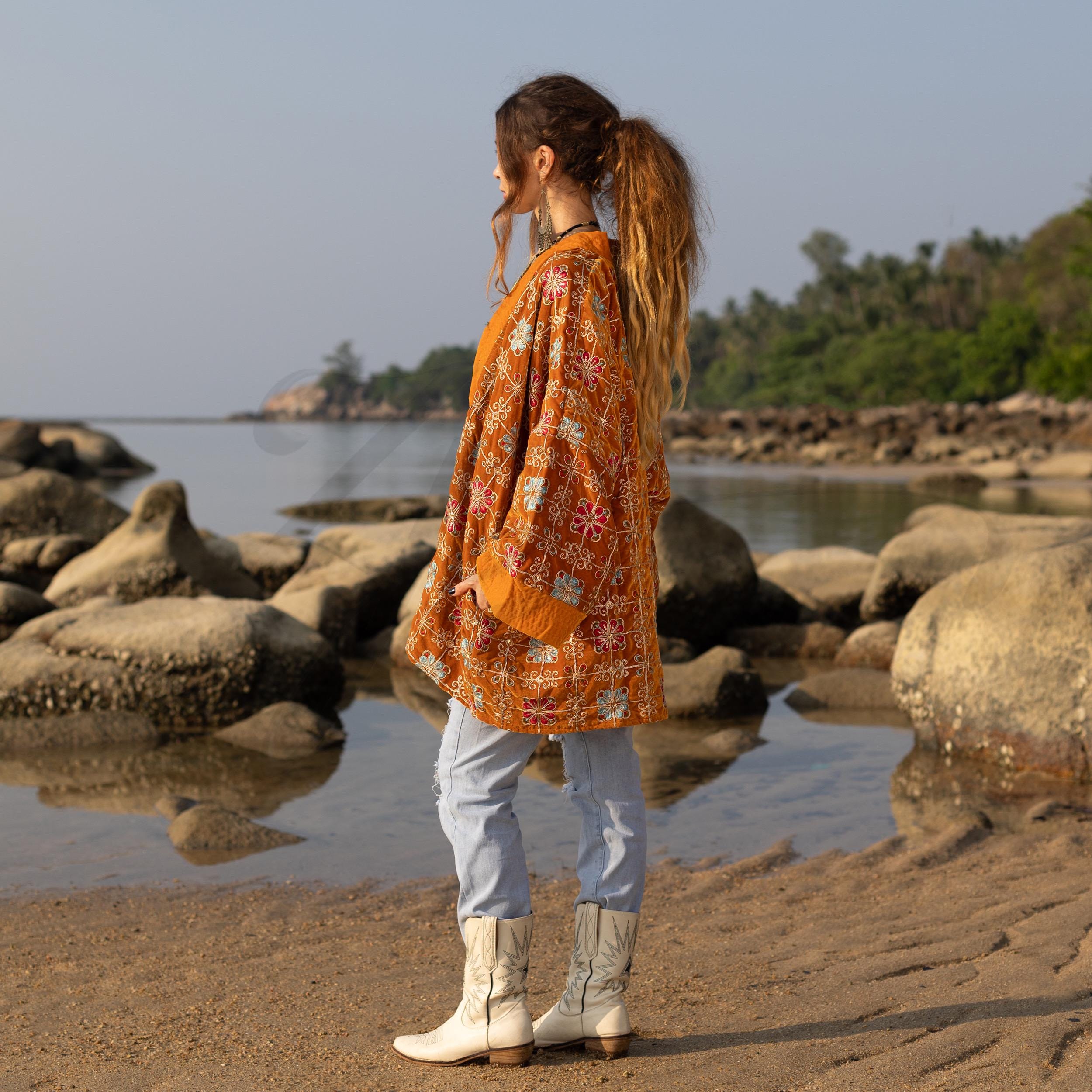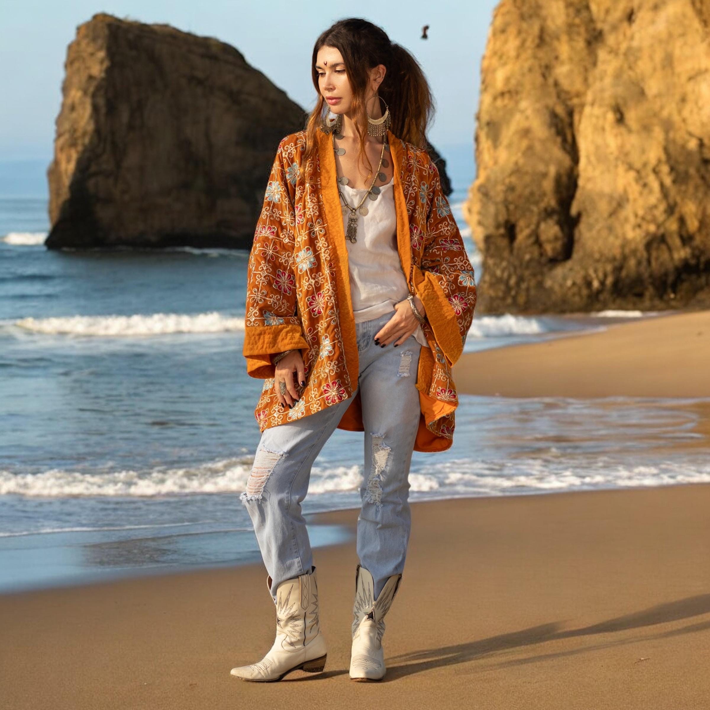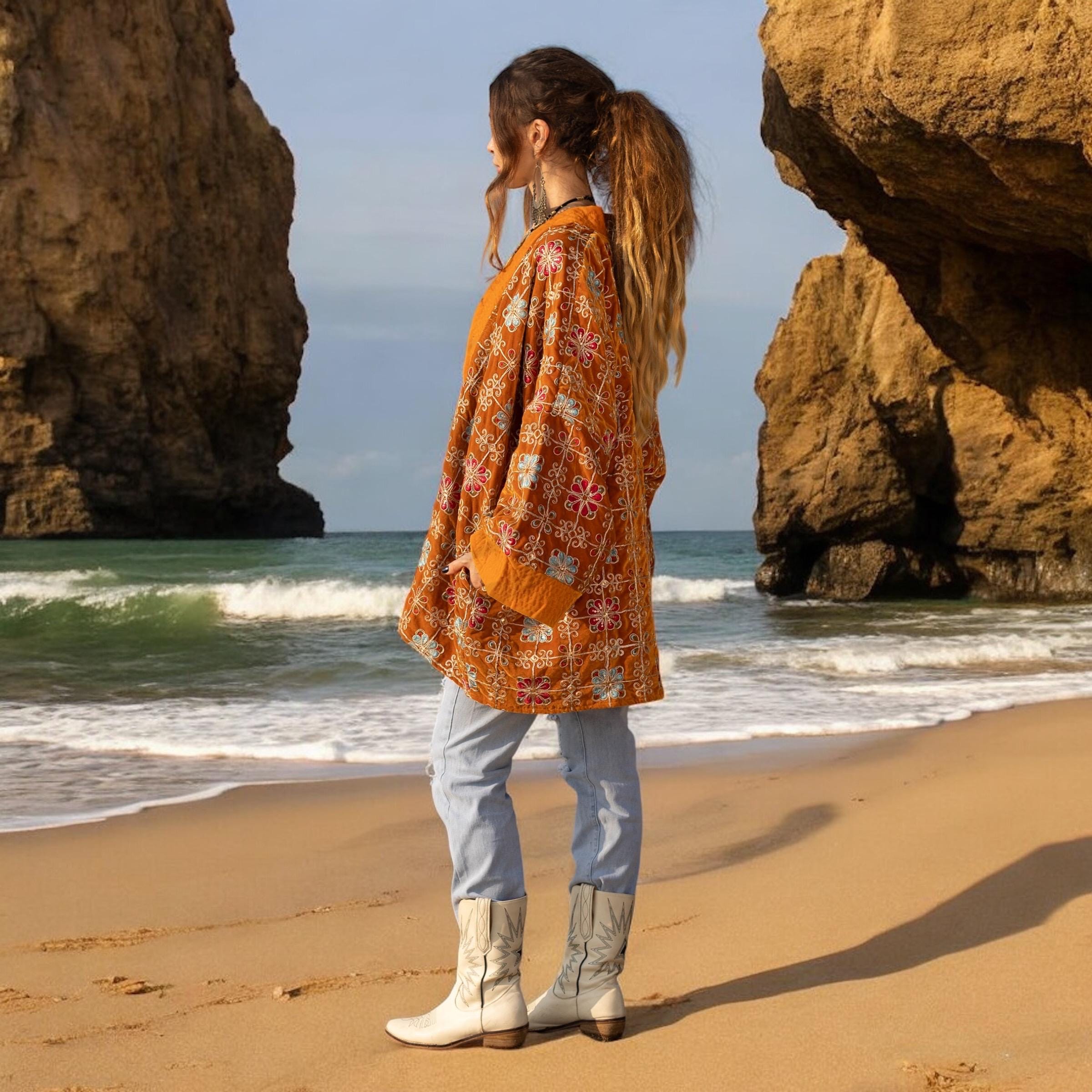 Radiate golden warmth and bohemian splendor in Mei – Saffron Bloom. This plus size velvet kimono jacket is a celebration of artisan craftsmanship, made from 100% velvet and fully lined in silky rayon for breathable, luxurious comfort. The rich saffron orange hue is elevated with detailed floral embroidery in pink, aqua, and ivory—each thread echoing stories of creativity and heritage.