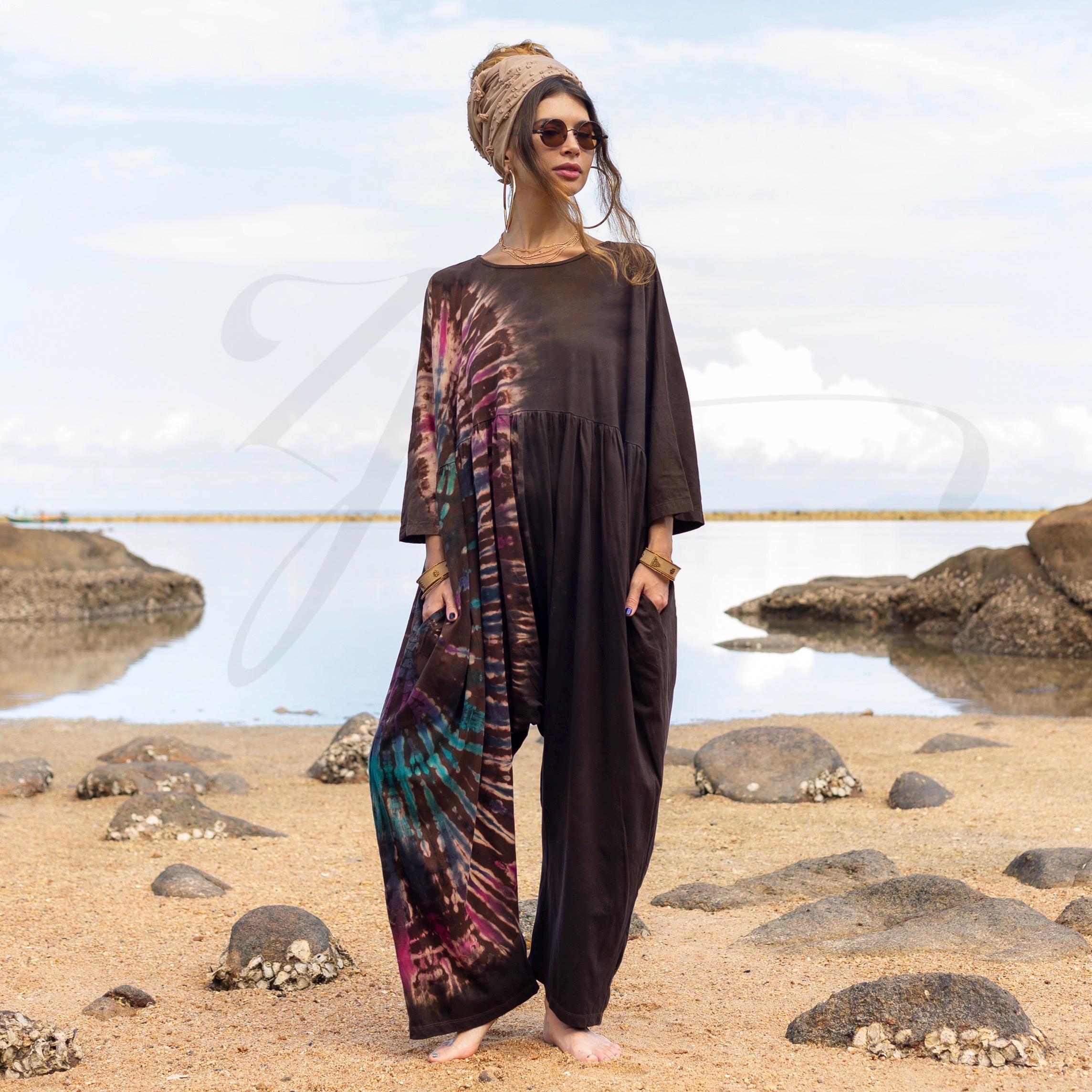 Elevate your boho style with our plus size tie-dye jumpsuit, designed for free spirits and festival-goers. This vibrant, hand-dyed romper combines comfort and trendsetting fashion, making it the perfect boho festival outfit or casual summer beach onesie.