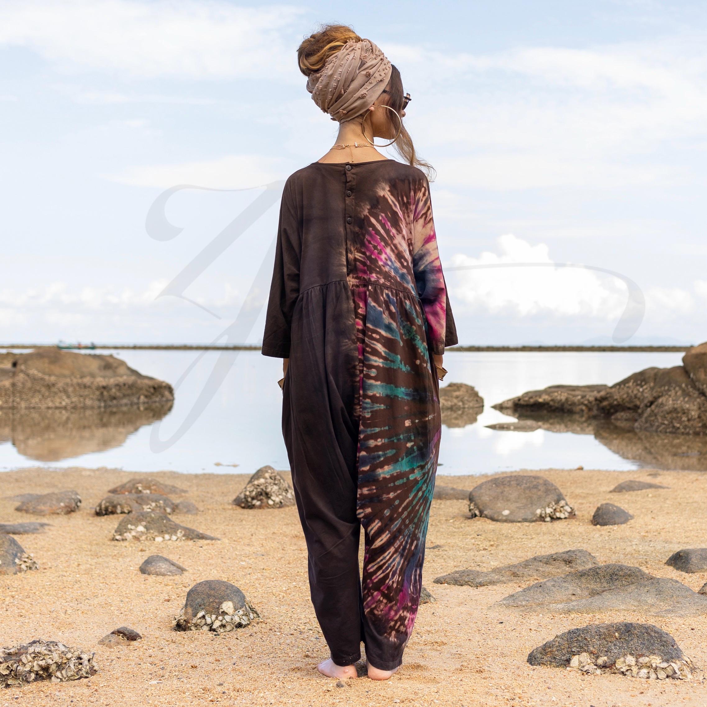 • Unique Hand-Dyed Design: Each piece is individually hand-dyed, making every jumpsuit a one-of-a-kind masterpiece.