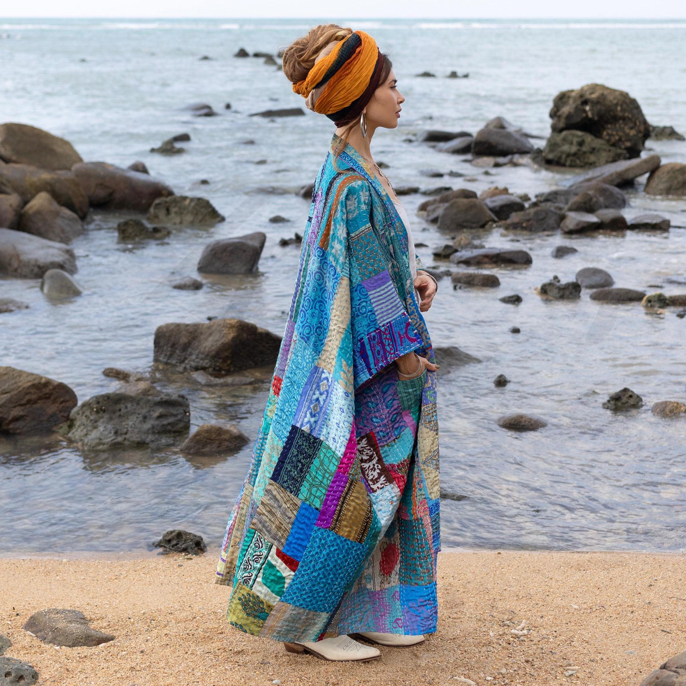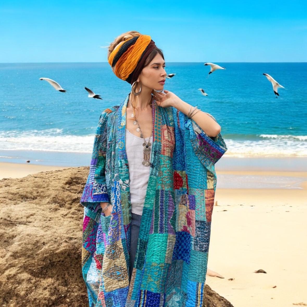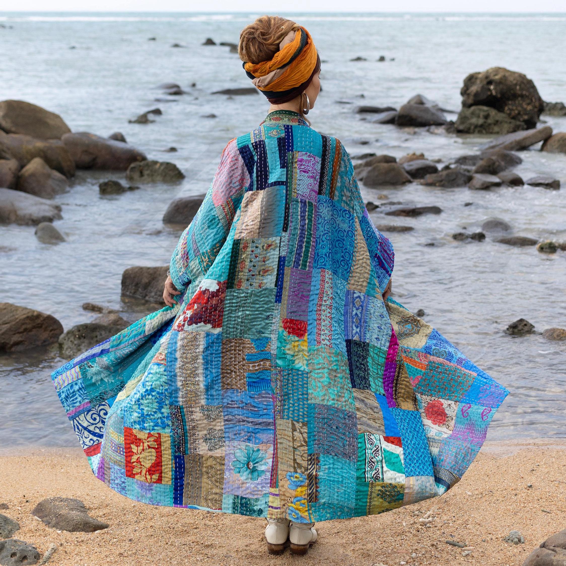 Wrap yourself in the icy magic of Glacier Prism, a luxe bohemian silk kimono duster handcrafted from shimmering quilted silk patchwork in tones of glacier blue, aqua, teal, and silver. The Ember Silk edition is a soulful fusion of comfort, craftsmanship, and ethereal beauty—thoughtfully designed to celebrate your curves and elevate every moment.