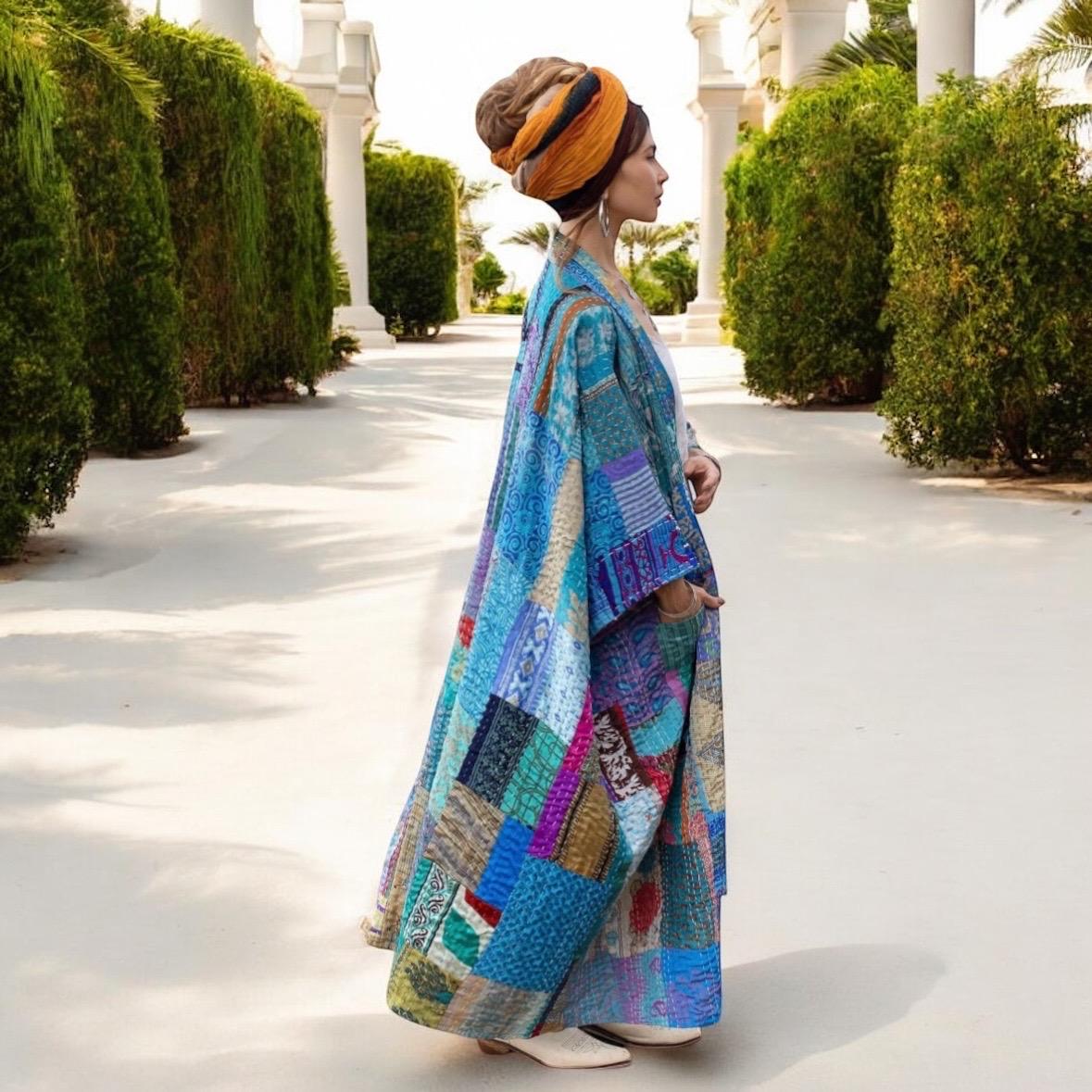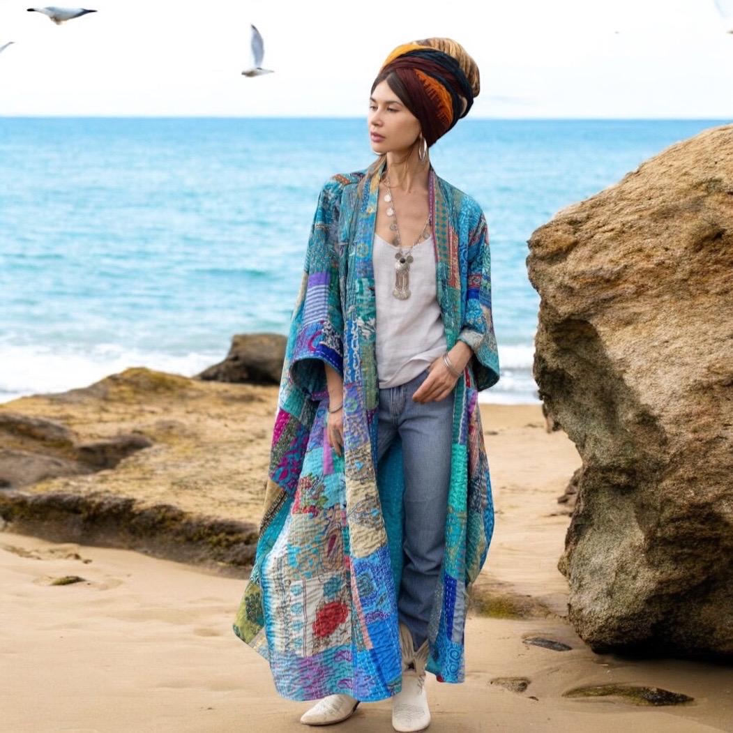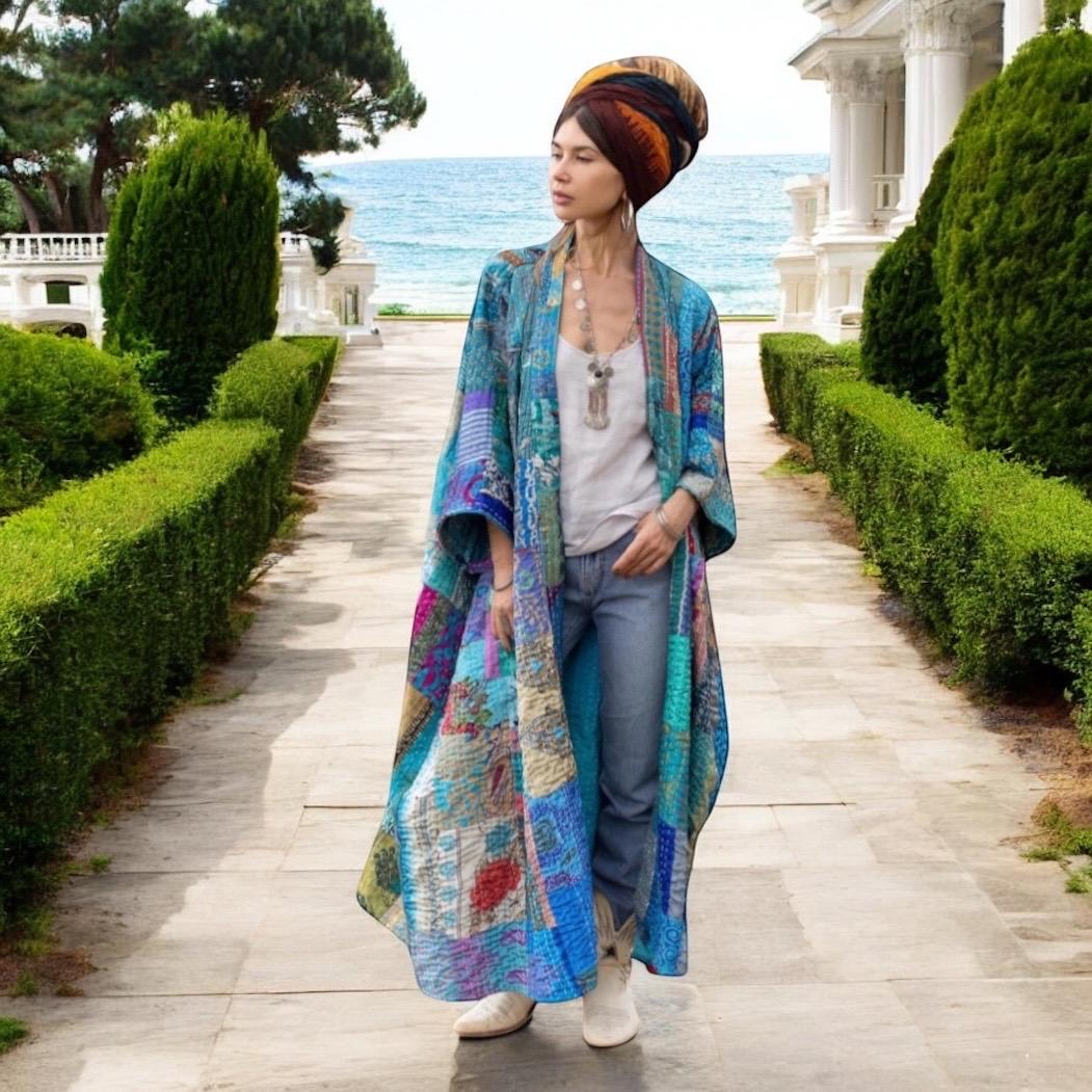 Wrap yourself in the icy magic of Glacier Prism, a luxe bohemian silk kimono duster handcrafted from shimmering quilted silk patchwork in tones of glacier blue, aqua, teal, and silver. The Ember Silk edition is a soulful fusion of comfort, craftsmanship, and ethereal beauty—thoughtfully designed to celebrate your curves and elevate every moment.