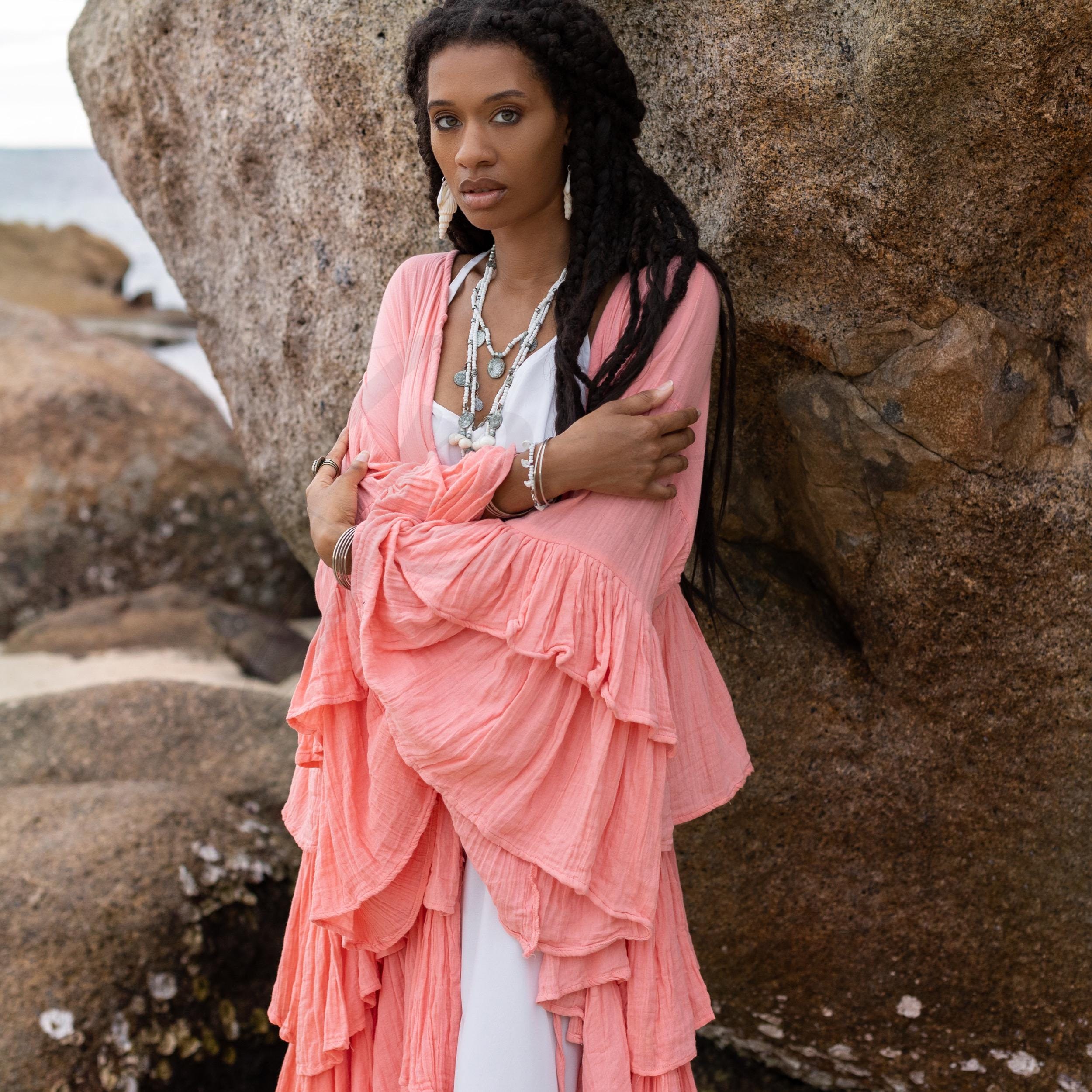 With its eye-catching ruffle detail, this festival kimono is truly unique. The slouchy longline silhouette and slight stretch ensure a flattering and comfortable fit for all. Whether you're attending a wedding, hitting a festival, or enjoying a resort getaway, this versatile piece will make you feel like a goddess.