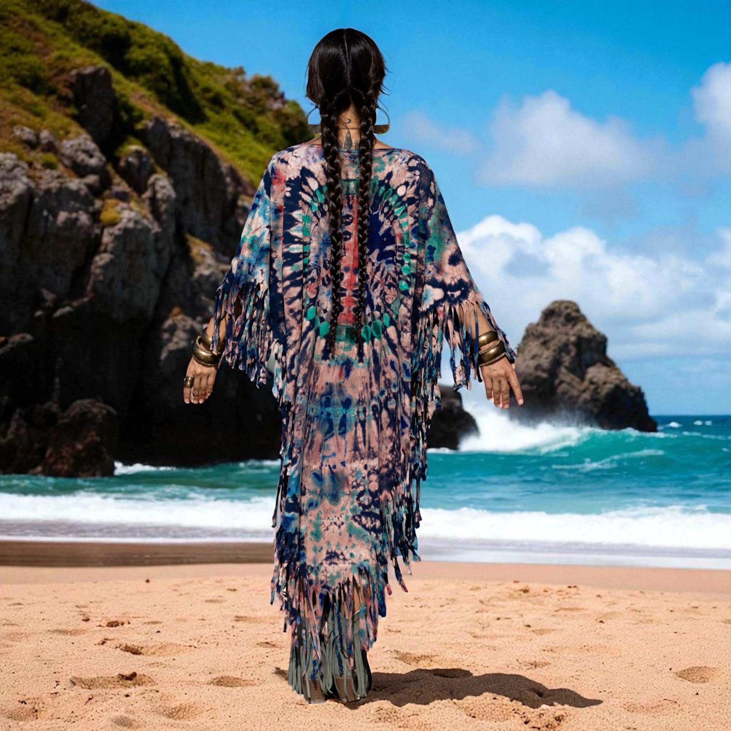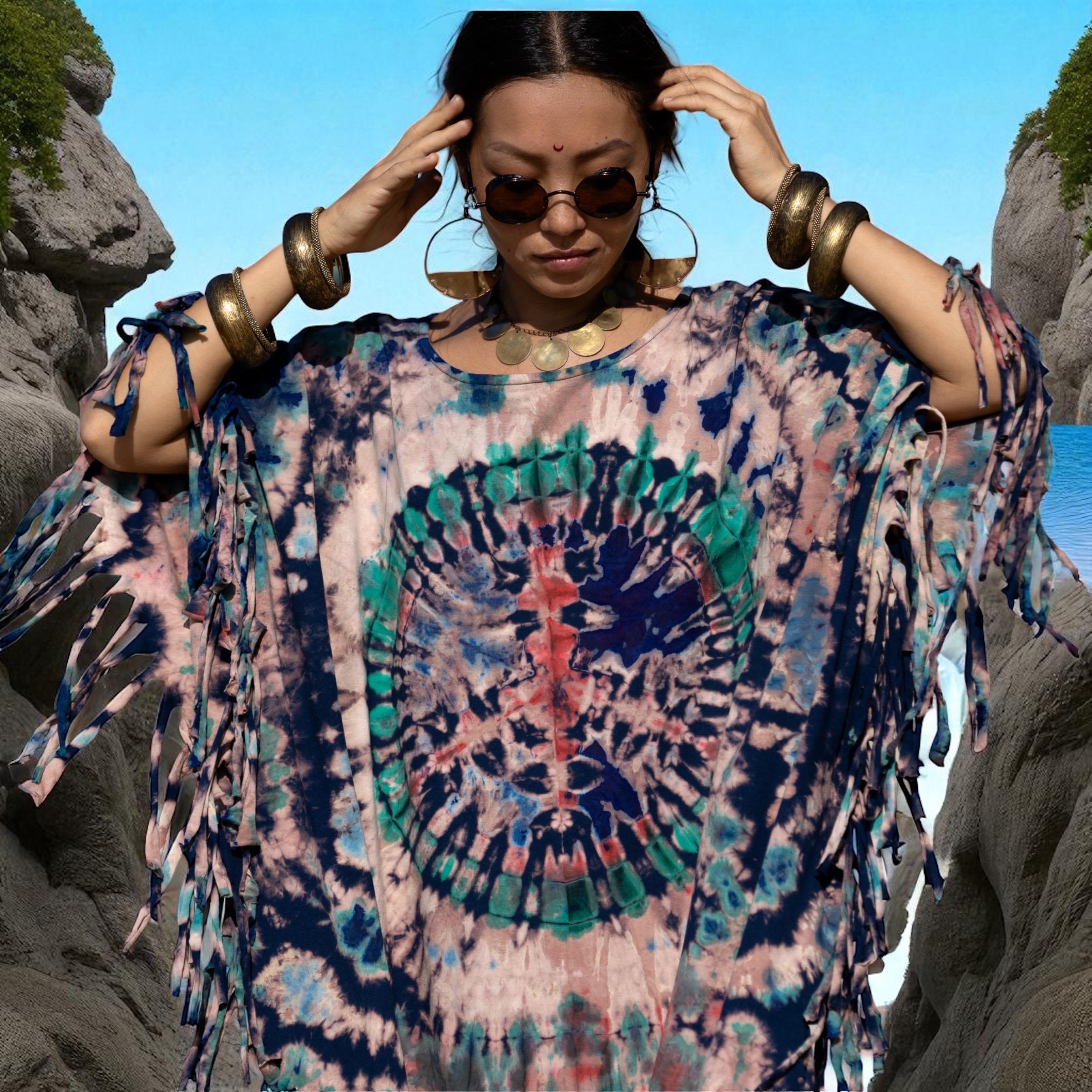 Moonlit Reef – Plus Size Boho Tie-Dye Fringe Tunic Dress | Handmade Festival Kaftan, Cotton Poncho & Beach Cover-Up by ZinniaPearl