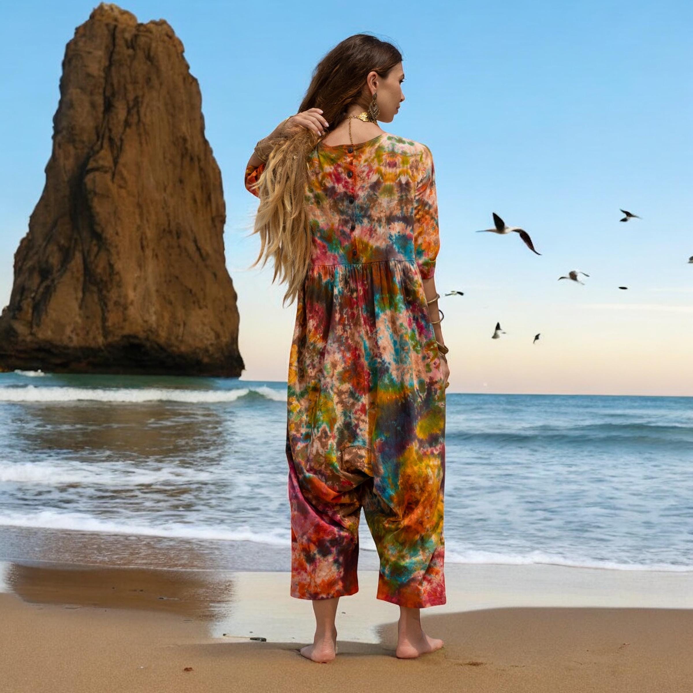 Step into soulful ease with Sadie in Sunset Bloom — a one-of-a-kind, hand-dyed cotton jumpsuit bursting with intention, color, and comfort. Designed for curves and crafted for movement, this flowing one-size-plus boho romper features a radiant peace symbol design surrounded by vibrant hues of sunset maroon, golden amber, forest teal, and raspberry flame.