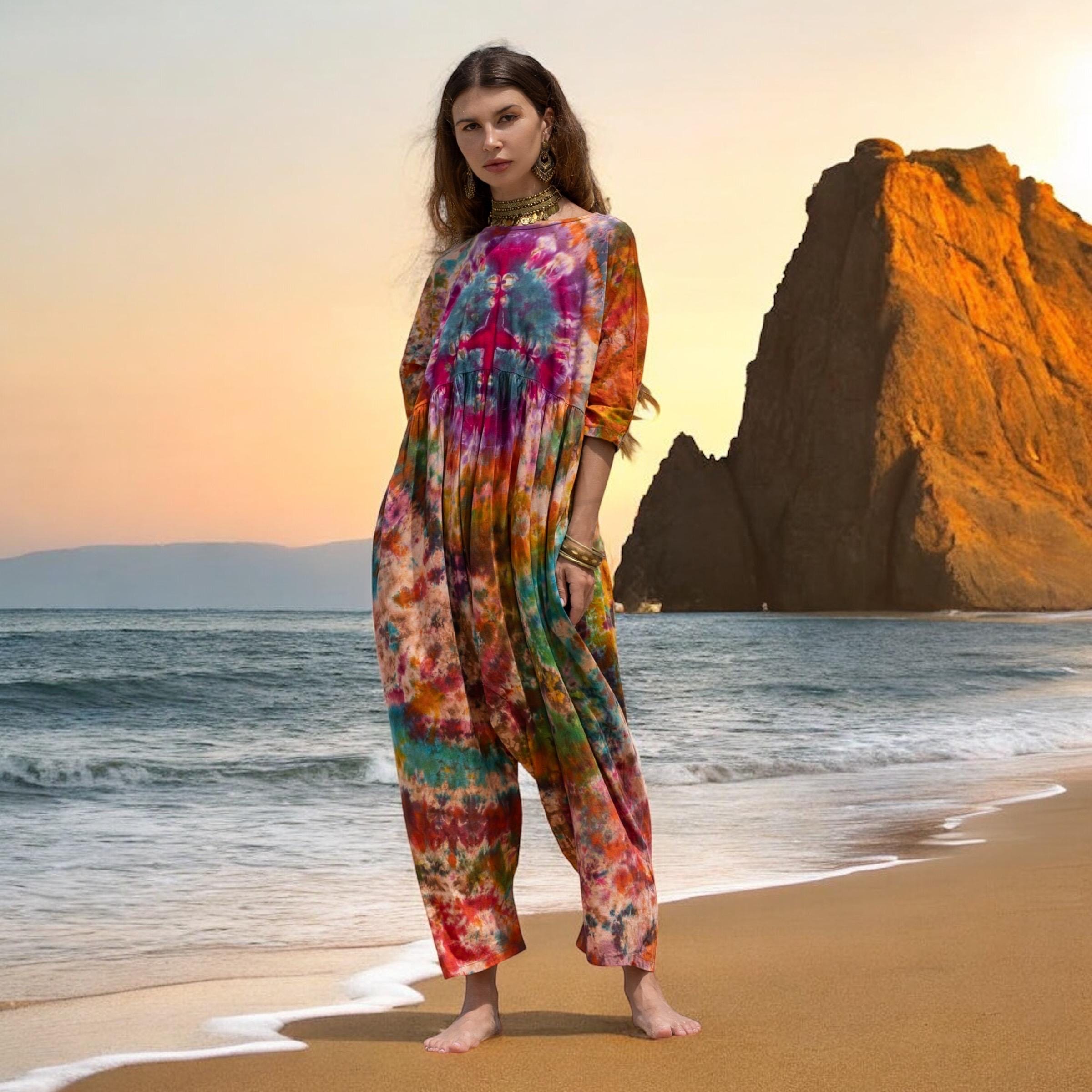 Plus Size Tie-Dye Jumpsuit: Handmade Cotton Romper with Peace Symbol – Sadie
