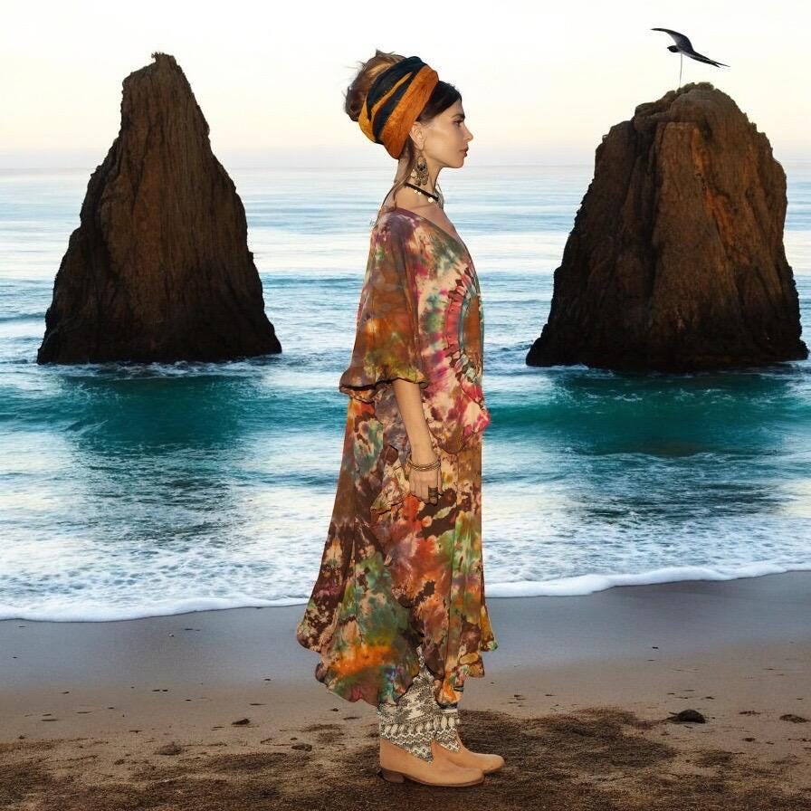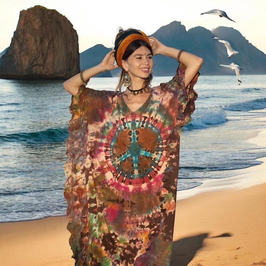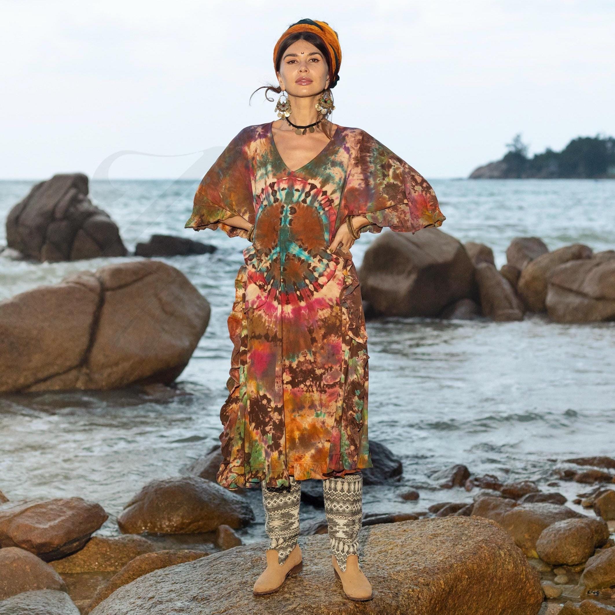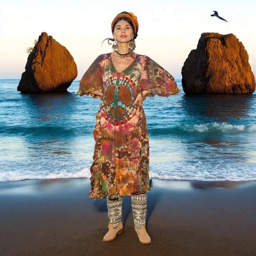 Step into your most vibrant self with the Mystic Mirage Desert Prism—a hand-dyed, plus size-friendly kaftan tunic dress bursting with rich, earthy rainbow hues. Designed with a bold teal and sienna peace sign radiating from the center, this one-of-a-kind piece blends soulful symbolism, artisan craftsmanship, and flowing boho ease.