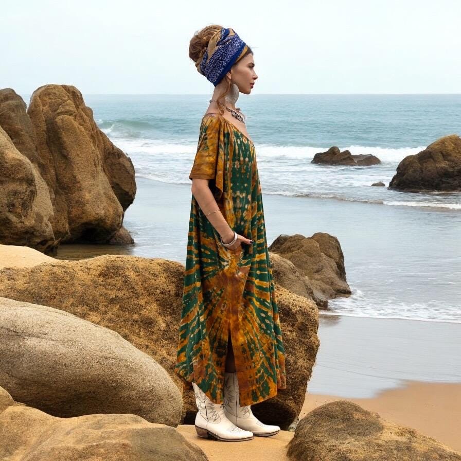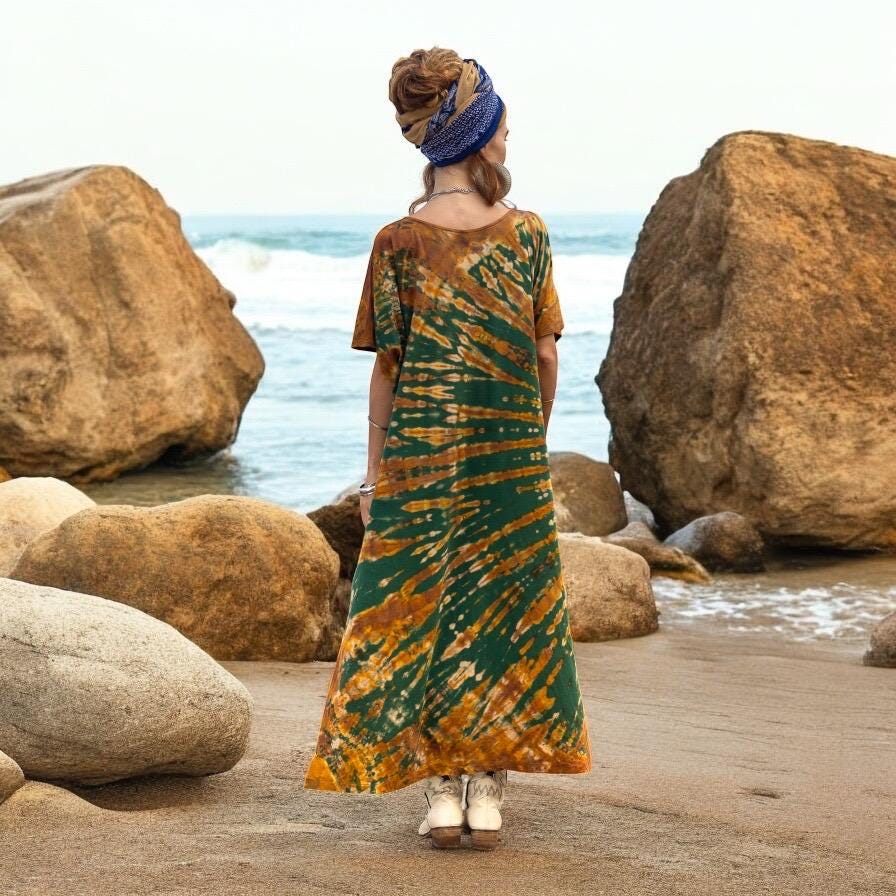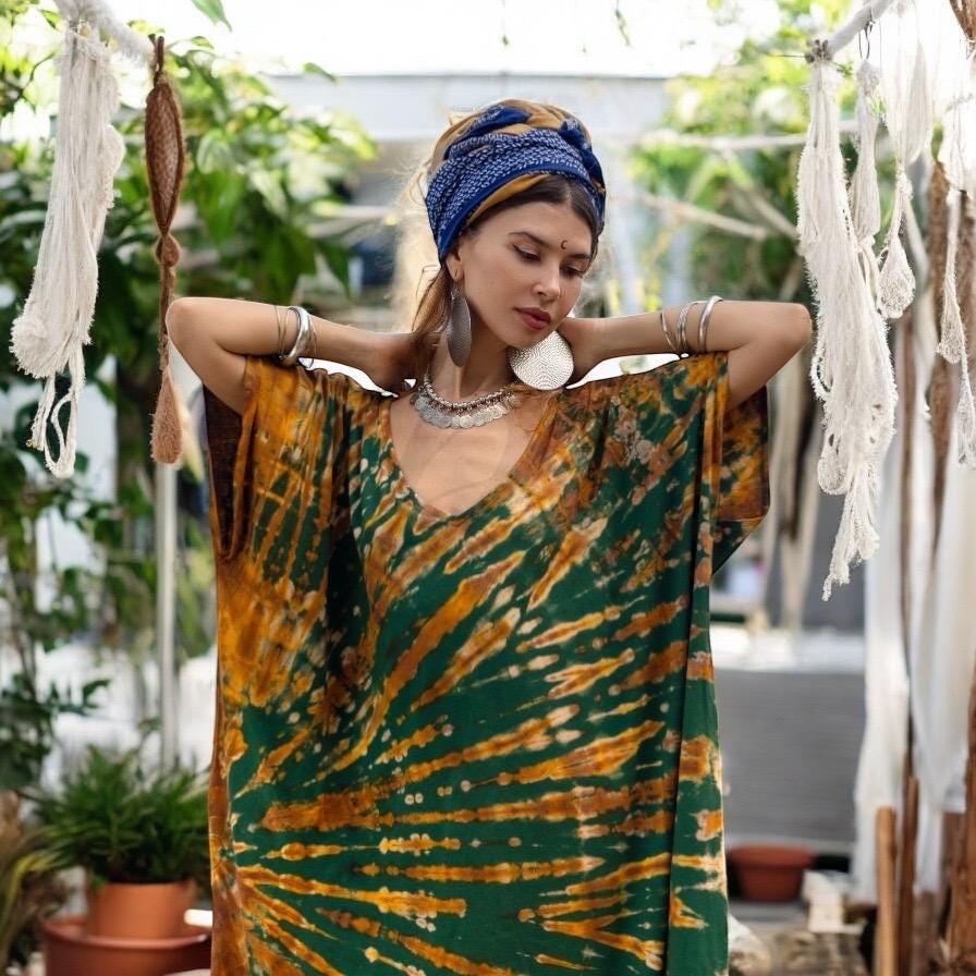 Infused with deep earth tones and radiant bohemian spirit, the Nora Kaftan in Forest Amber is a wearable work of art. Each one is hand-dyed in bold sweeps of emerald, golden amber, and burnt saffron—offering effortless beauty for curves of every kind. This relaxed cotton maxi floats with you from beach strolls to backyard rituals, styled with soul and sewn with care.
