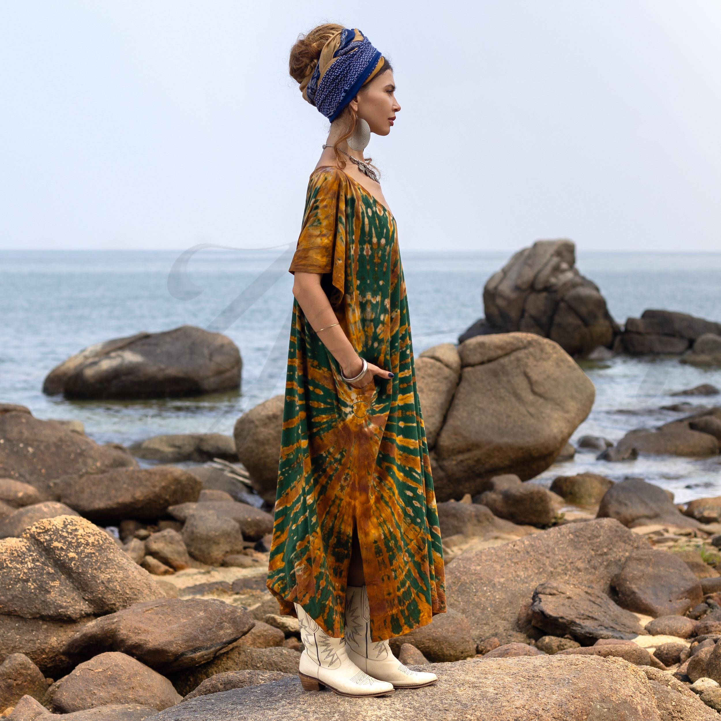 Plus Size Tie Dye Kaftan Dress: Handmade Boho Cotton Maxi with Pockets – Nora