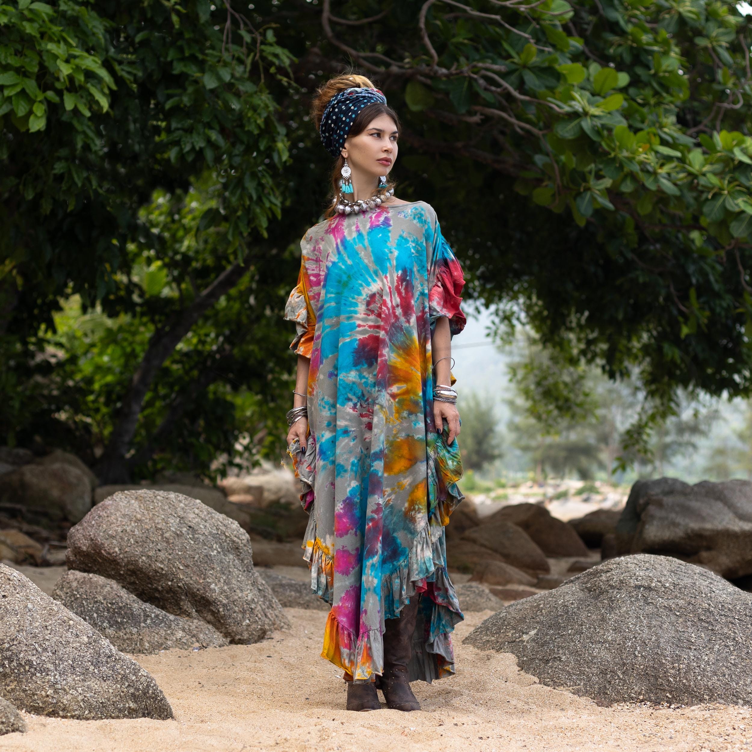 Wrap yourself in color, confidence, and artisan soul with the Ema Dreamdust Dress—a luxurious, plus-size-friendly boho kaftan handmade for resort escapes, beach days, and festival adventures. This free-size maxi dress is tie-dyed by hand in swirling tones of plum, turquoise, gold, and violet over a smoky grey base—each piece a one-of-a-kind creation.