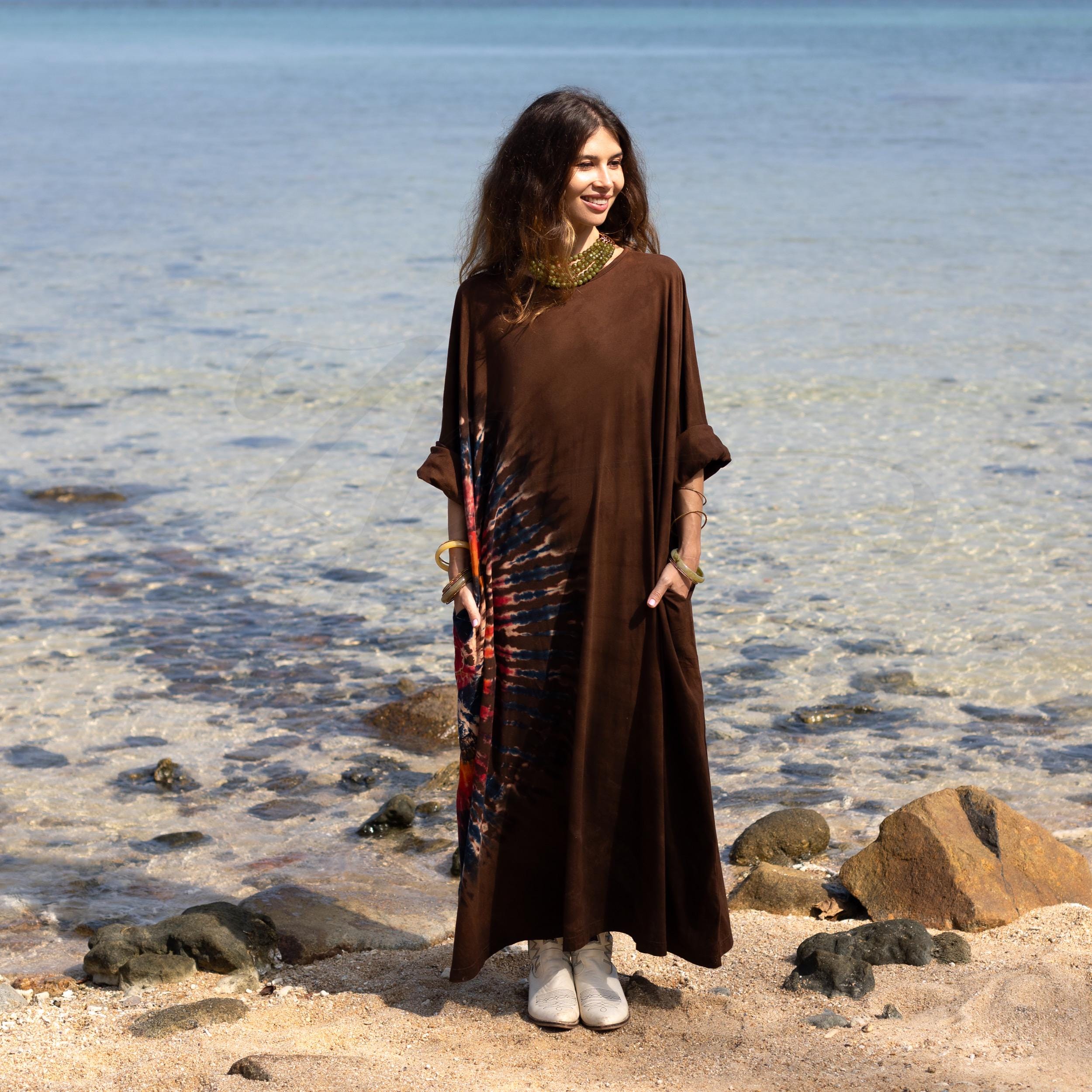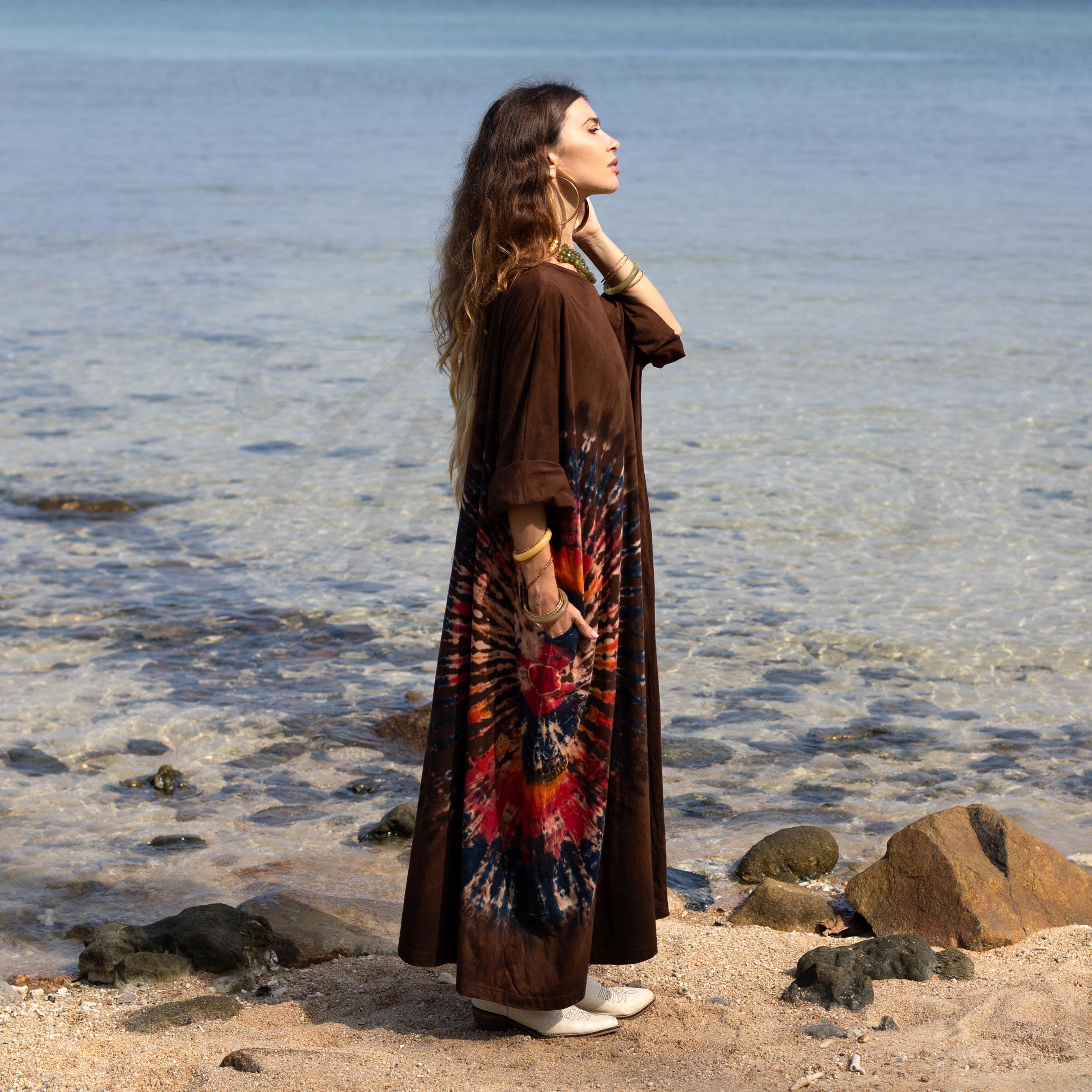 Boho Maxi Dress – Tie Dye Crescent Moon – Cocoa Brown & Crimson – Euphoria Dress – Festival Dress