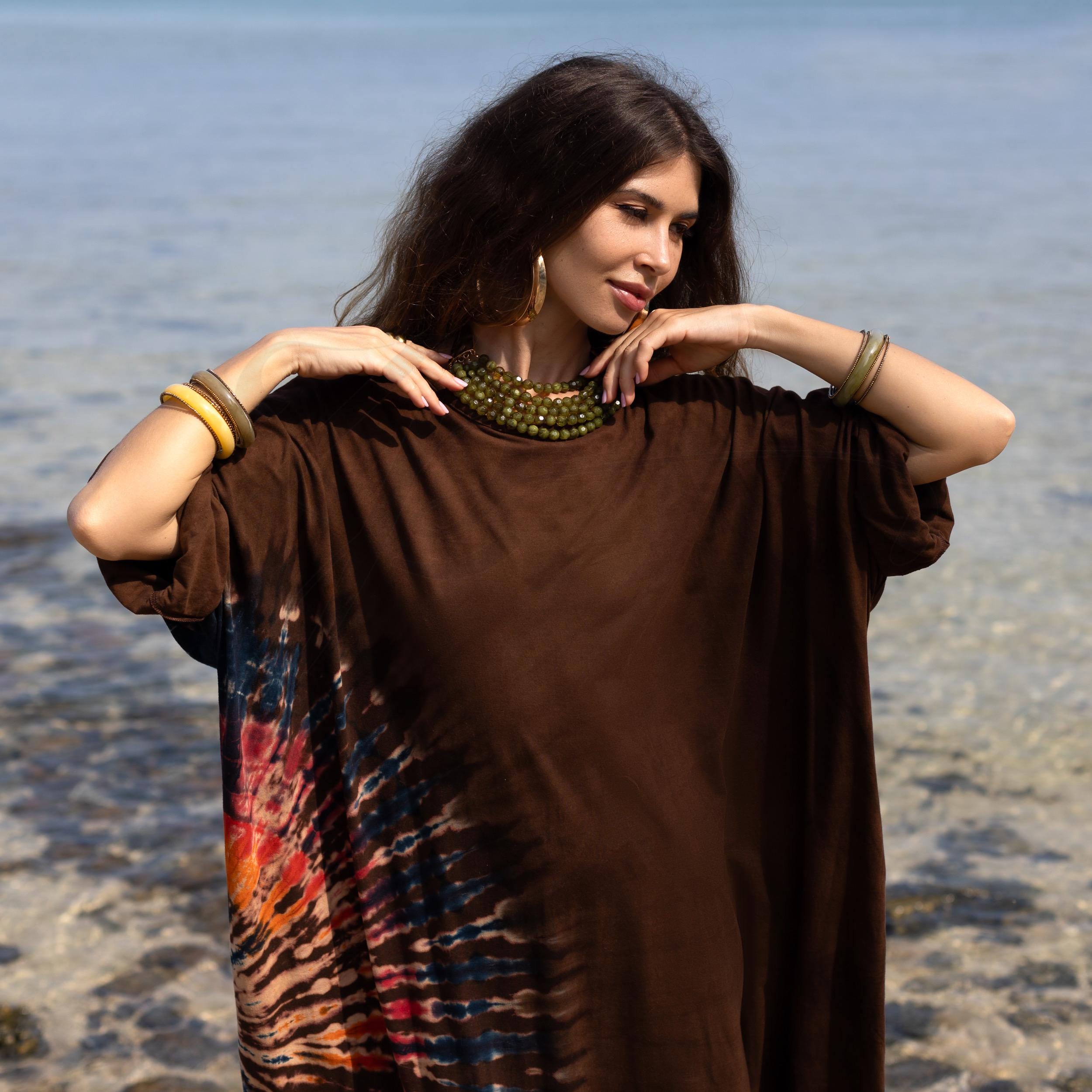 Embrace your inner bohemian goddess with the Crescent Moon Burst Euphoria Maxi Dress. This stunning, hand-dyed gown is a one-of-a-kind work of art, blending earthy cocoa browns with dazzling bursts of crimson, sapphire, and amber in a mesmerizing crescent moon design. Imagine yourself twirling on the beach, the soft cotton caressing your skin as the sun catches the rich colors. This dress is an invitation to dance, to celebrate, and to express your free-spirited soul.