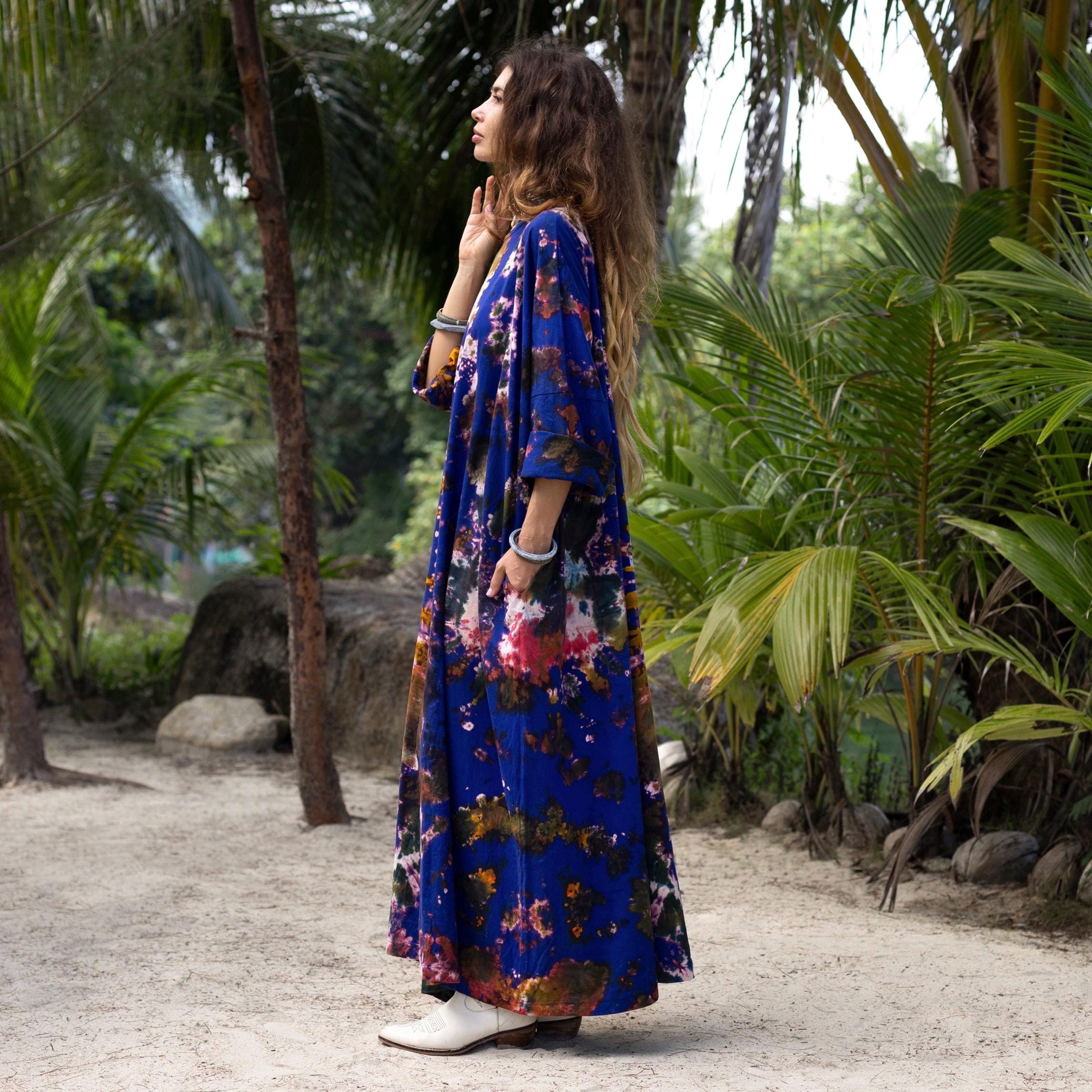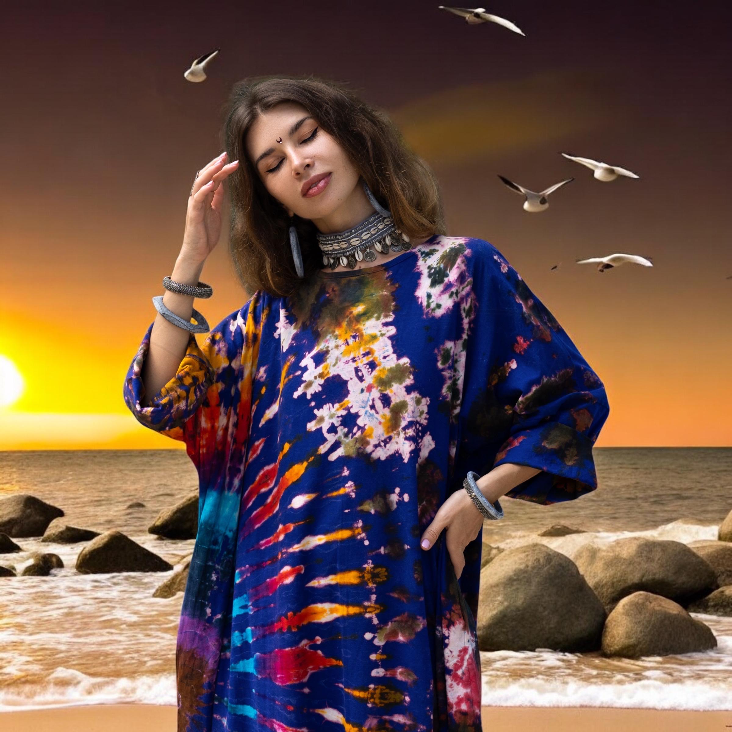 Drift into a cosmic dream with the Indigo Nebula Euphoria Tie Dye Maxi Dress, a statement piece for free-spirited souls. Hand-dyed in celestial hues of indigo, violet, and golden swirls, this plus size dress blends artistry with effortless comfort. Its flowy maxi dress silhouette flatters every curve, making it a must-have for boho lovers, festival-goers, and beach day dreamers.