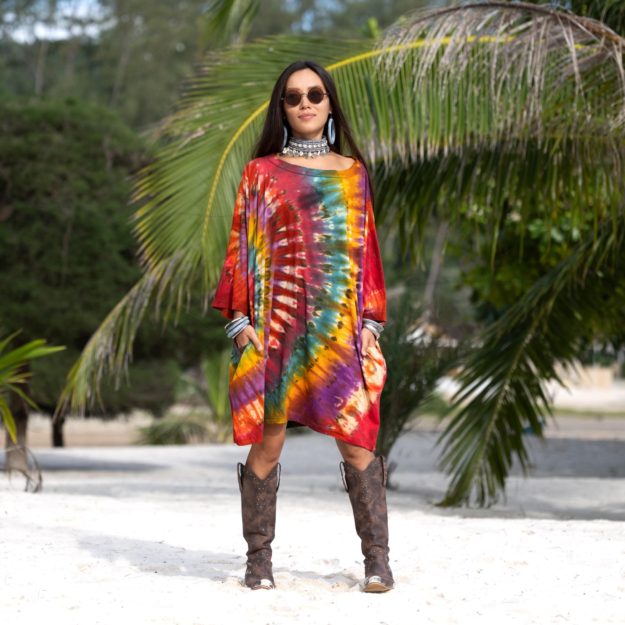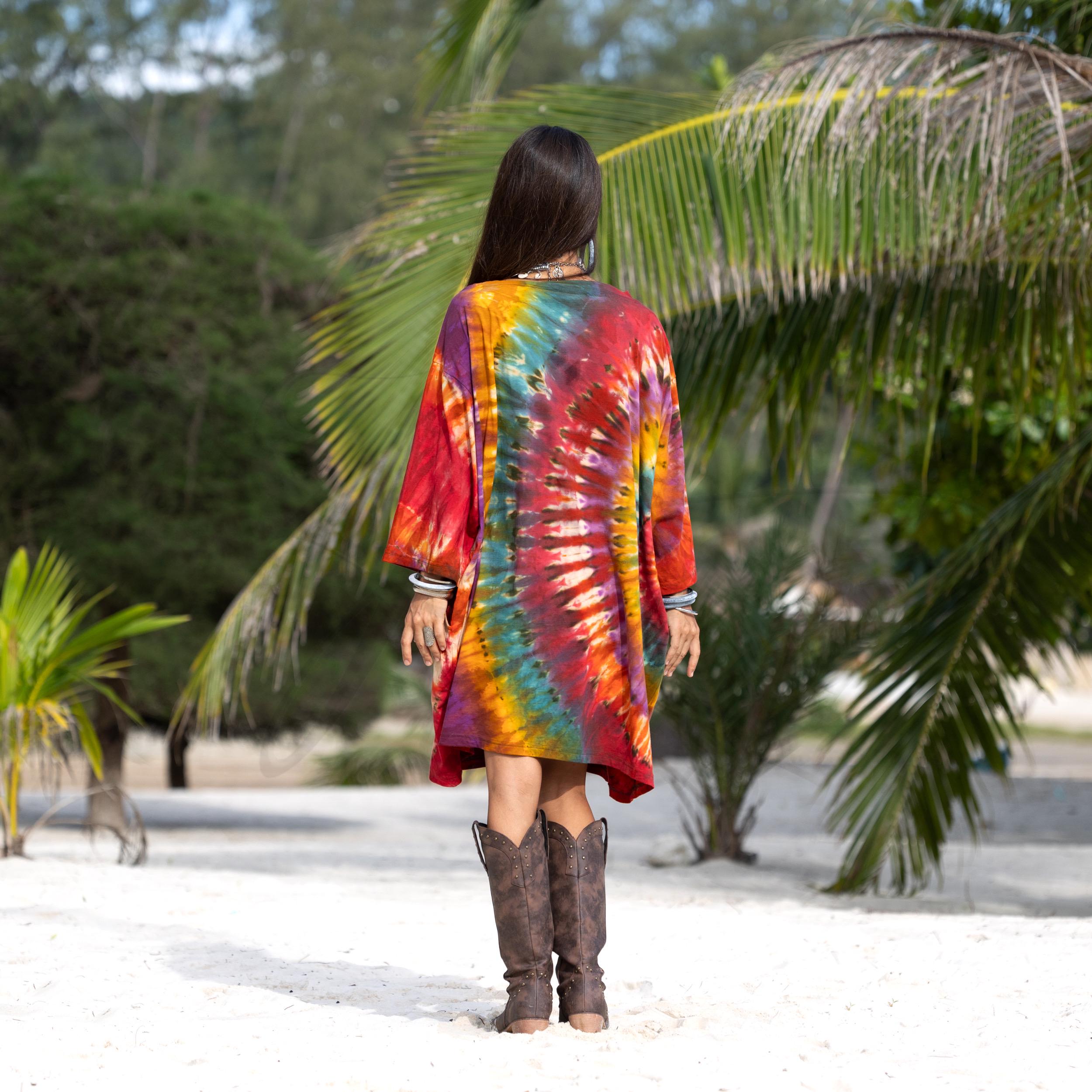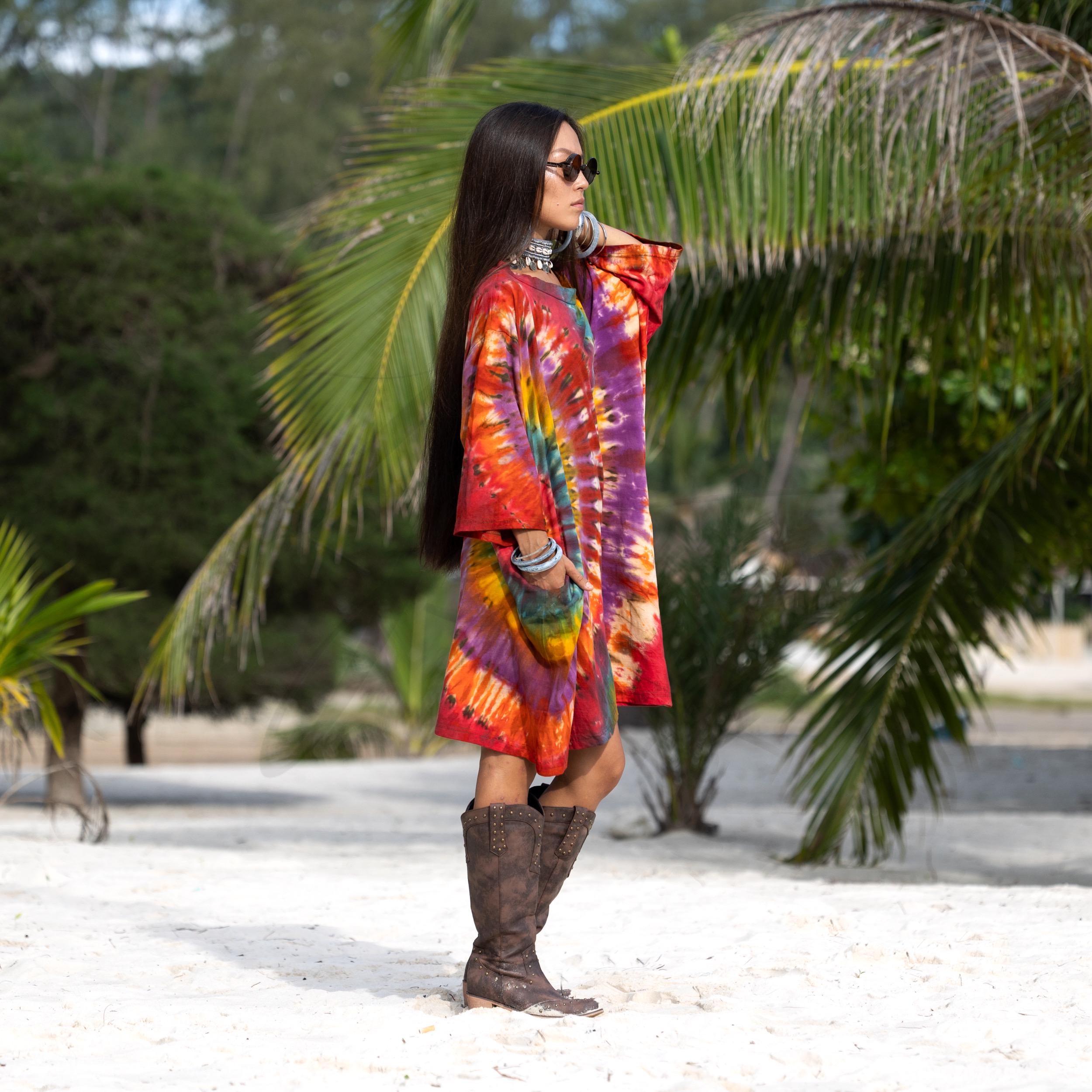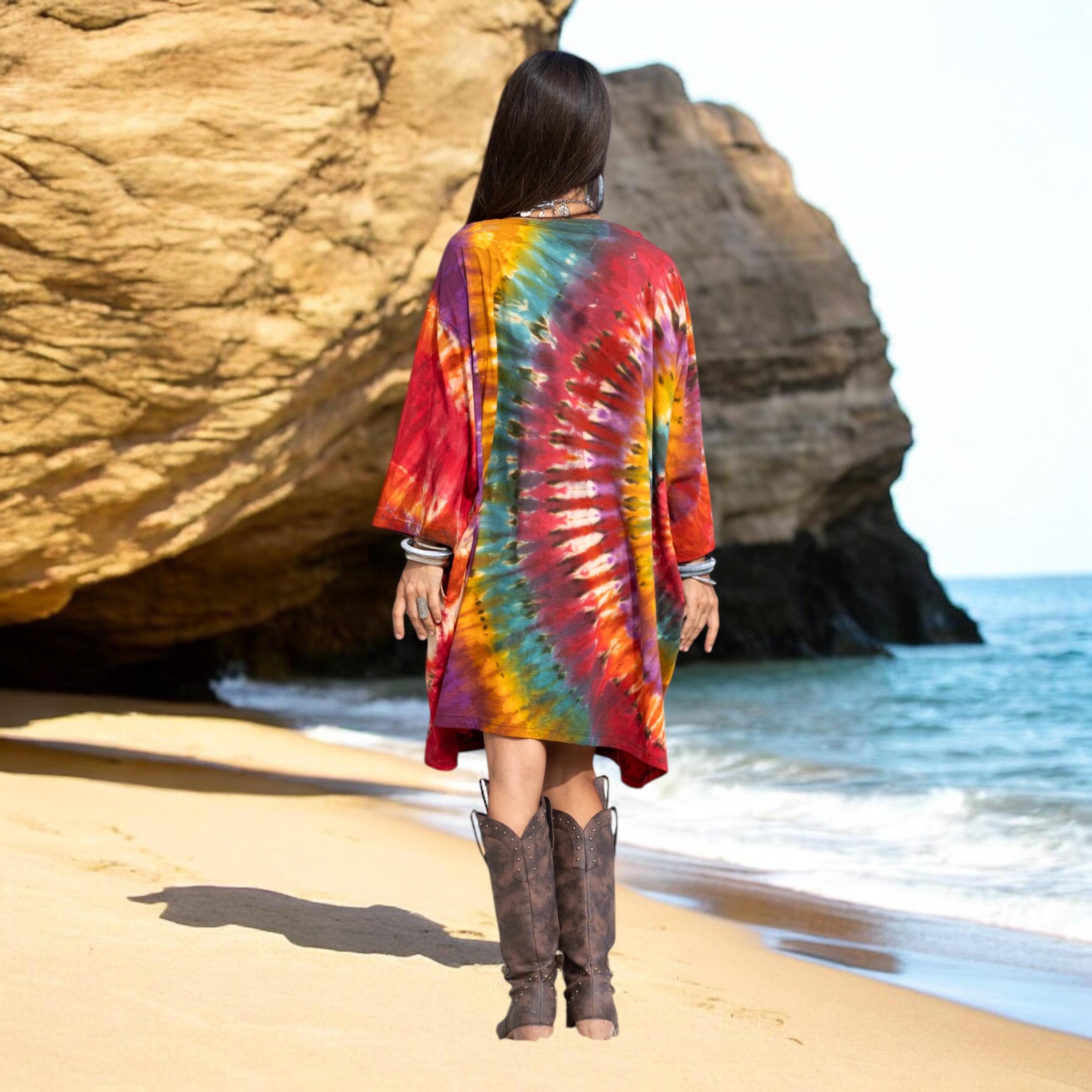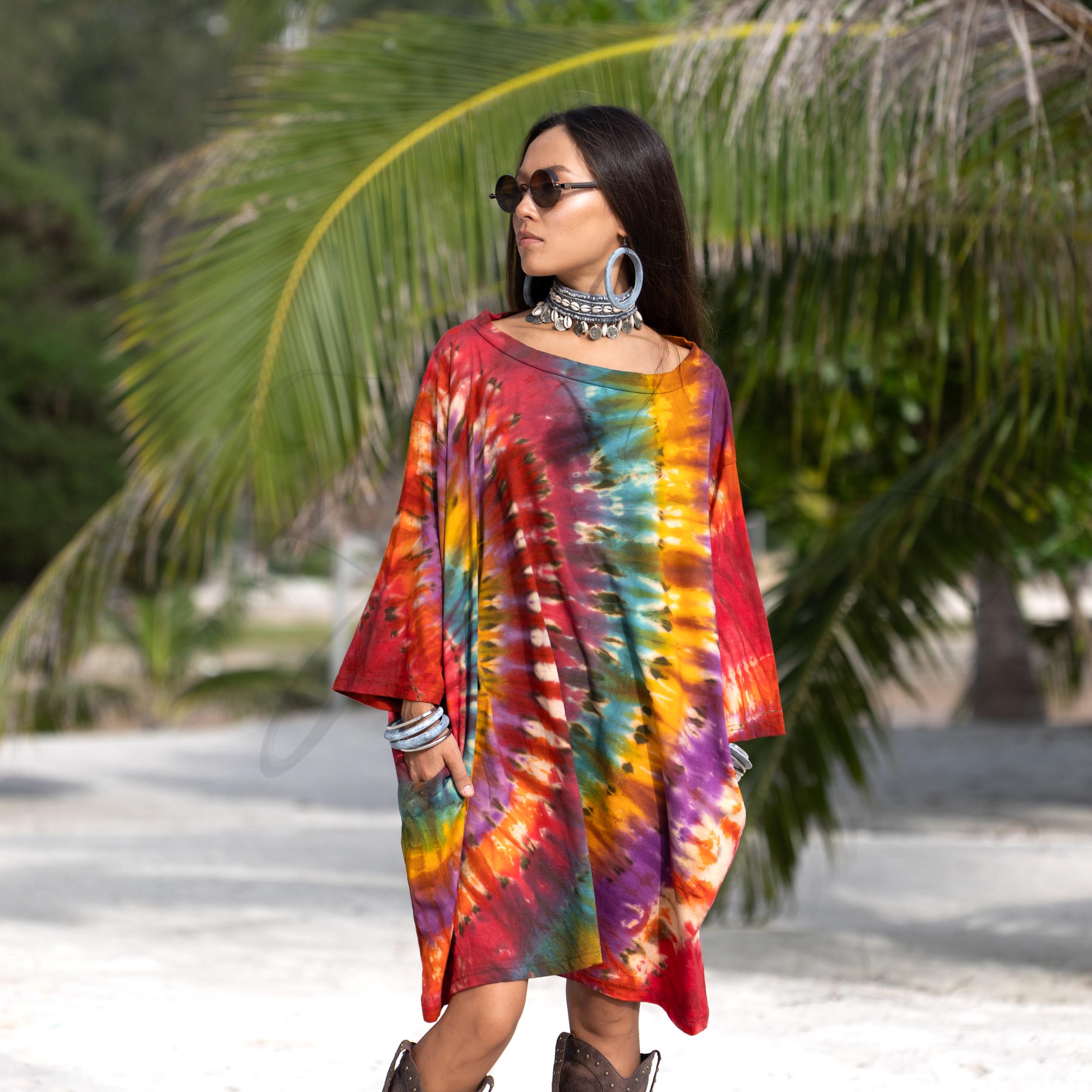 Designed in a relaxed boyfriend cut, this plus size boho tie dye shirt offers freedom of movement and soulful ease. Soft 100% cotton jersey drapes effortlessly as a tunic top or playful mini dress. Complete with deep side pockets and a wide boat neck, it’s perfect for festivals, beach days, and slow Sundays.