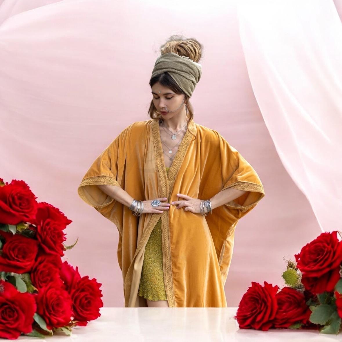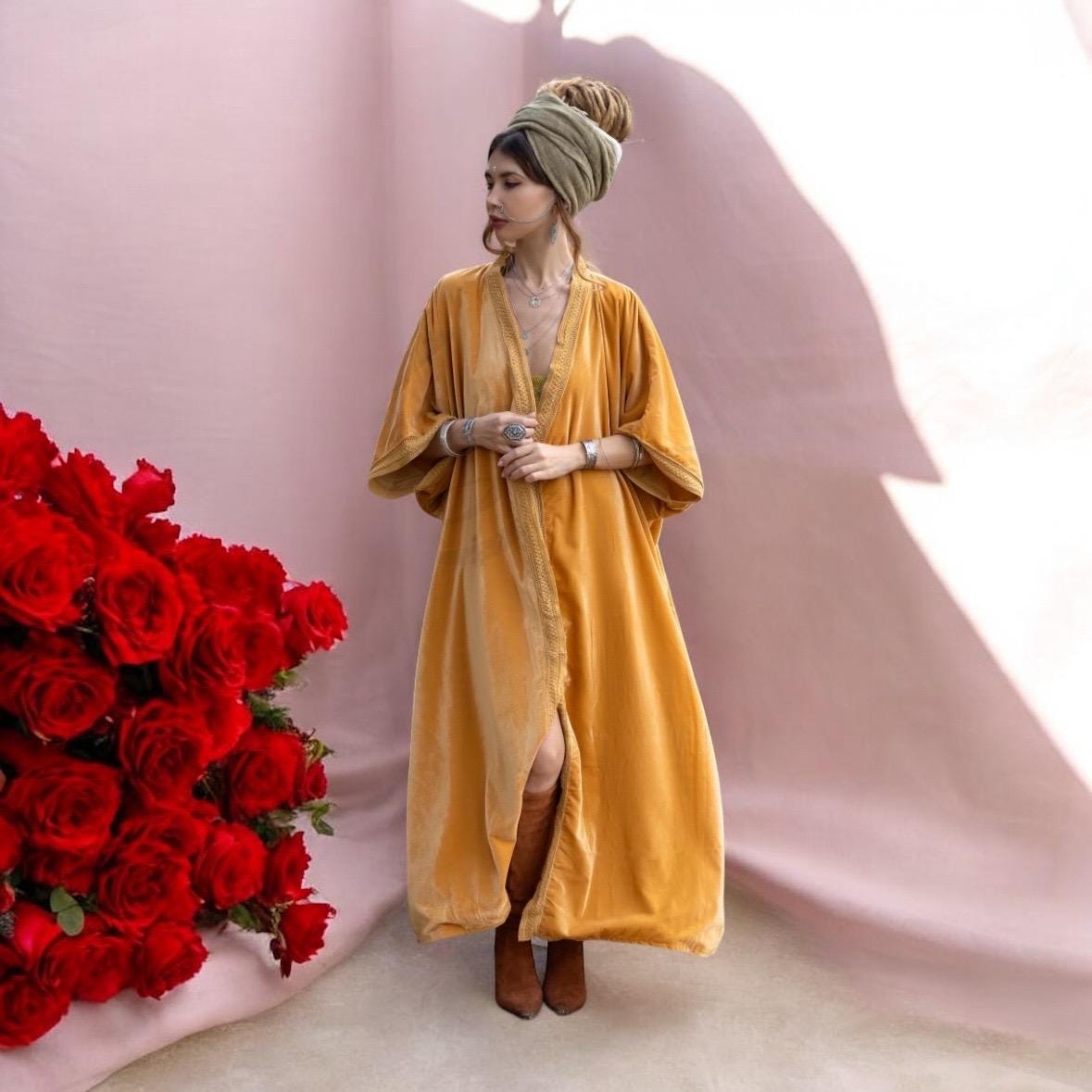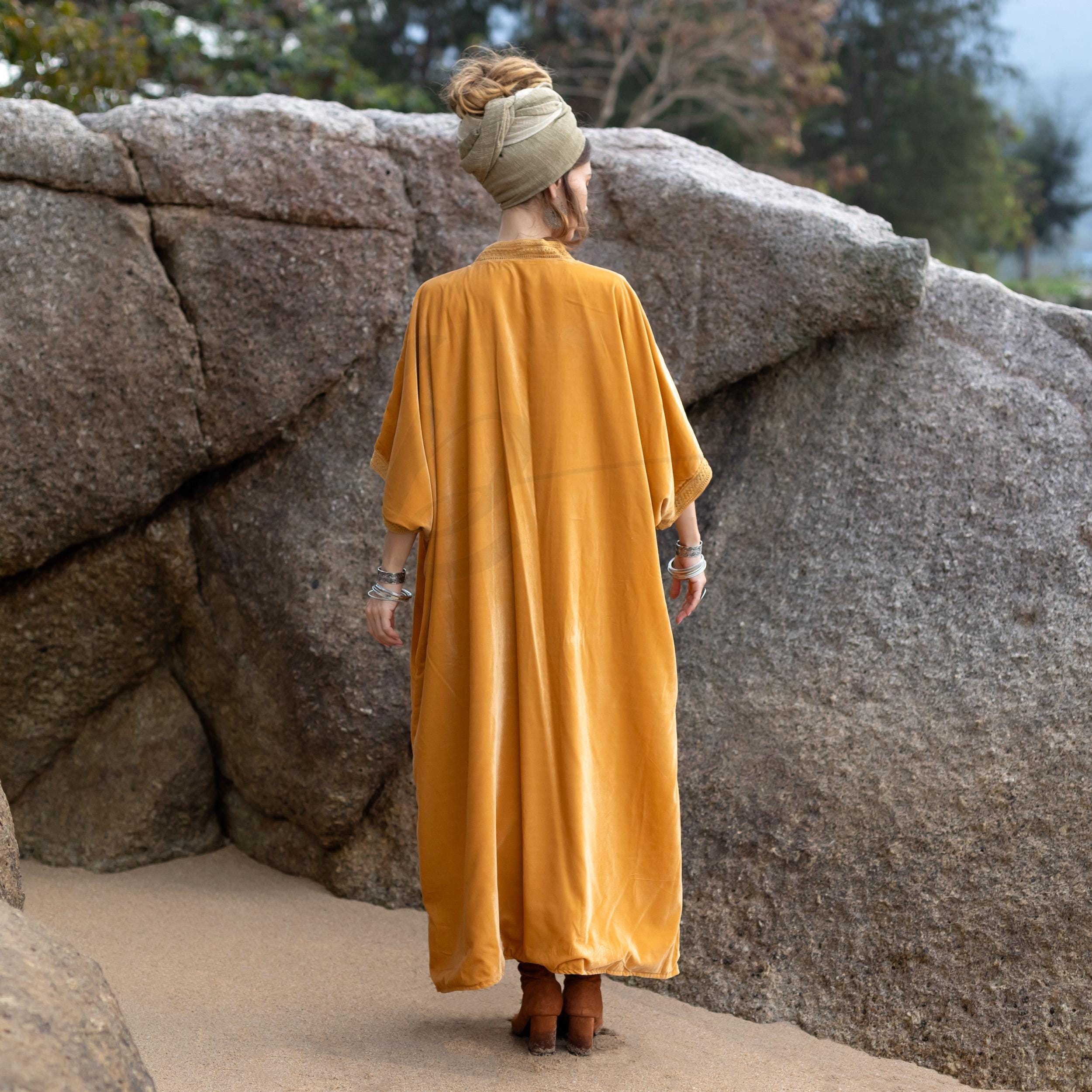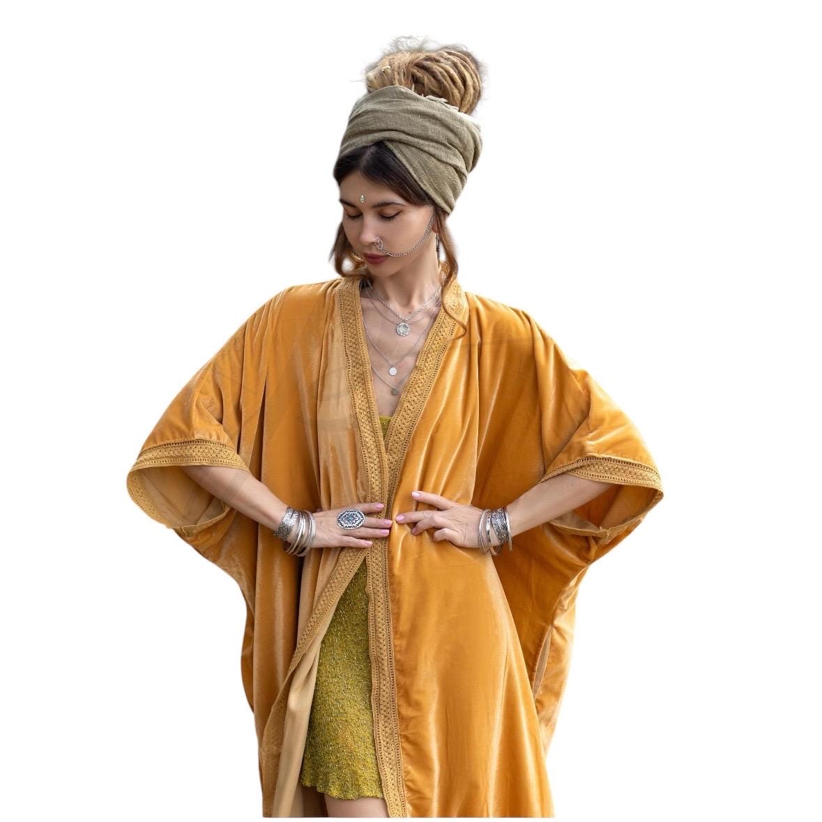 From elegant maxi-length velvet kimono wraps to festival-ready boho dusters, the Misty Lace Velvet Kimono Duster in Tuscan Gold is the perfect blend of artisanal craftsmanship, sustainable fashion, and vintage-inspired elegance. A must-have for any free-spirited wardrobe!