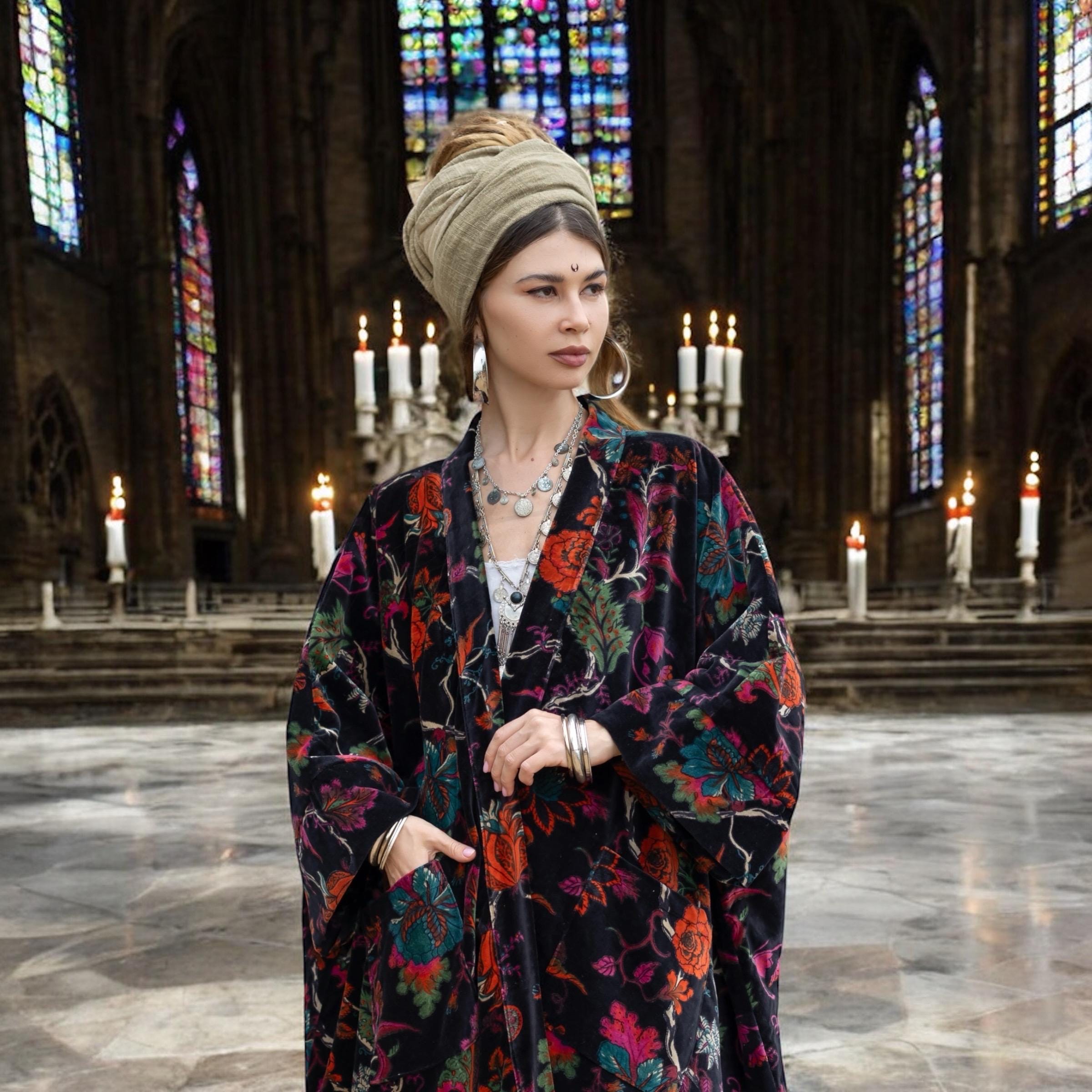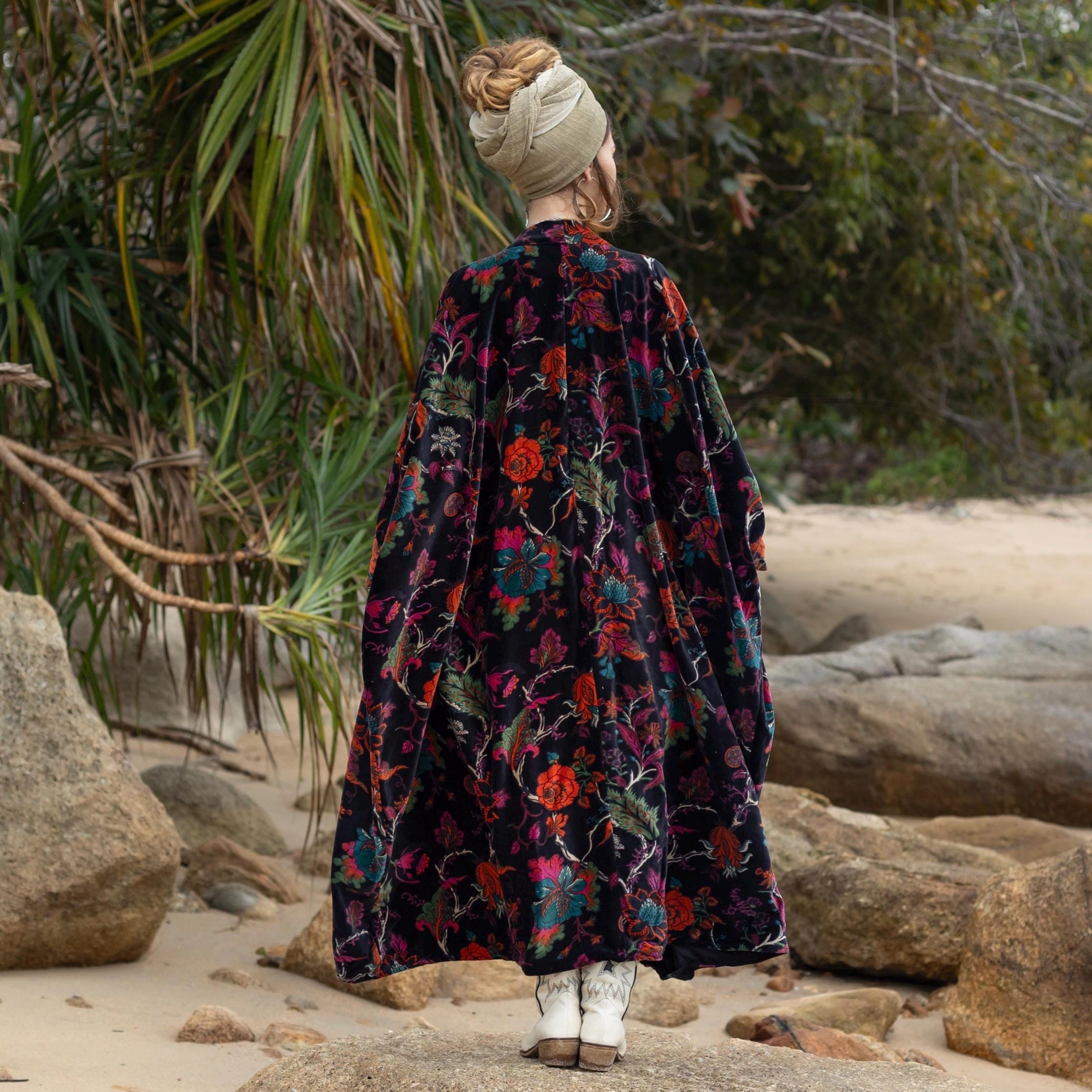 Wrap yourself in poetic luxury with the Harper Jade Velvet Kimono — a floor-length boho duster in the Midnight Flora colorway, blooming with mystery and grace. Handcrafted from premium cotton velvet, this statement robe blends vintage opulence with effortless wearability.